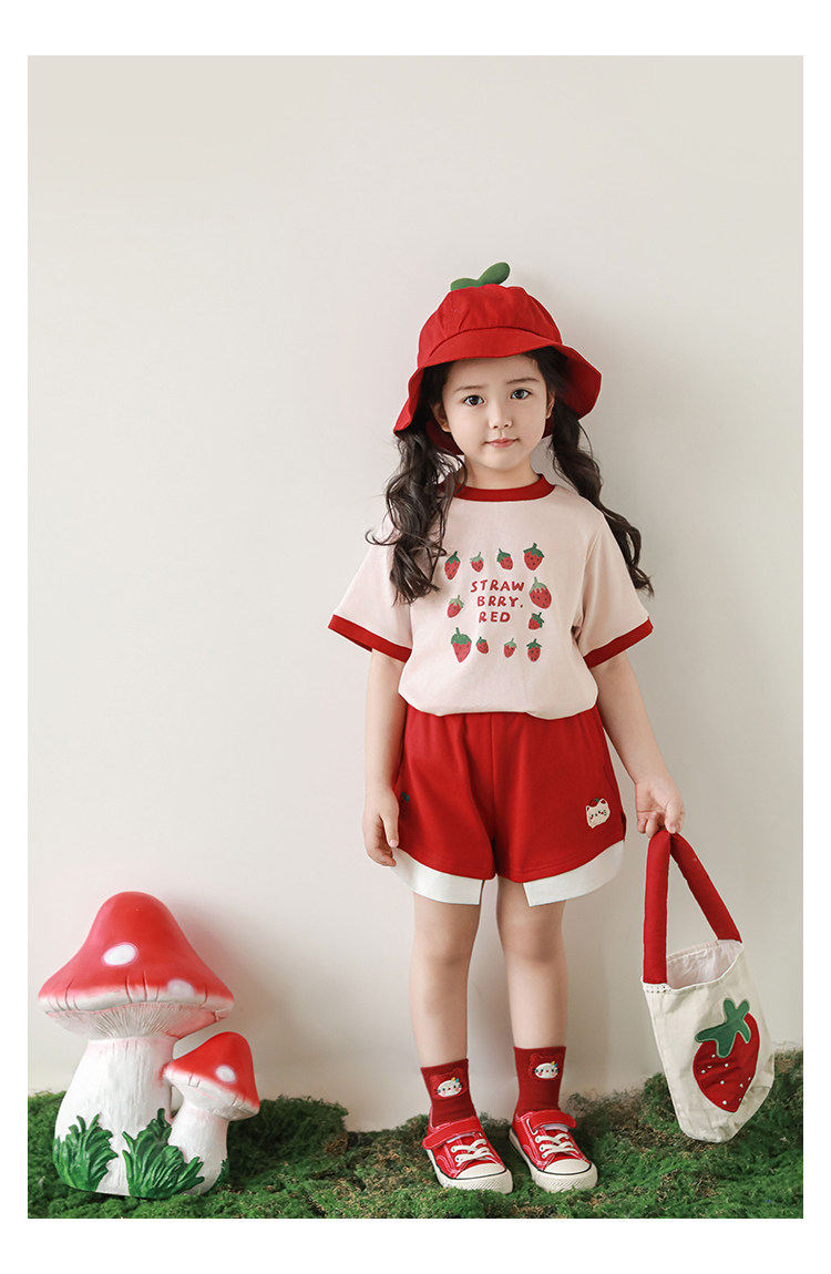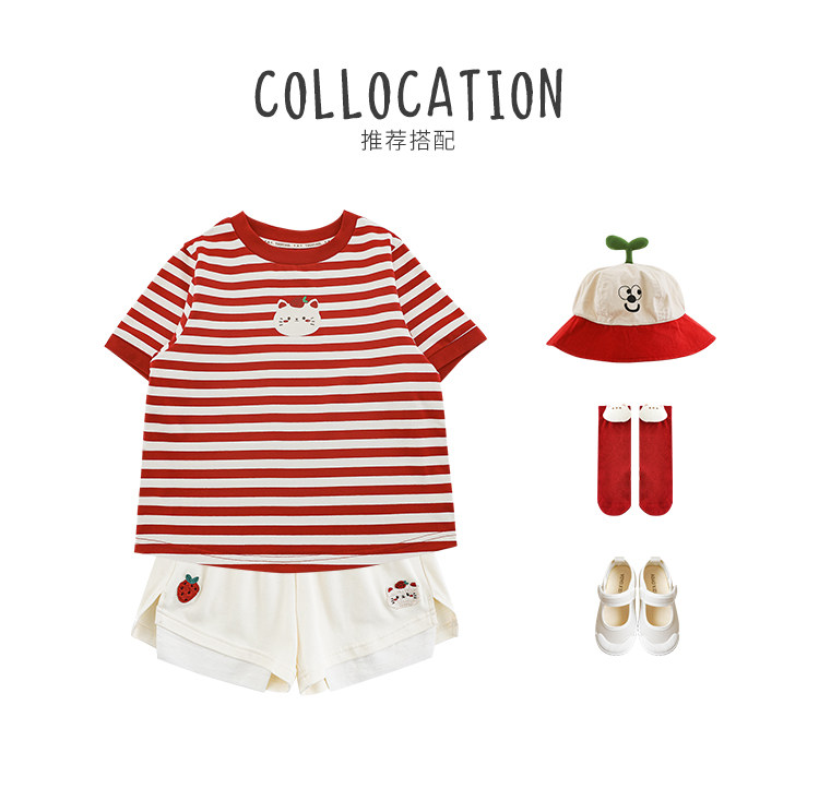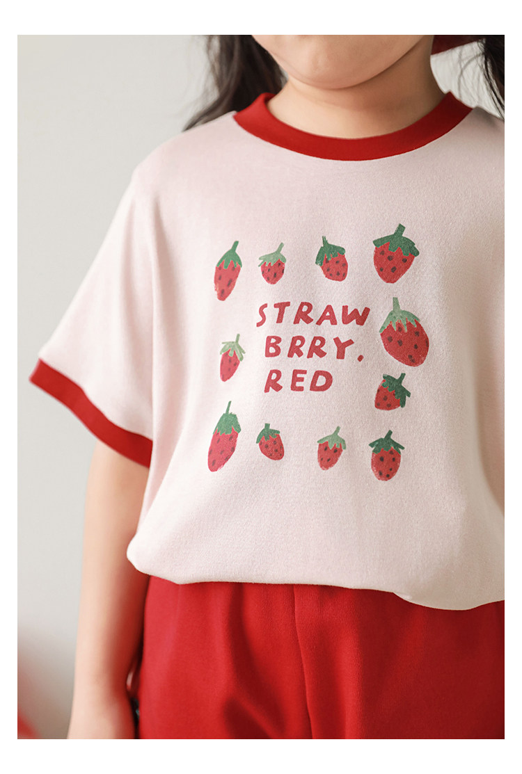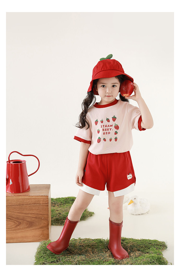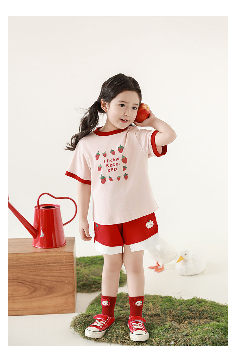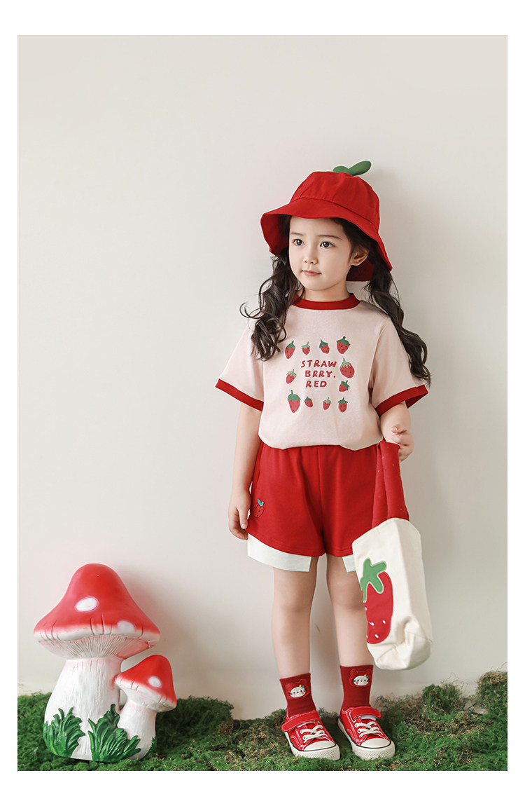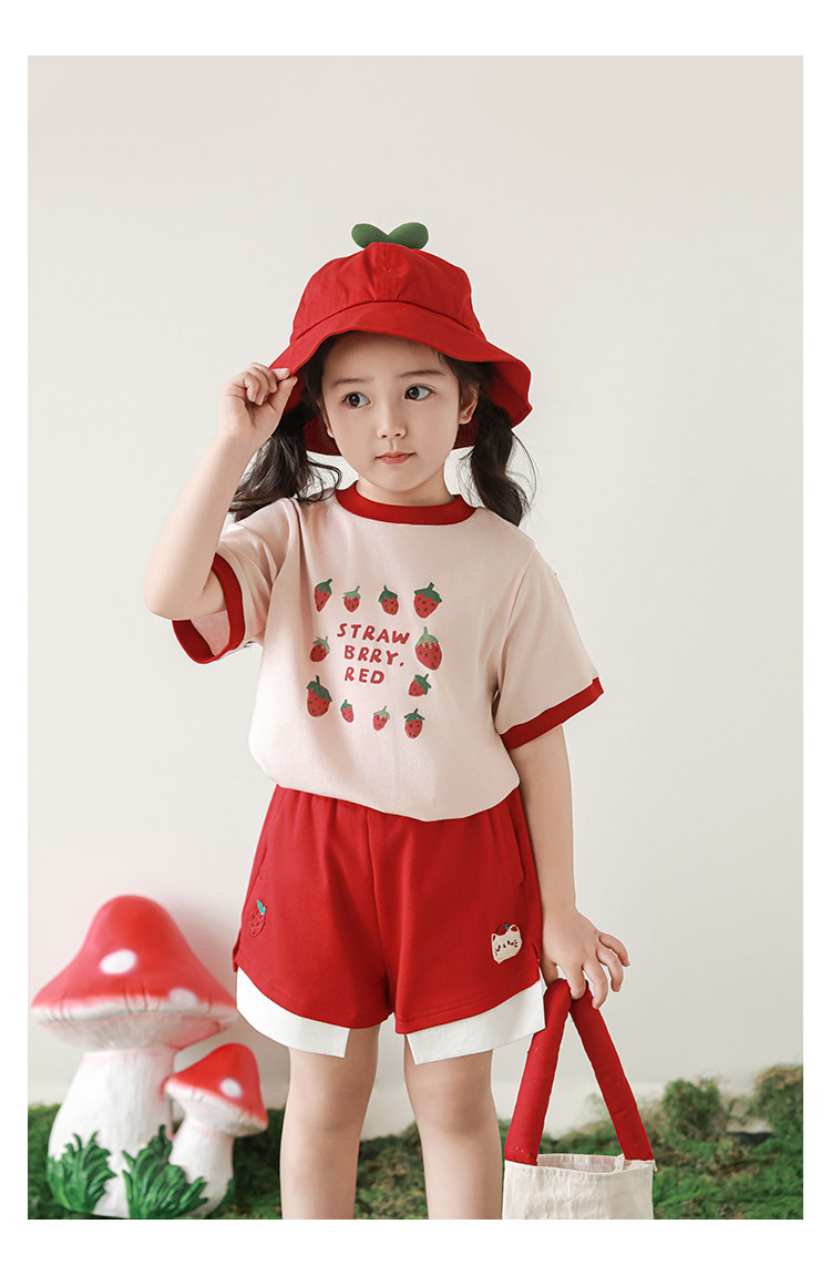 Wuri Boo 소녀 고양이 딸기 시리즈 2025 여름 시원한 느슨한 반팔 티셔츠 자수 반바지 세트