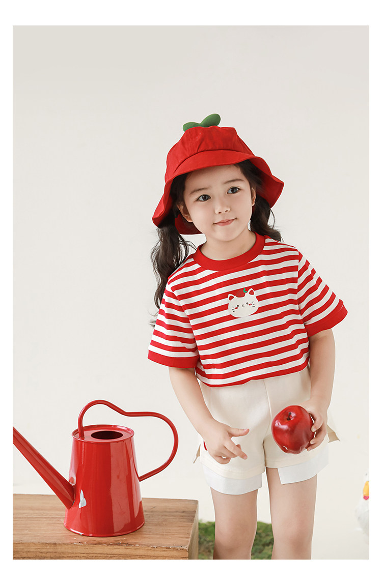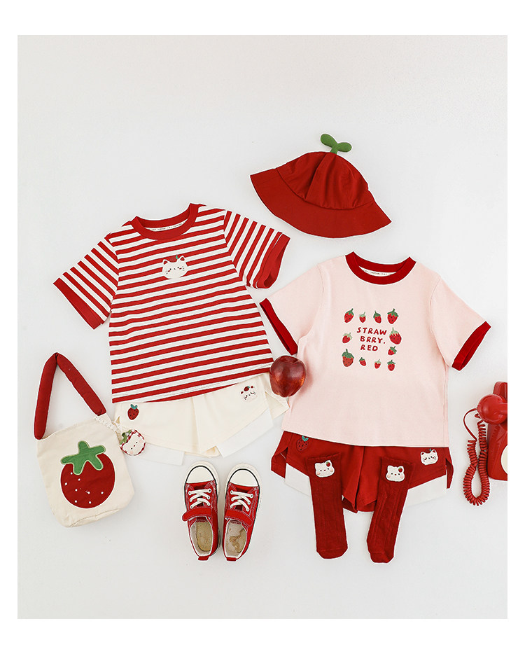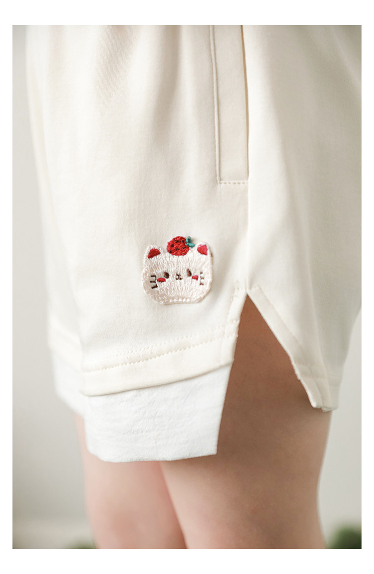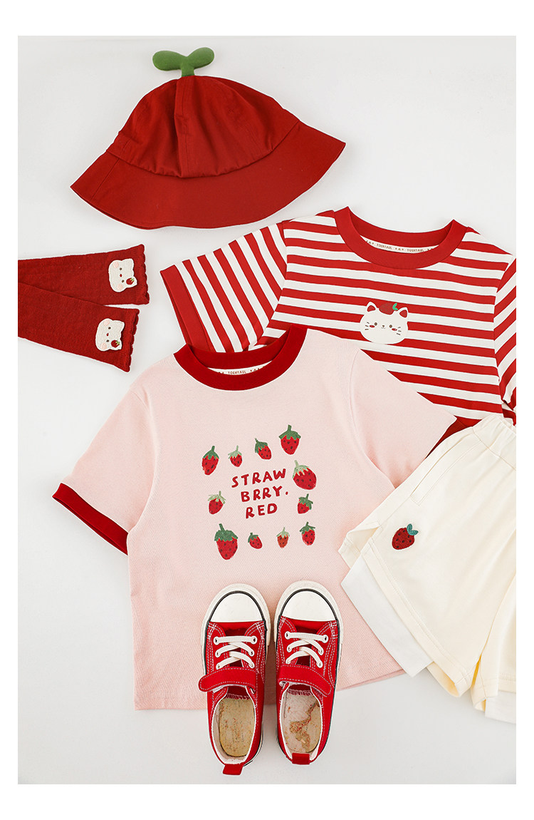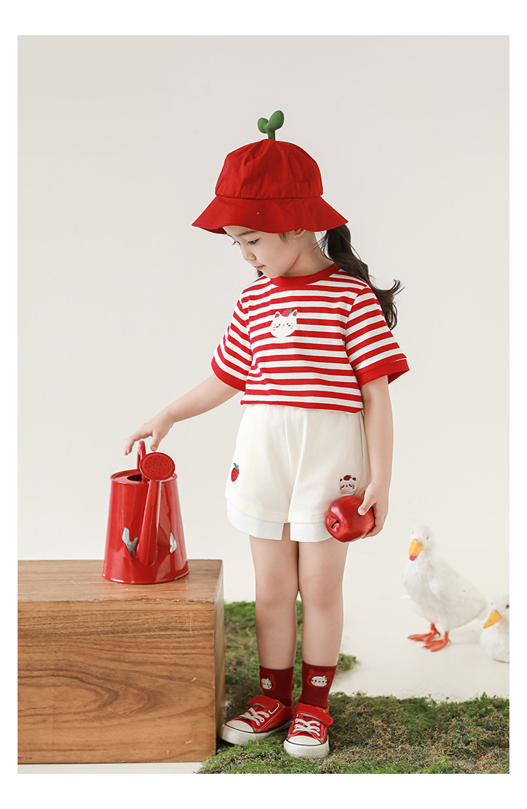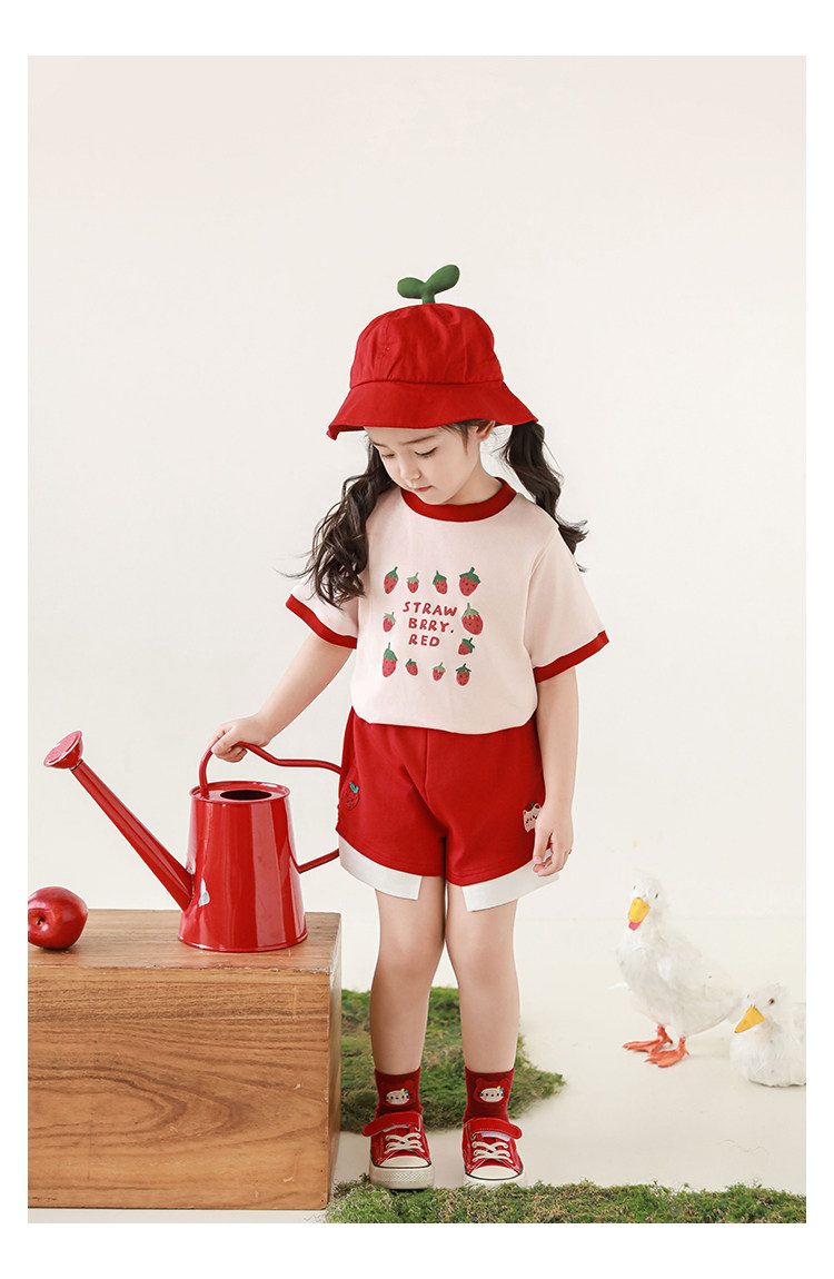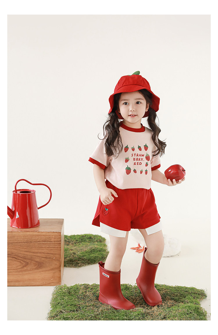Wuri Boo 소녀 고양이 딸기 시리즈 2025 여름 시원한 느슨한 반팔 티셔츠 자수 반바지 세트