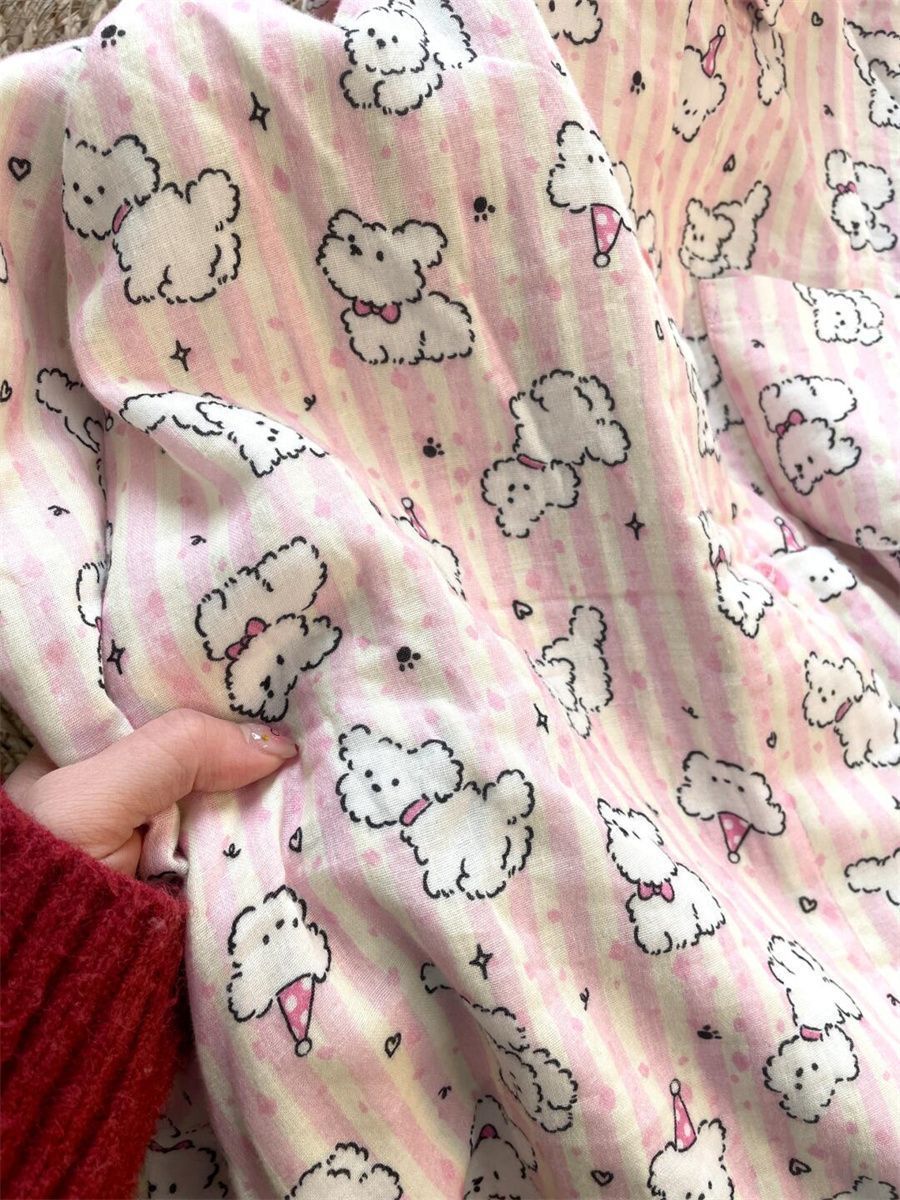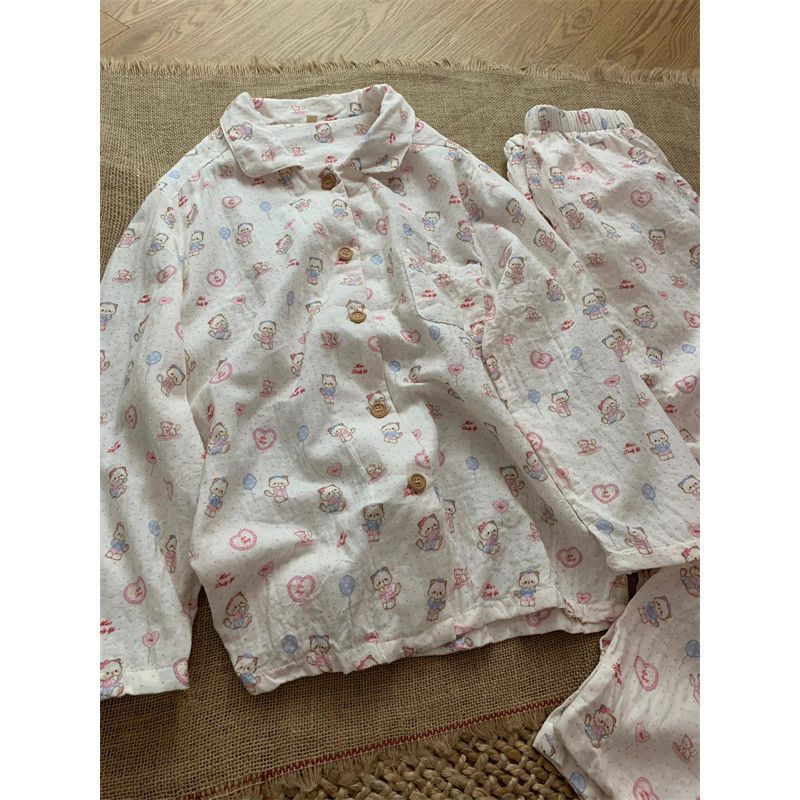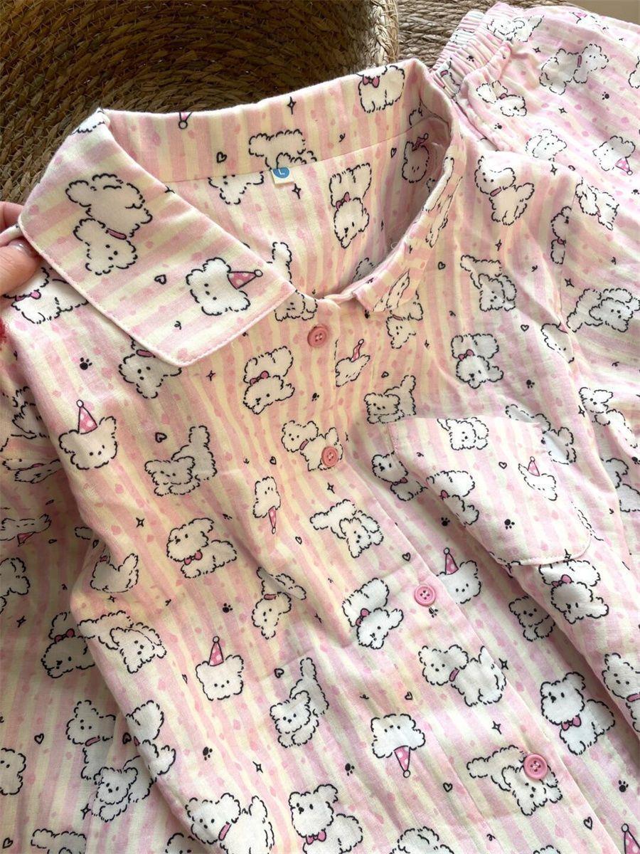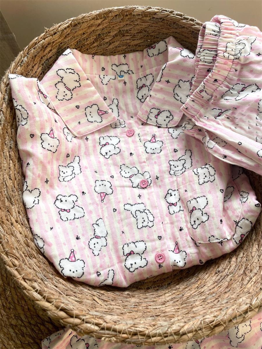 달콤한 간단한 파우더 스트라이프 라인 개 잠옷 여성의 봄과 가을 새로운 긴 소매 바지 학생 홈 의류 투피스 세트