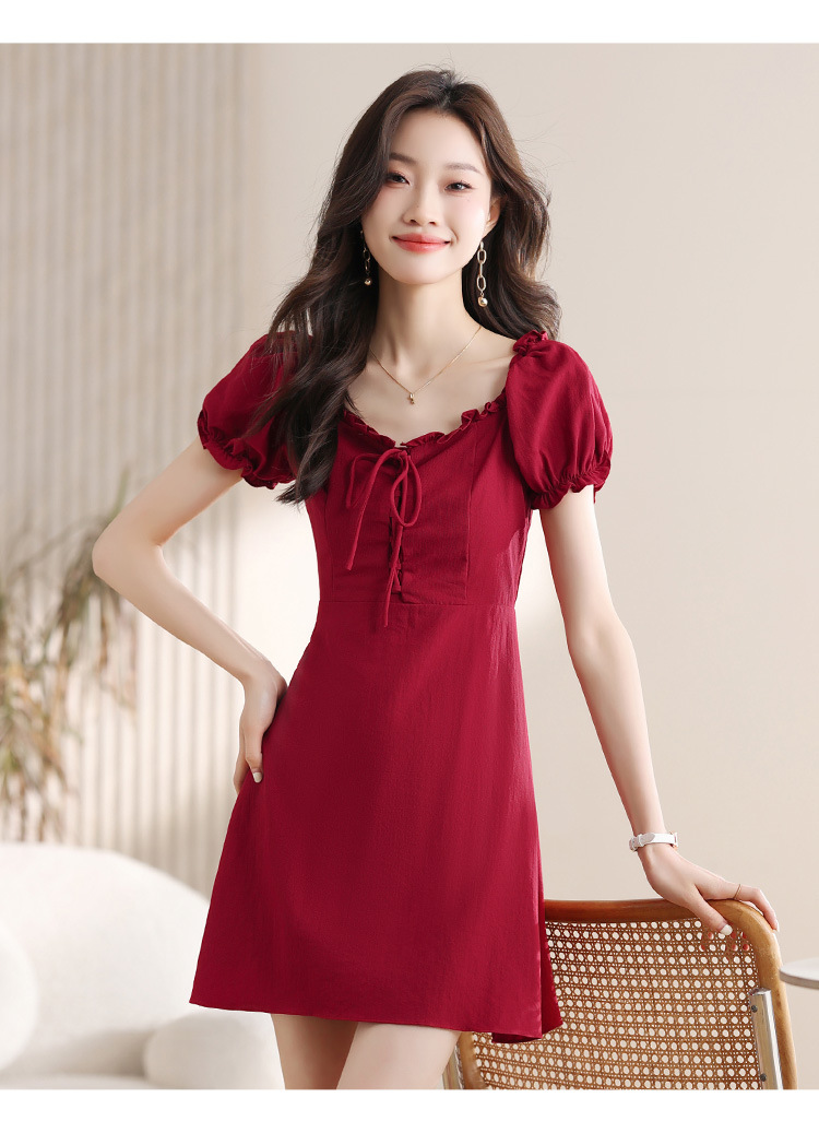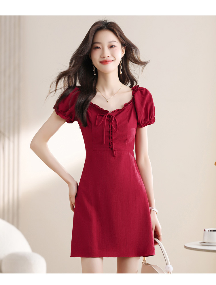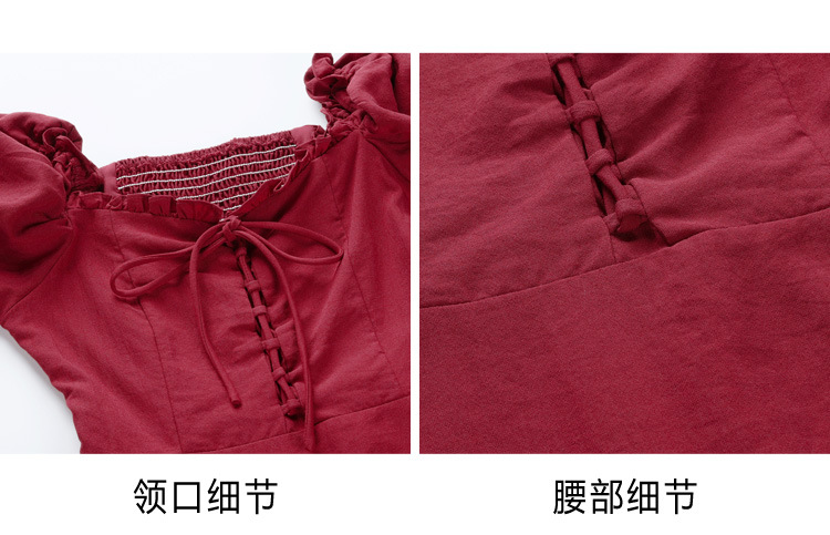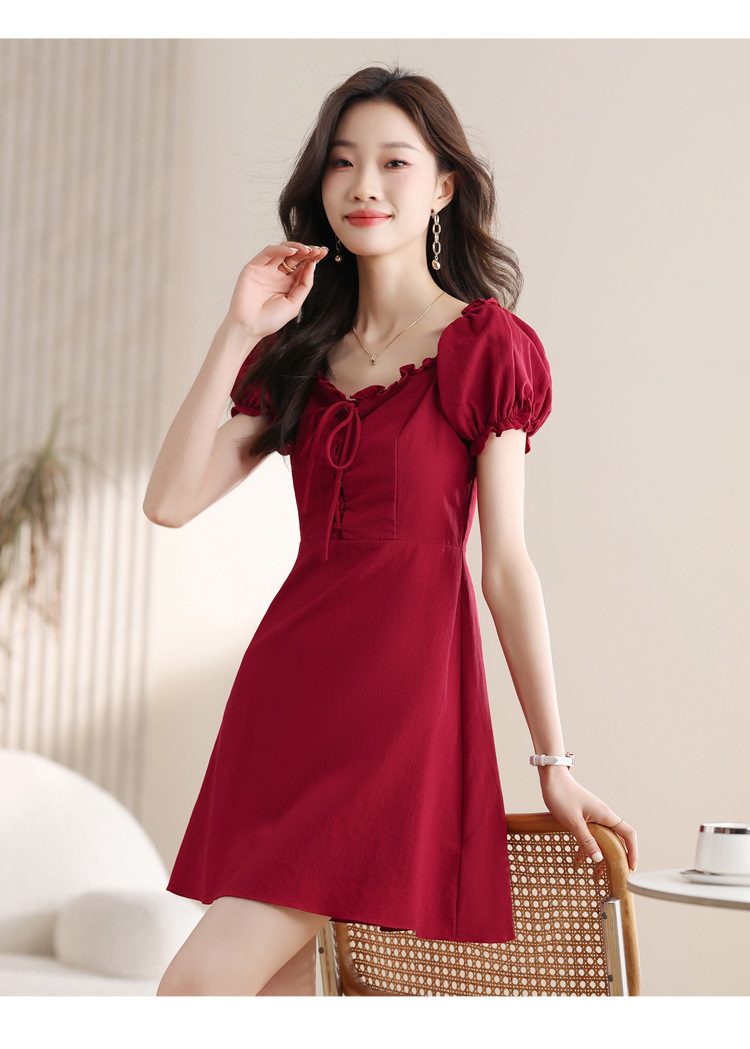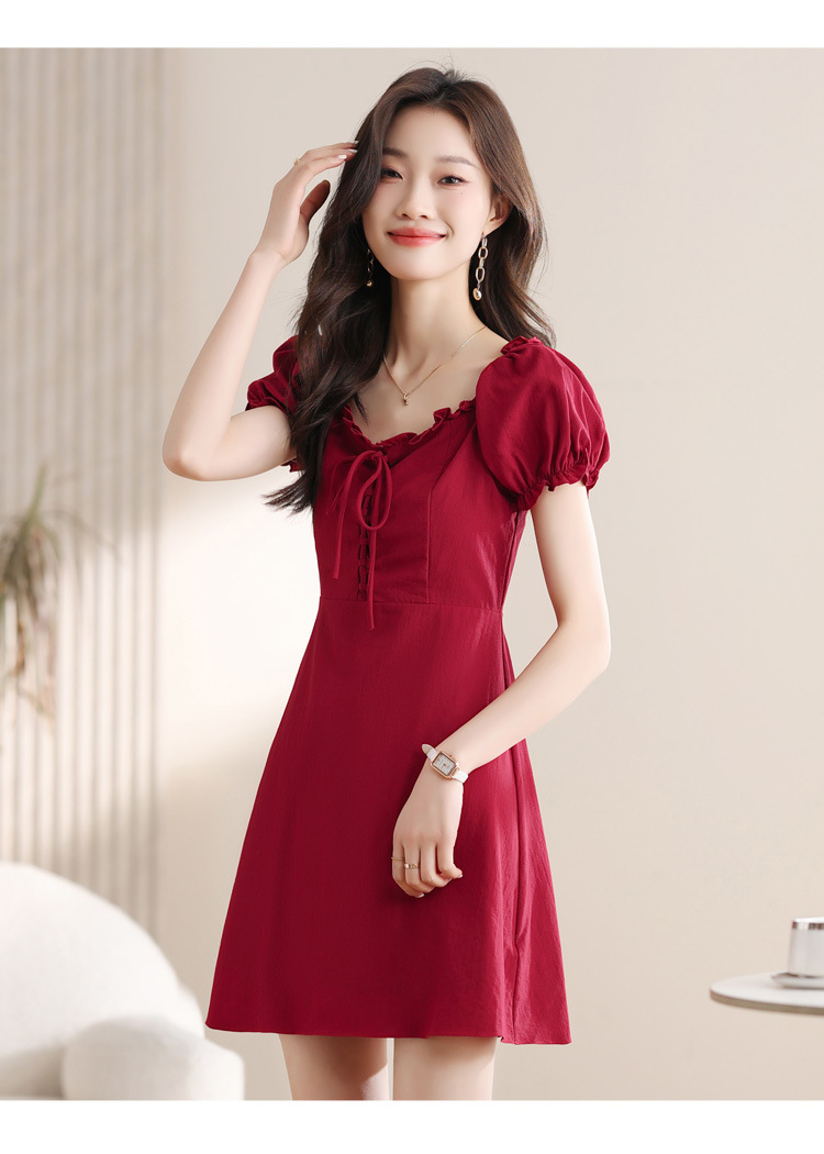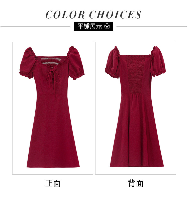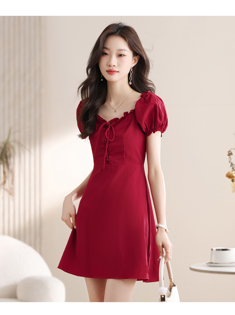 스퀘어 칼라 퍼프 슬리브 원피스 여성 여름 플라티코돈 프랑스 디자인 허리 라인 슬리밍 레드 A-라인 스커트