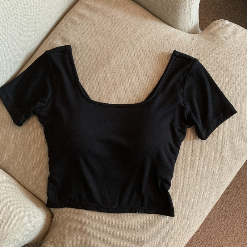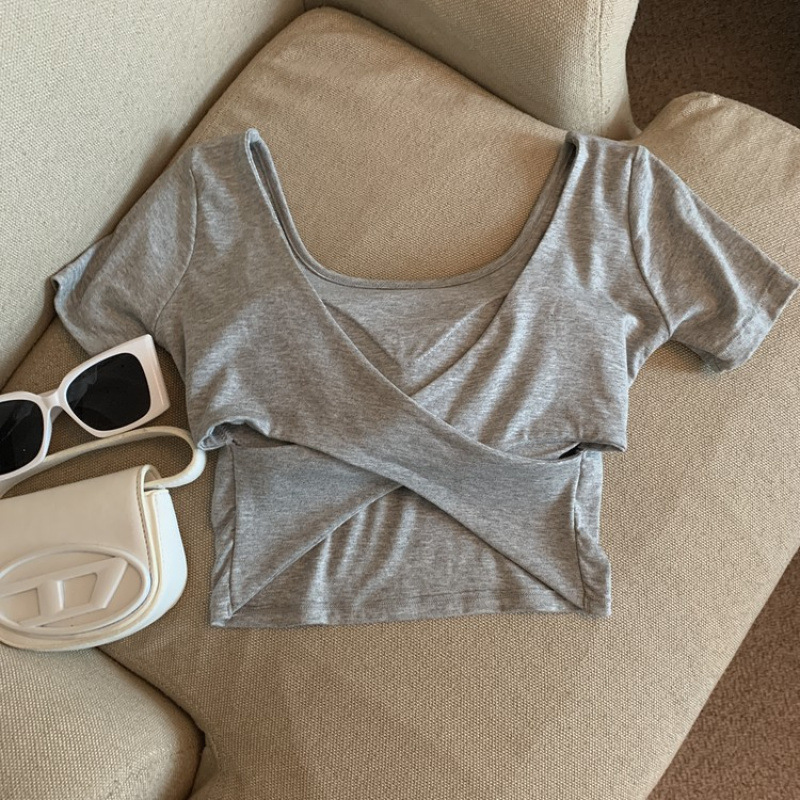 솔리드 컬러 숄더 스퀘어 칼라 반팔 셔츠 여성 여름 디자인 센스 크로스 백 뷰티 스트랩 가슴 패드 슬림 핏 쇼트 탑스토어 가기