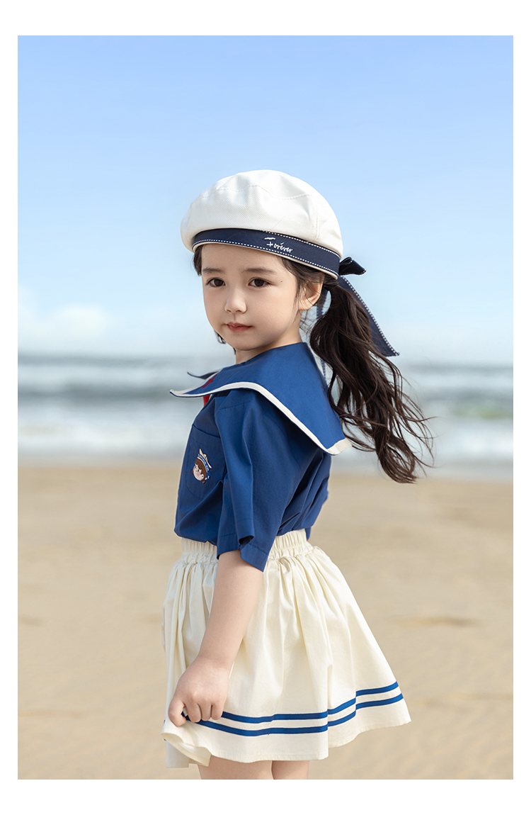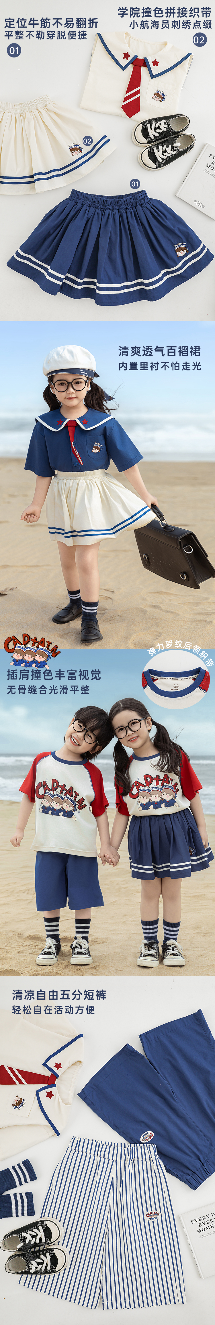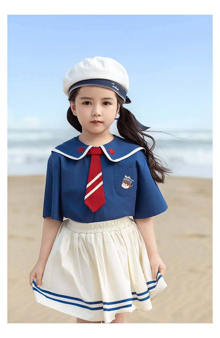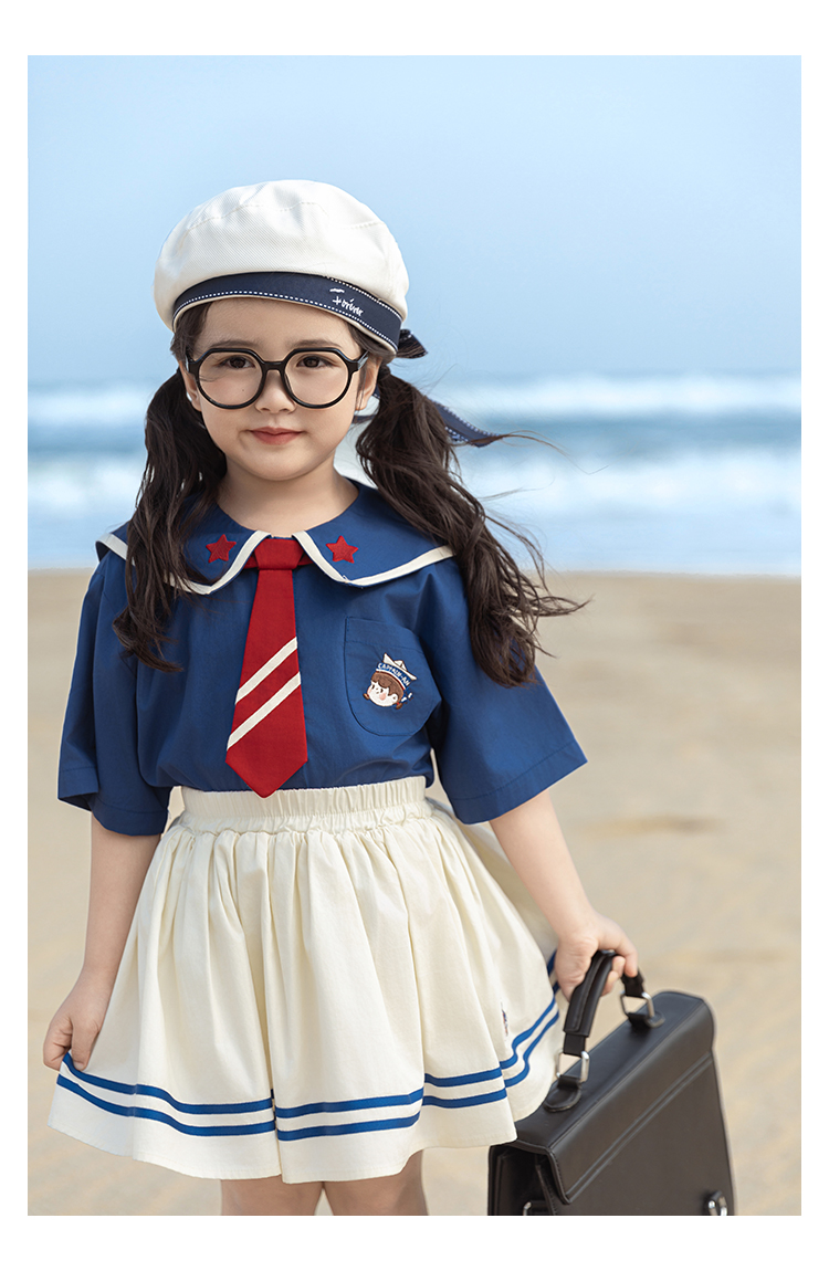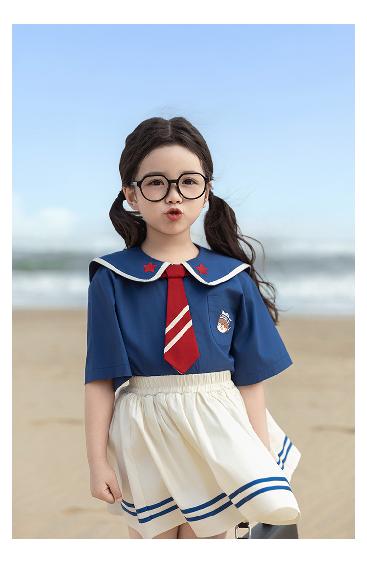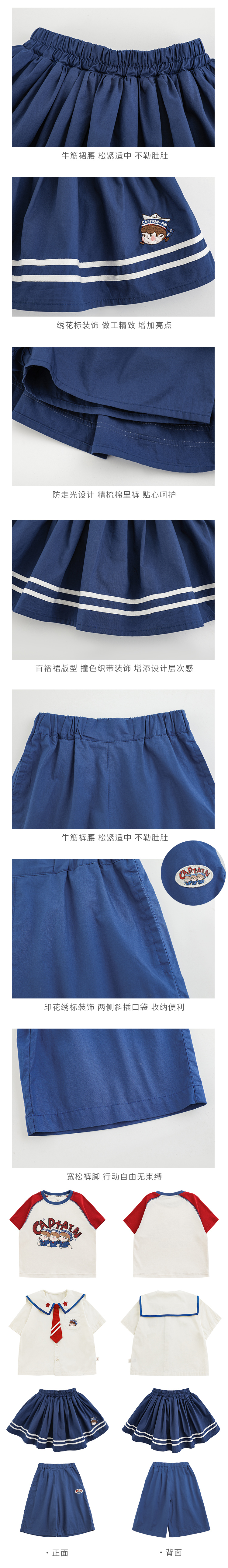 Wulibuyi Girls 네이비 스타일 An'an 시리즈 여름 상큼한 플리츠 스커트 대비 색상 반팔 티셔츠 셔츠 바지