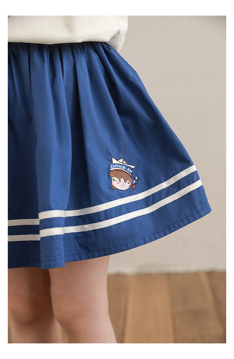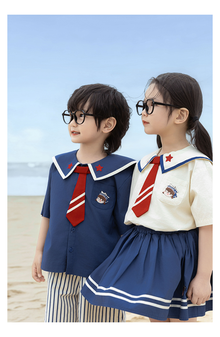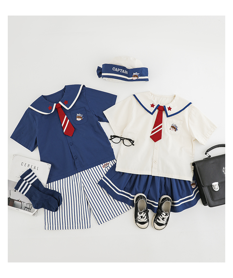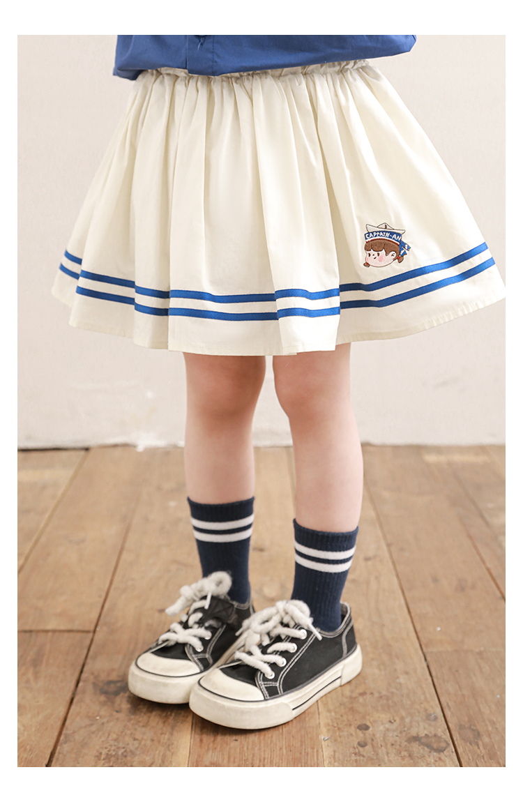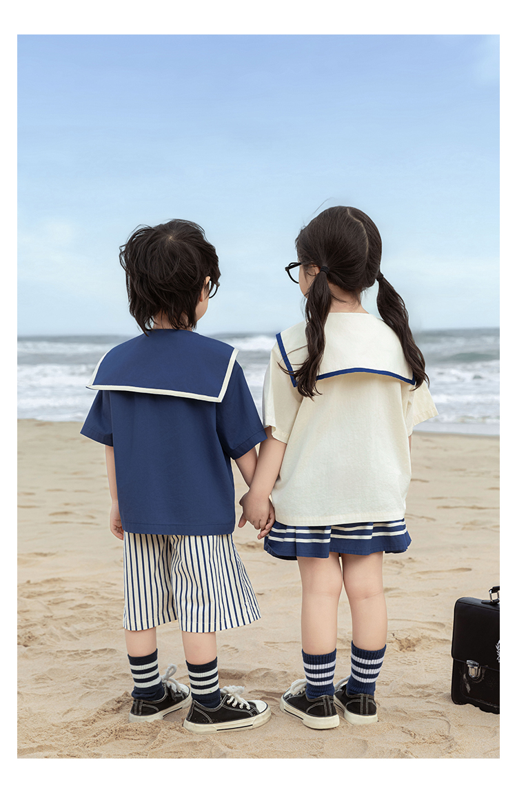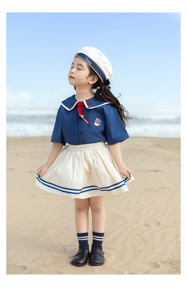 Wulibuyi Girls 네이비 스타일 An'an 시리즈 여름 상큼한 플리츠 스커트 대비 색상 반팔 티셔츠 셔츠 바지