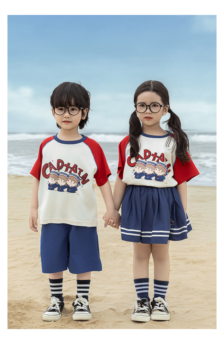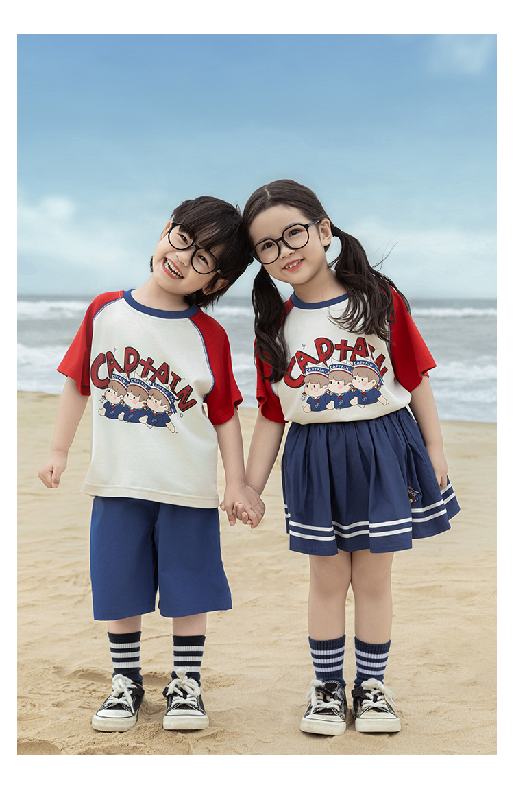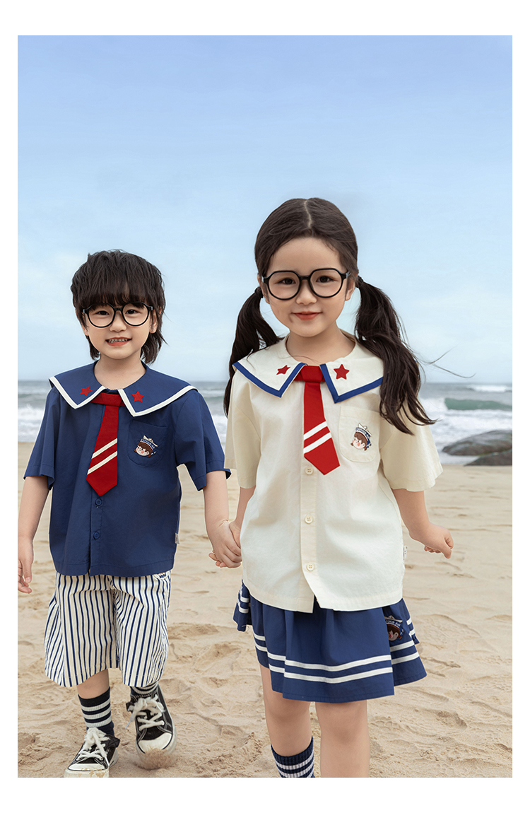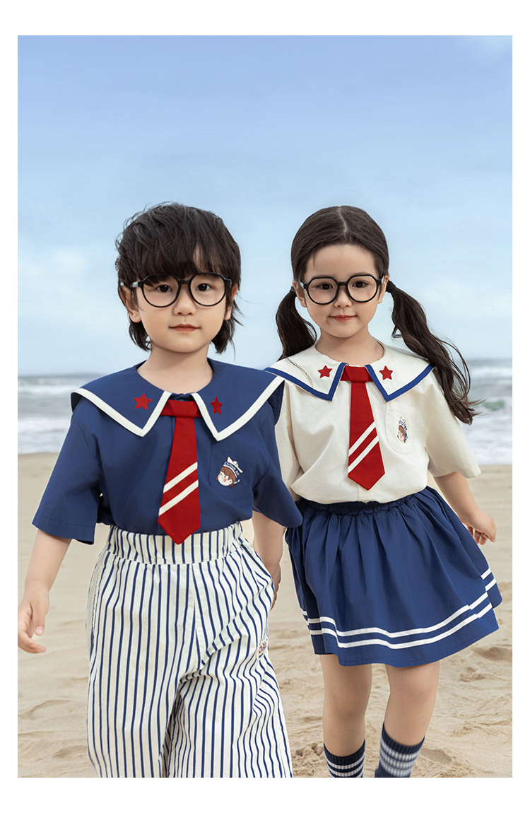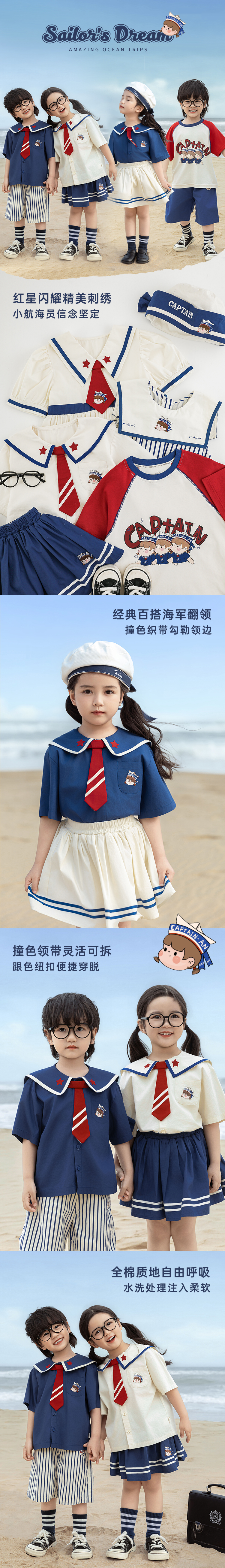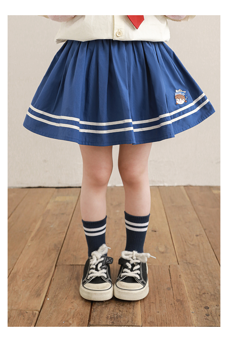 Wulibuyi Girls 네이비 스타일 An'an 시리즈 여름 상큼한 플리츠 스커트 대비 색상 반팔 티셔츠 셔츠 바지