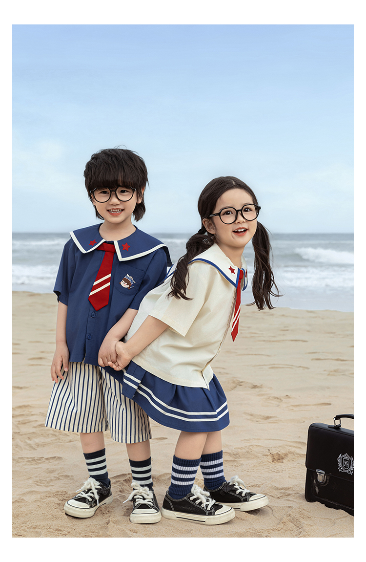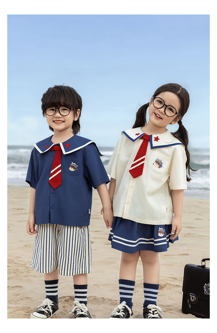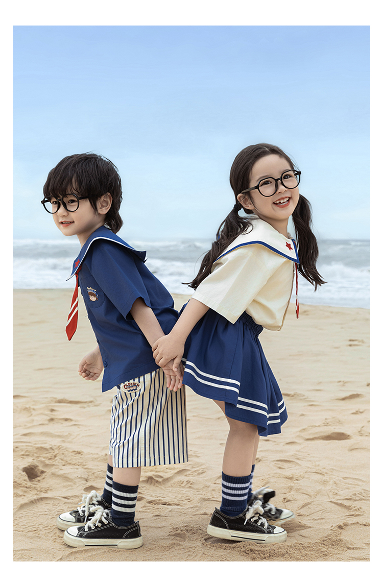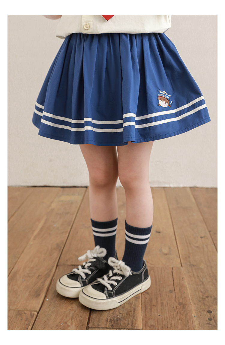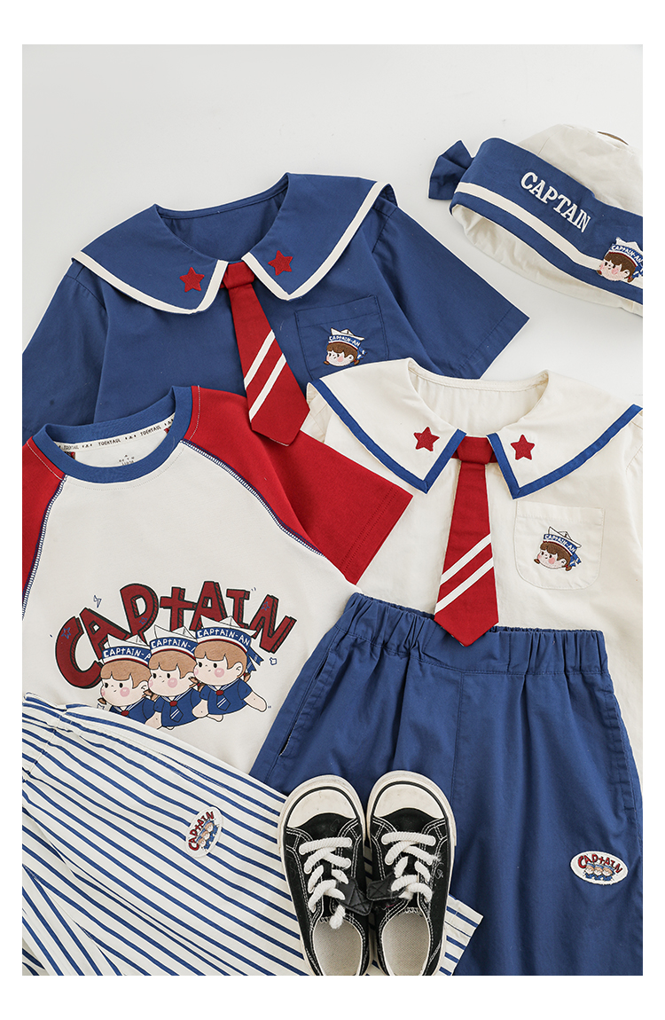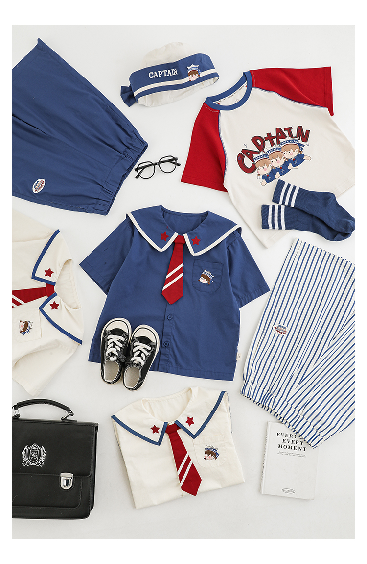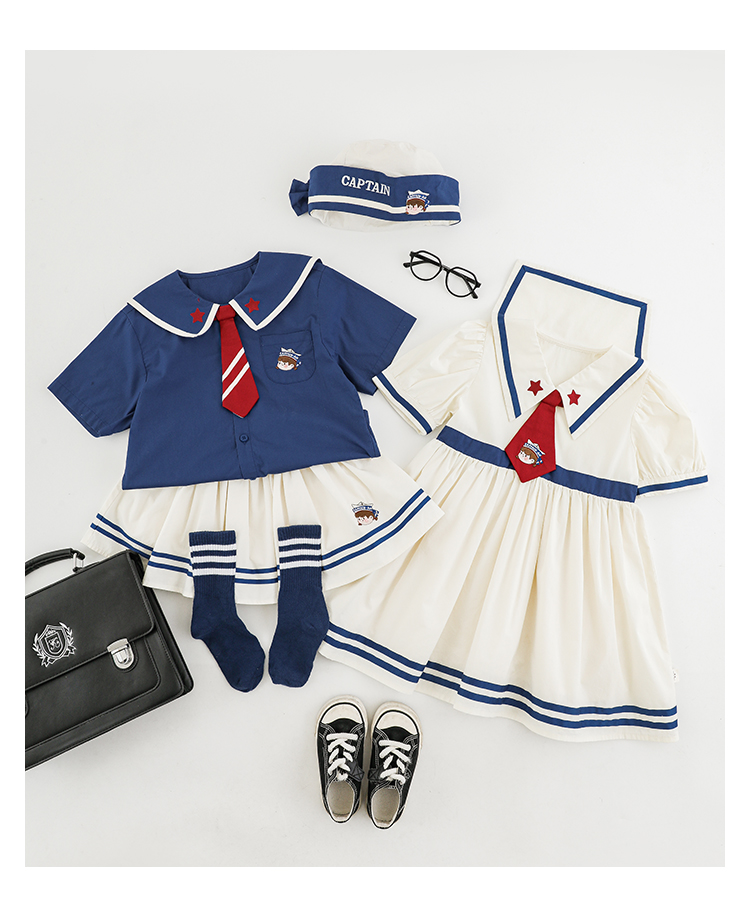 Wulibuyi Girls 네이비 스타일 An'an 시리즈 여름 상큼한 플리츠 스커트 대비 색상 반팔 티셔츠 셔츠 바지