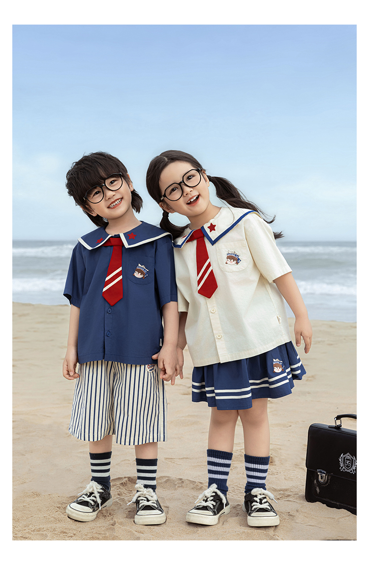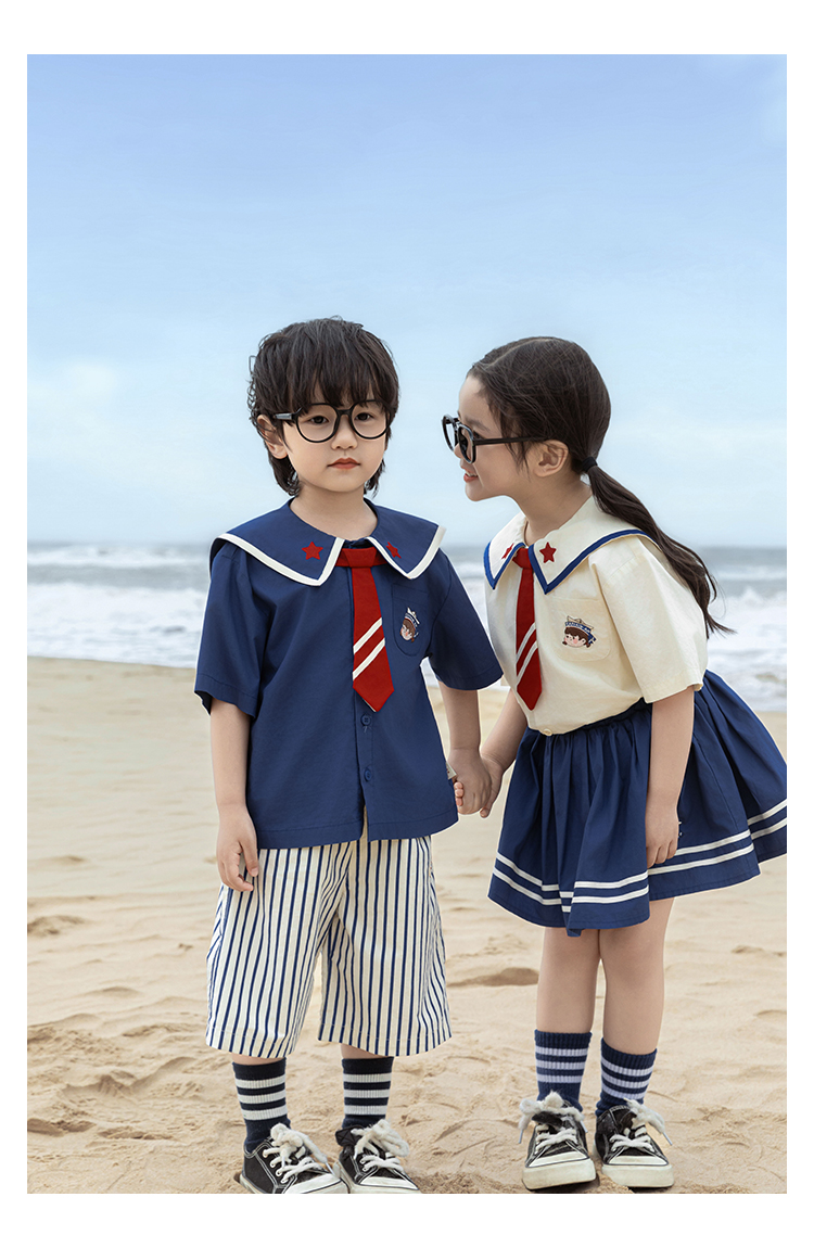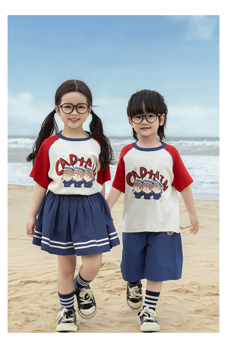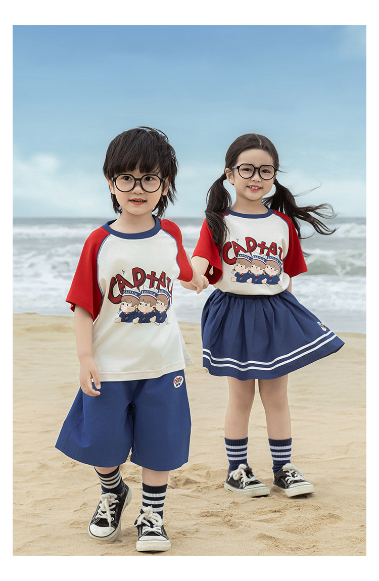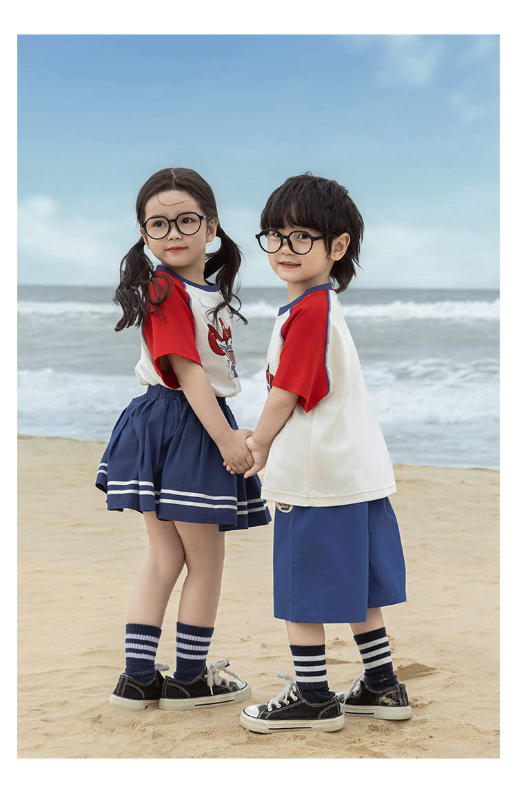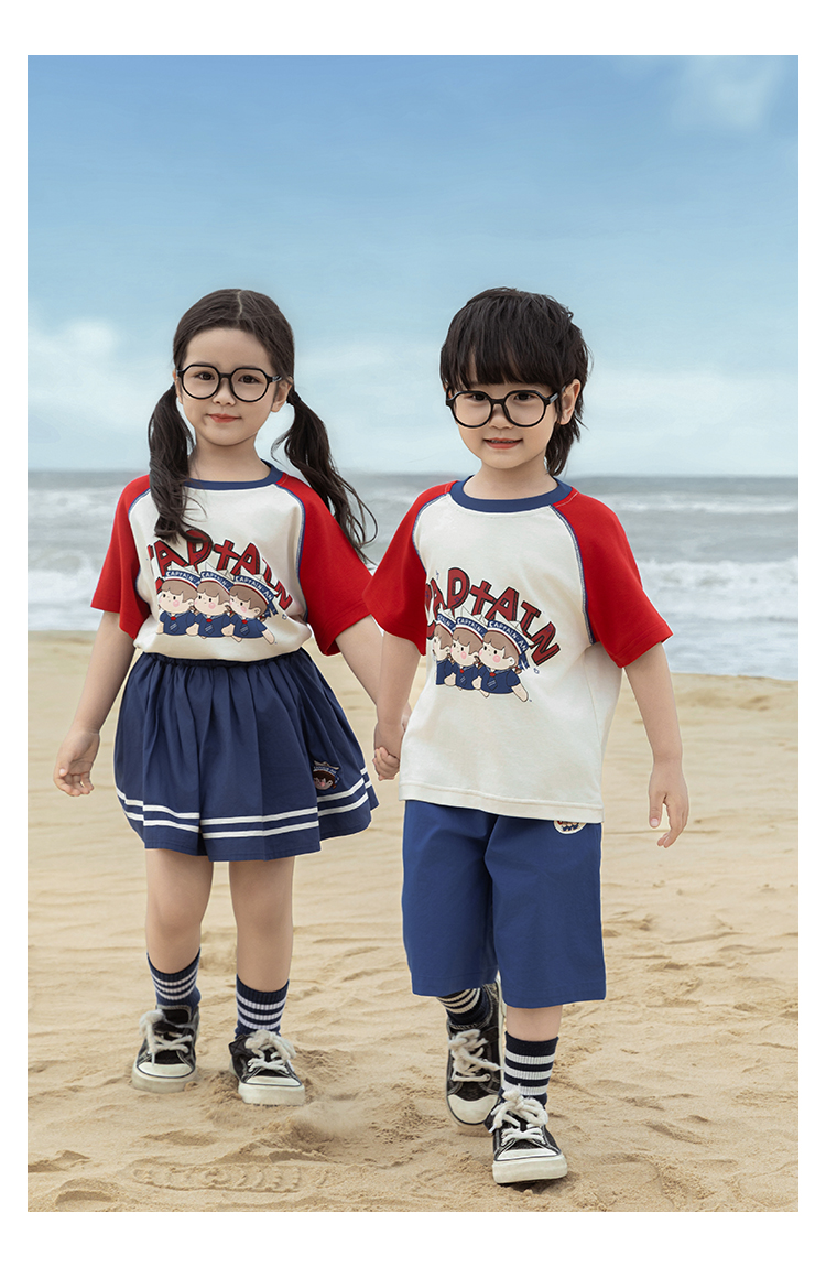 Wulibuyi Girls 네이비 스타일 An'an 시리즈 여름 상큼한 플리츠 스커트 대비 색상 반팔 티셔츠 셔츠 바지