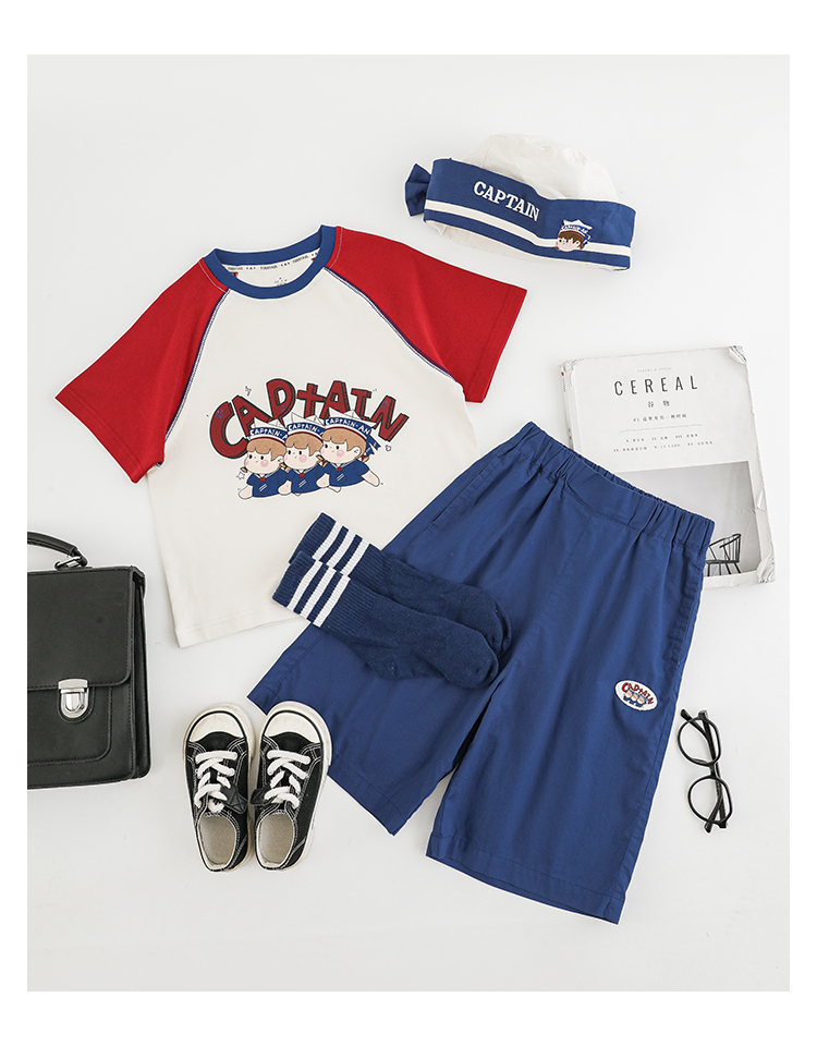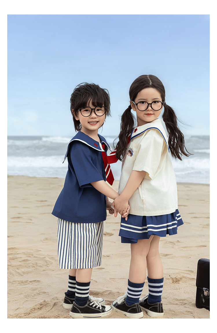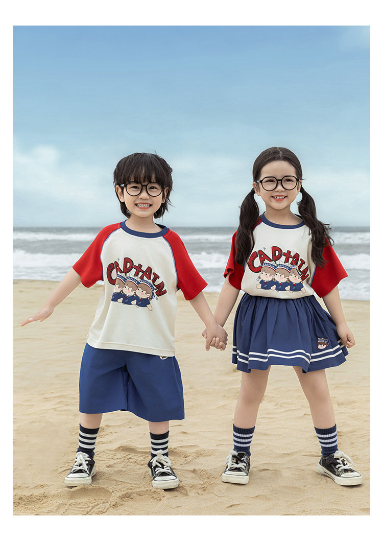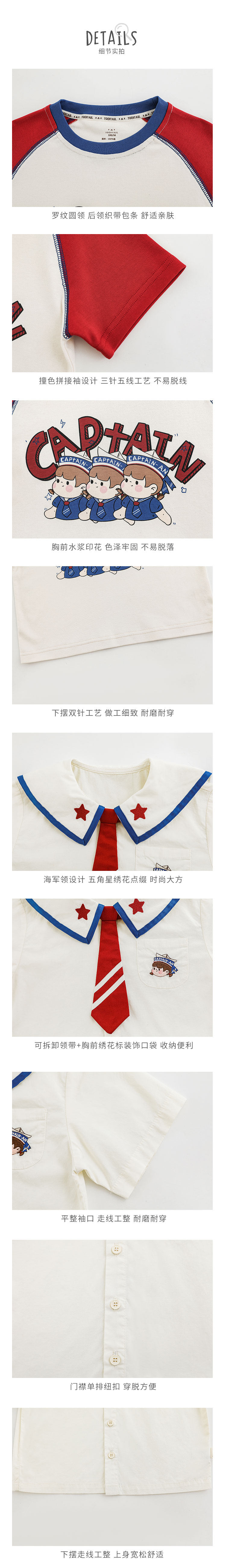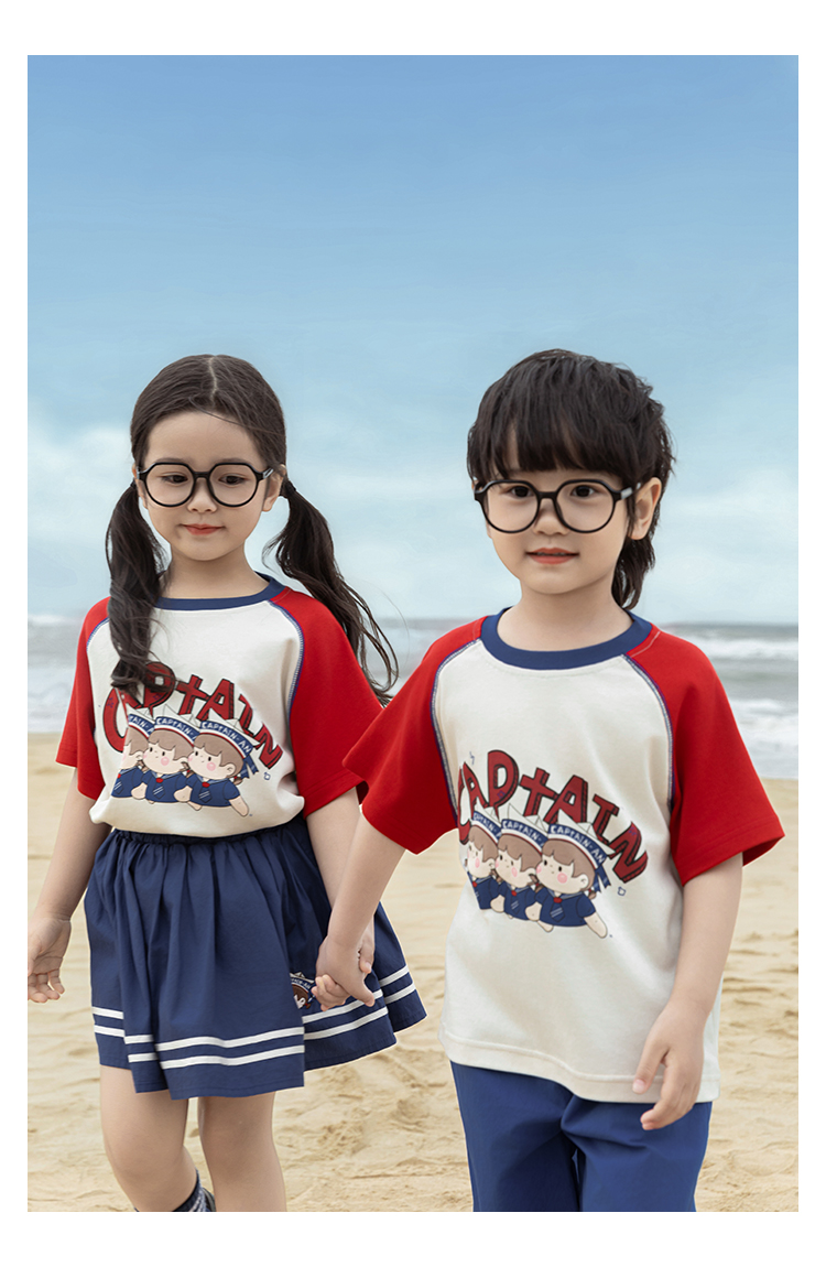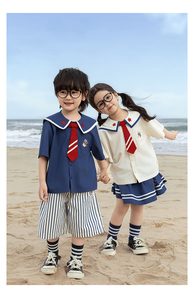 Wulibuyi Girls 네이비 스타일 An'an 시리즈 여름 상큼한 플리츠 스커트 대비 색상 반팔 티셔츠 셔츠 바지