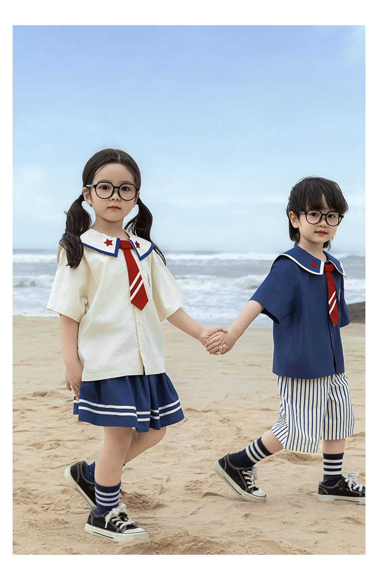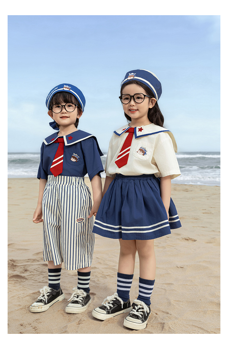Wulibuyi Girls 네이비 스타일 An'an 시리즈 여름 상큼한 플리츠 스커트 대비 색상 반팔 티셔츠 셔츠 바지스토어 가기