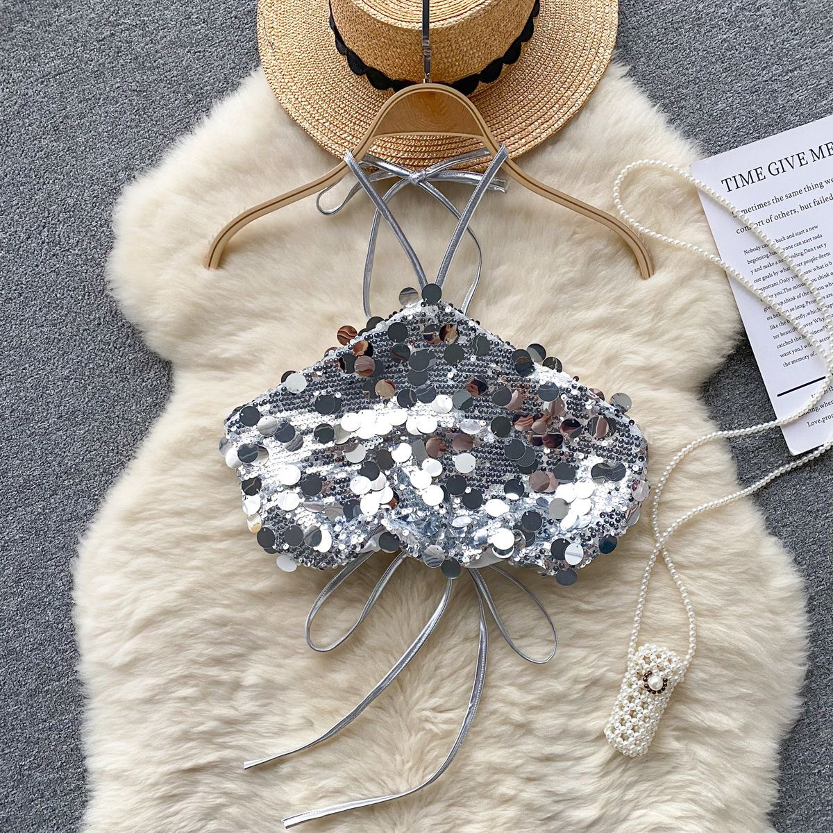 소녀들의 여름 새 스파클링 큰 목 조끼 2025 한국식 카미솔 스퀸 백리스 쇼트탑스토어 가기