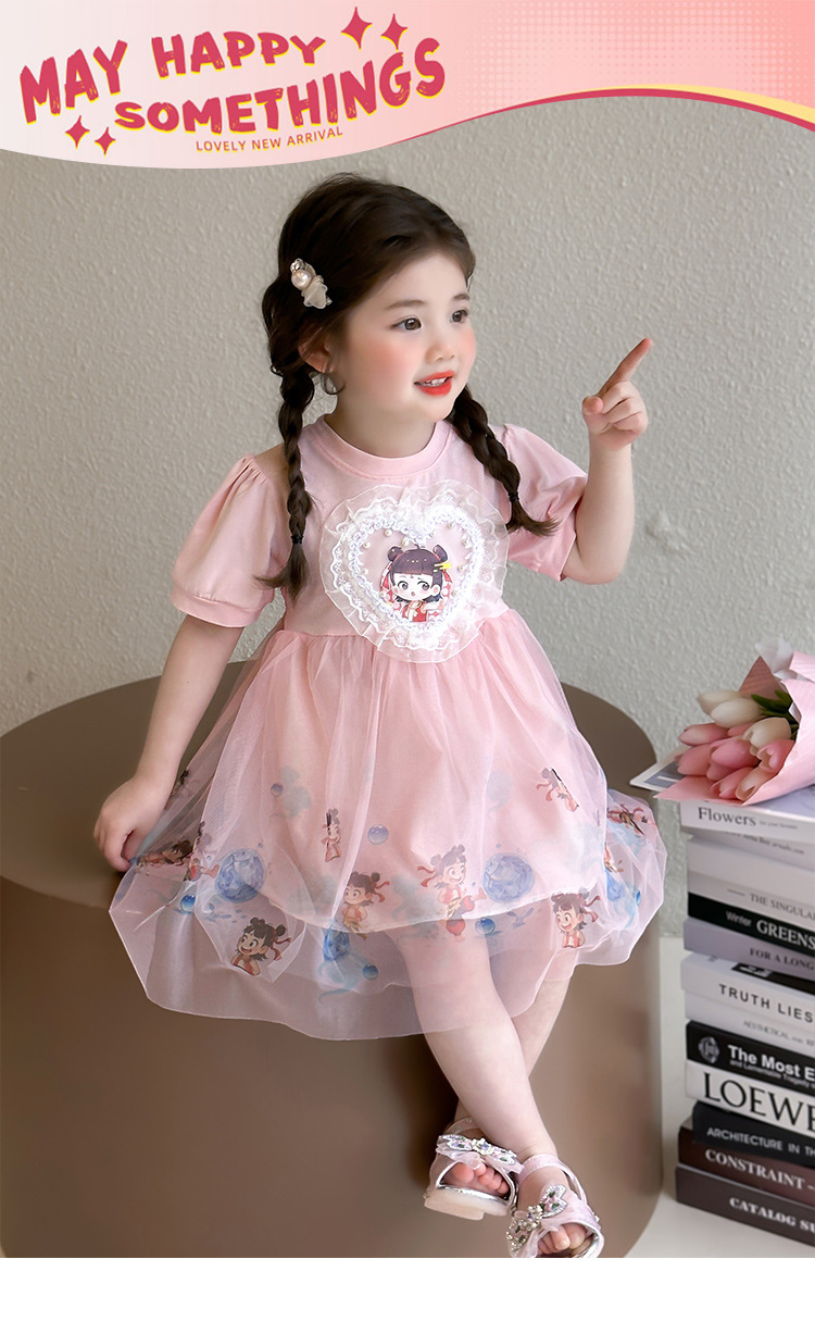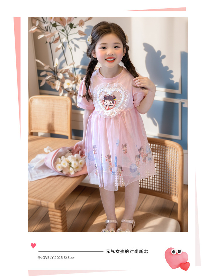 여자 여름 반팔 원피스 2025 새로운 어린이 만화 네자 베일 스커트 소녀의 메쉬 공주 스커트 트렌디스토어 가기