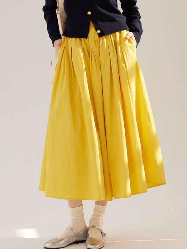 25 봄 밝은 노란색 신장 긴 스테이플 코튼 탄성 주름 대형 우산 스커트