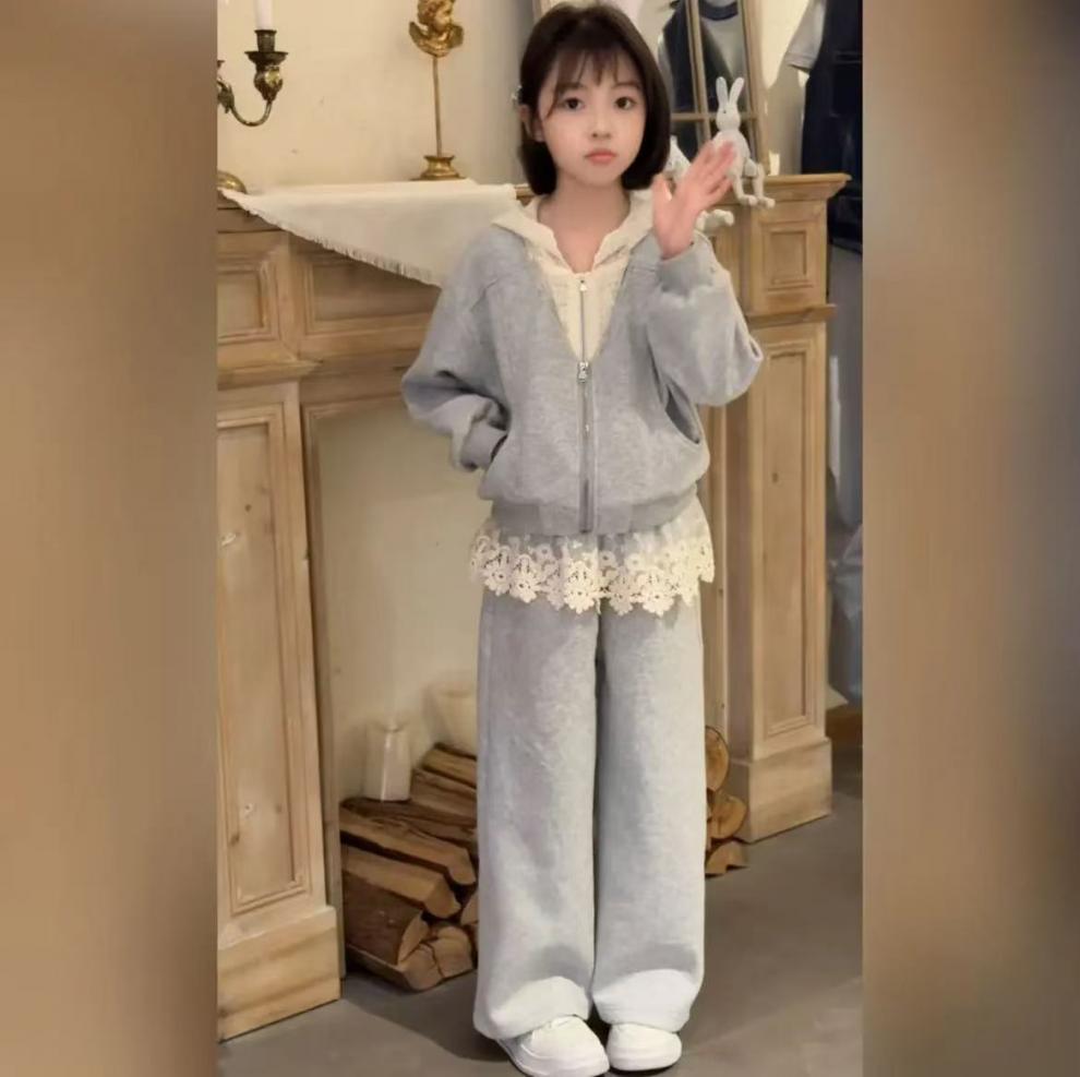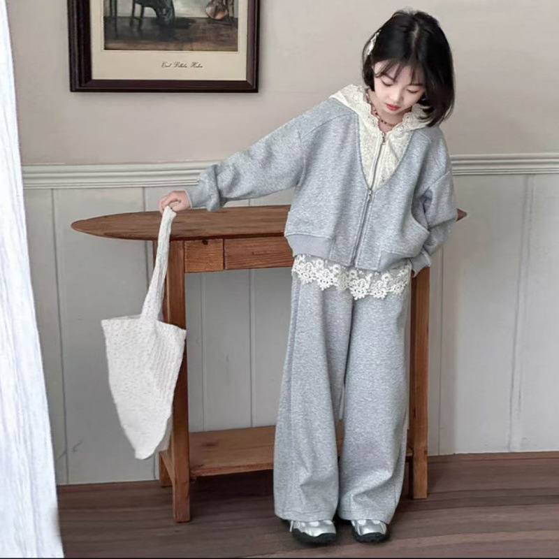 2025 새로운 소녀 봄과 가을 스포츠 세트 외국 스타일 한국 레이스 캡 니트 느슨한 넓은 다리 후드 투피스 세트