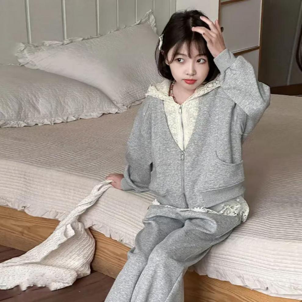 2025 새로운 소녀 봄과 가을 스포츠 세트 외국 스타일 한국 레이스 캡 니트 느슨한 넓은 다리 후드 투피스 세트스토어 가기