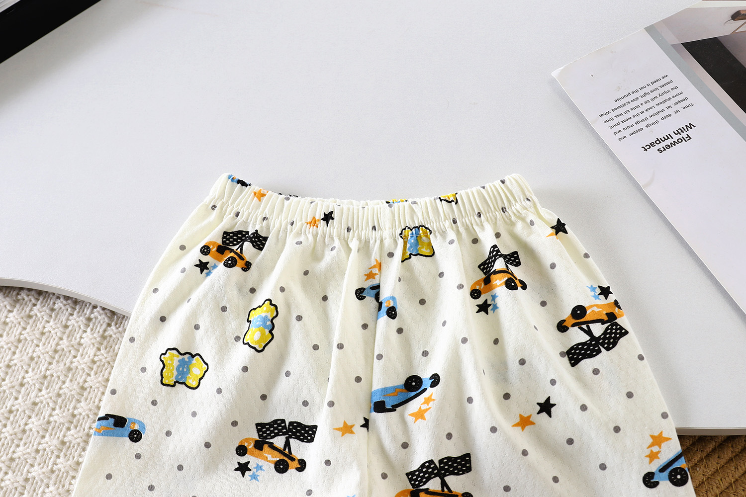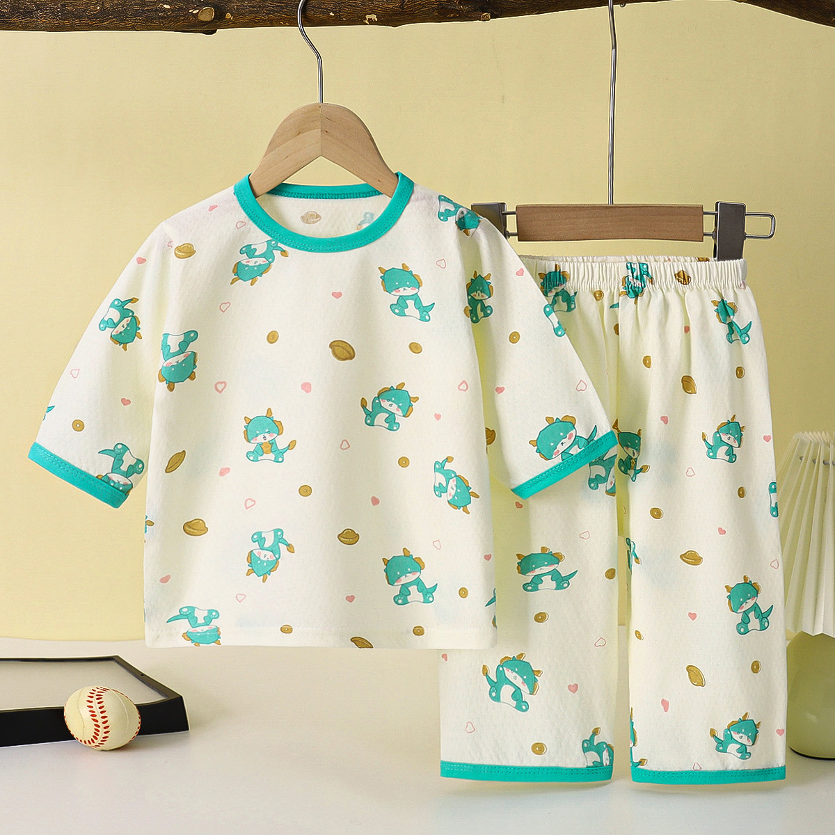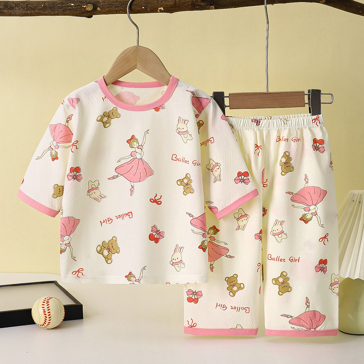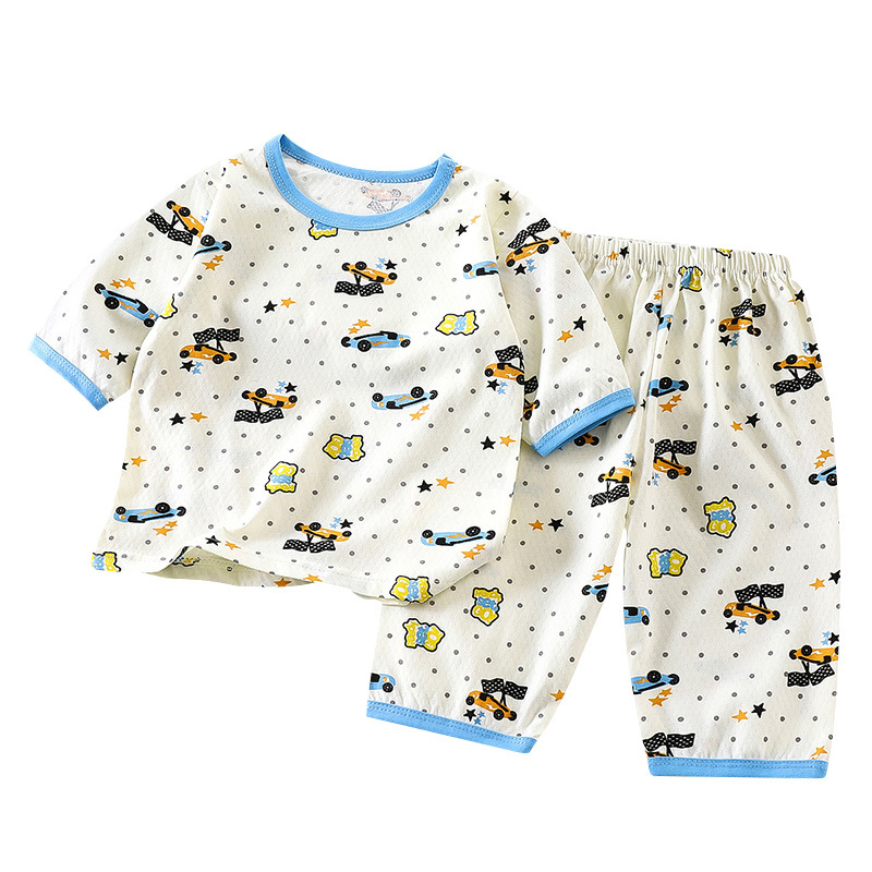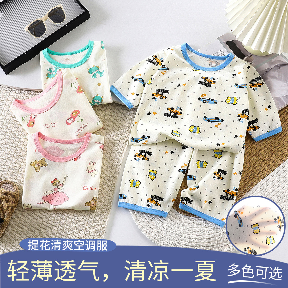 여름 새 소년 에어컨 의류 순수 코튼 자카드 소녀의 집 옷 둥근 목 인쇄 7 점 어린이 잠옷 세트스토어 가기