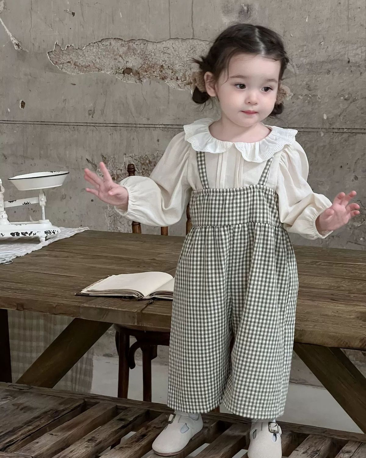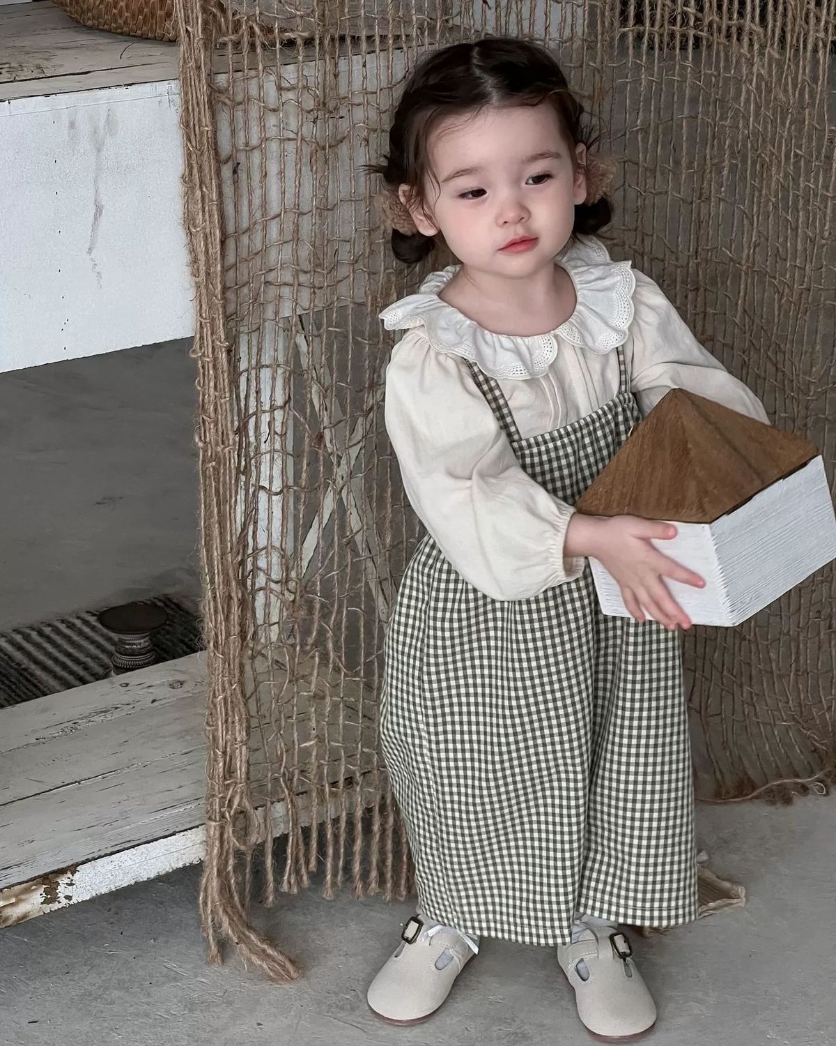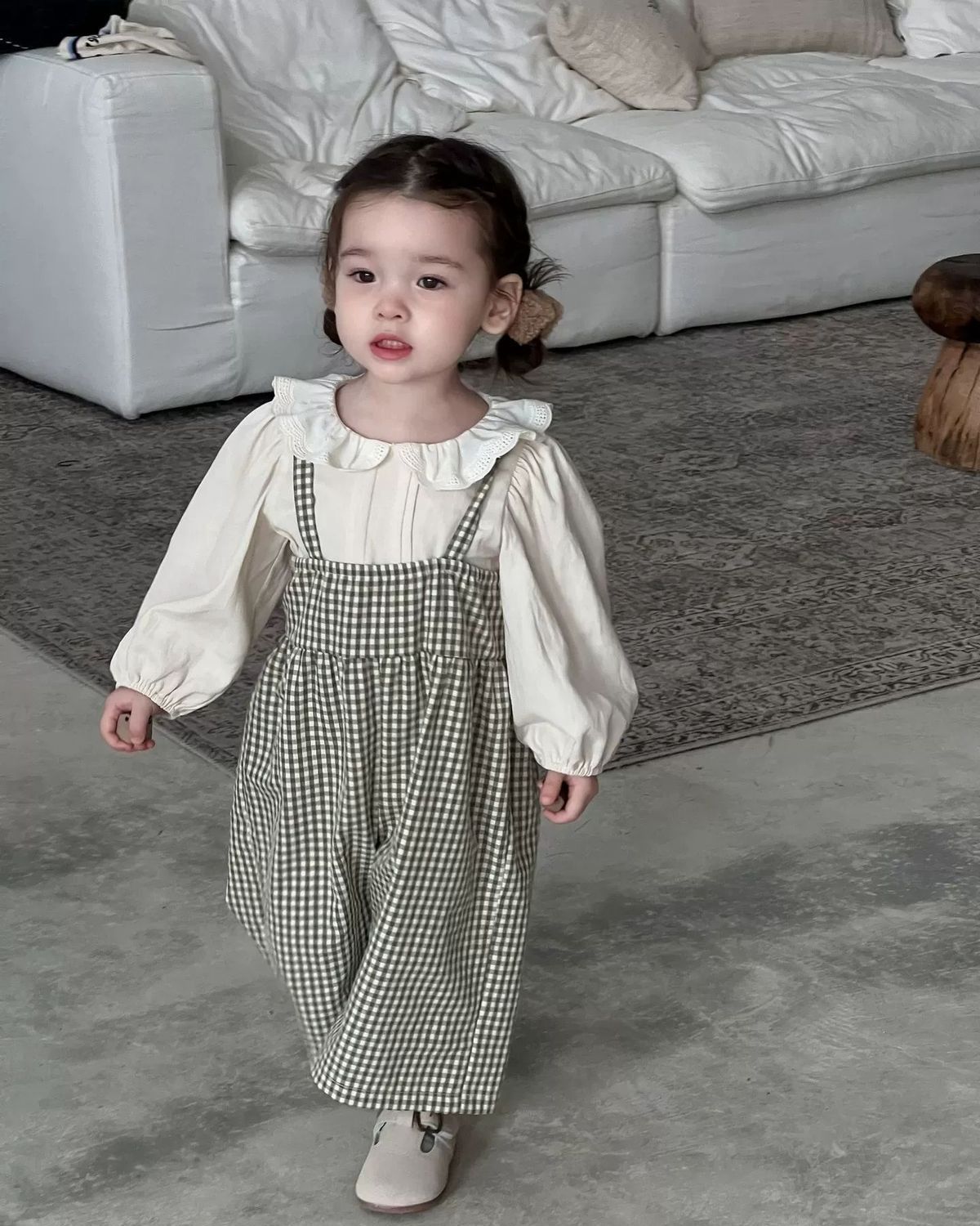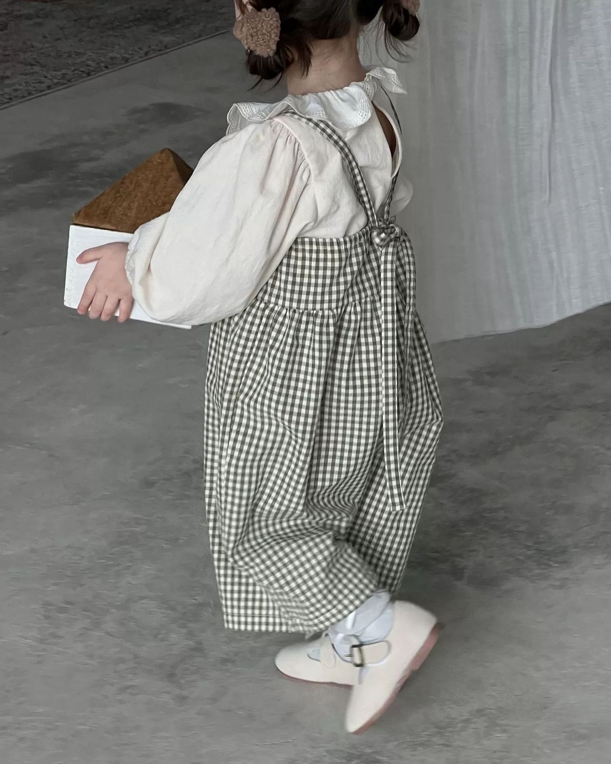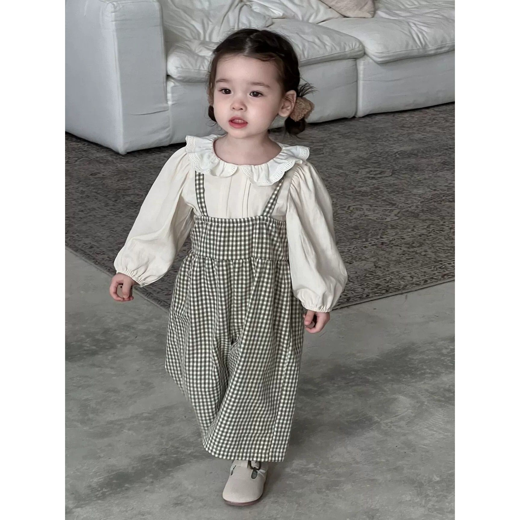 • 체크무늬 멜빵 + 오프화이트 탑