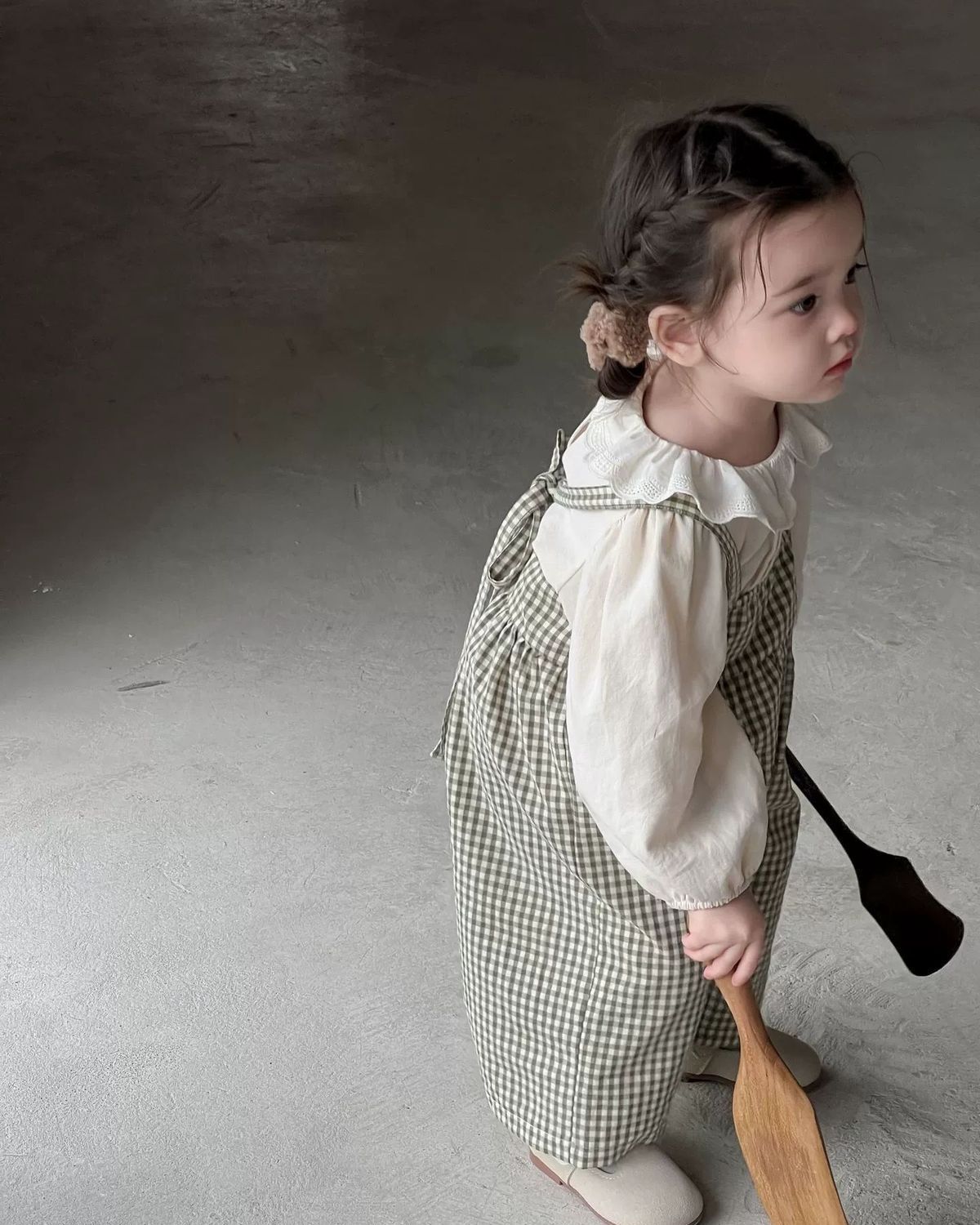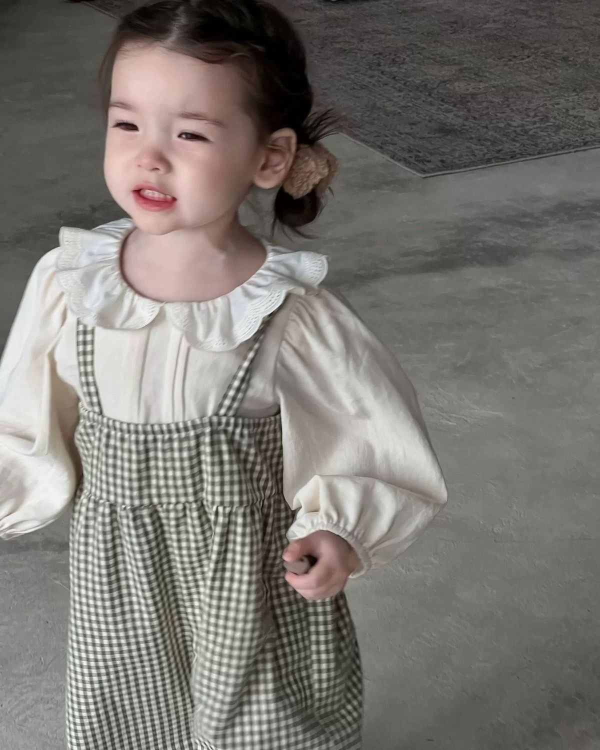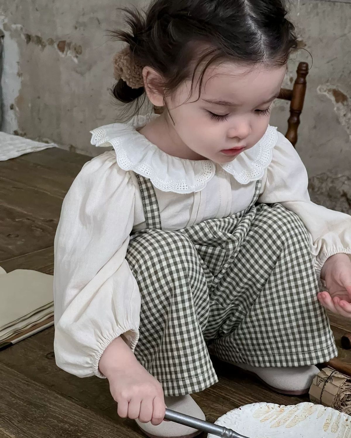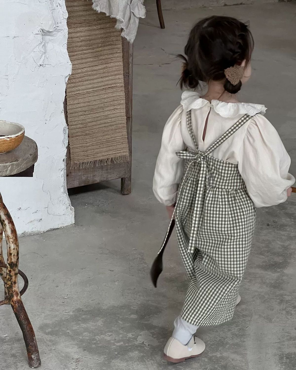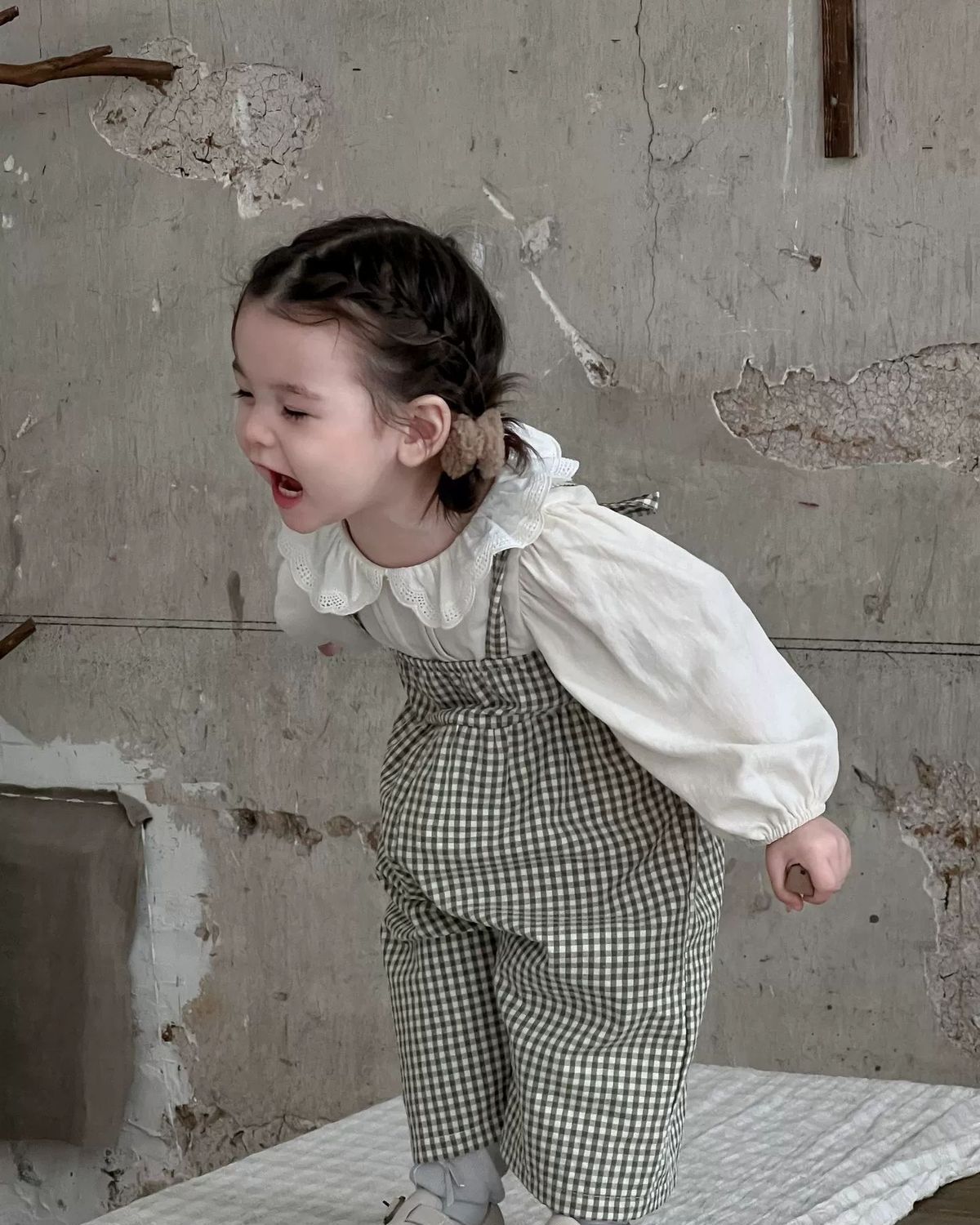 • 체크무늬 멜빵 + 오프화이트 탑