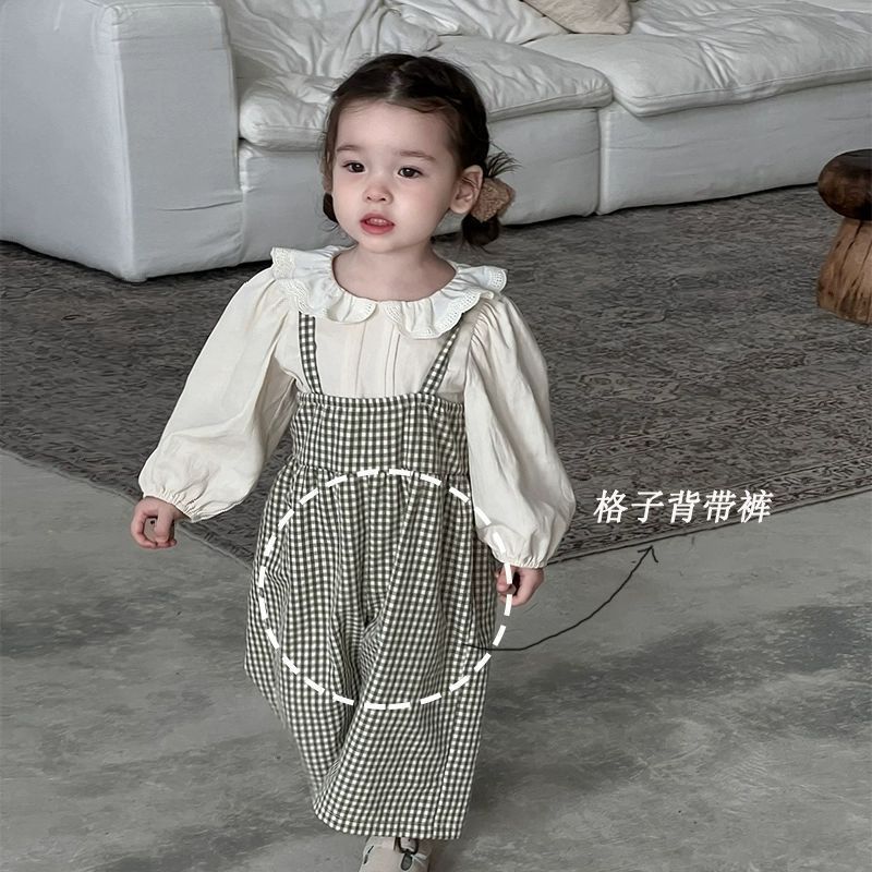 아기 세트 이른 가을 옷 단색 연꽃 잎 llace 칼라 느슨한 아기 거품 셔츠 한국 스타일 서스펜더