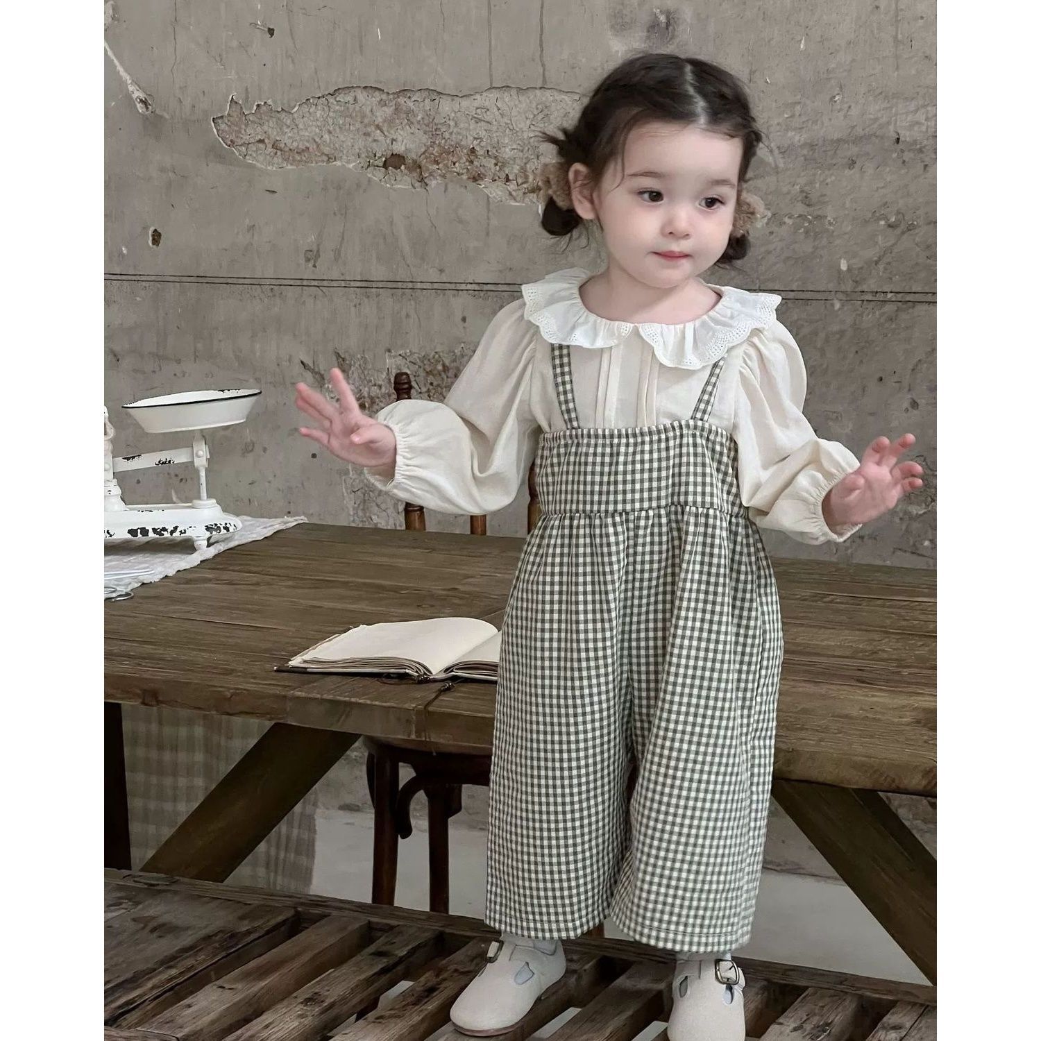 아기 세트 이른 가을 옷 단색 연꽃 잎 llace 칼라 느슨한 아기 거품 셔츠 한국 스타일 서스펜더스토어 가기