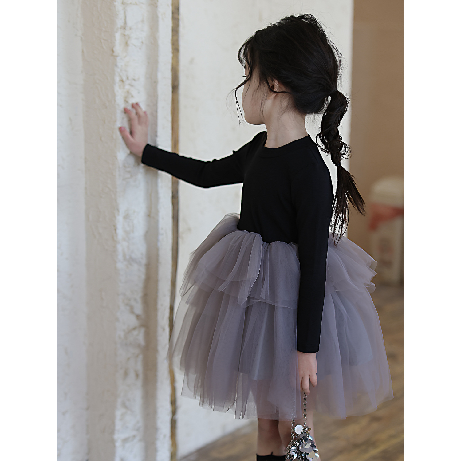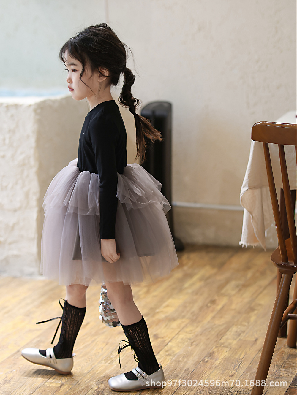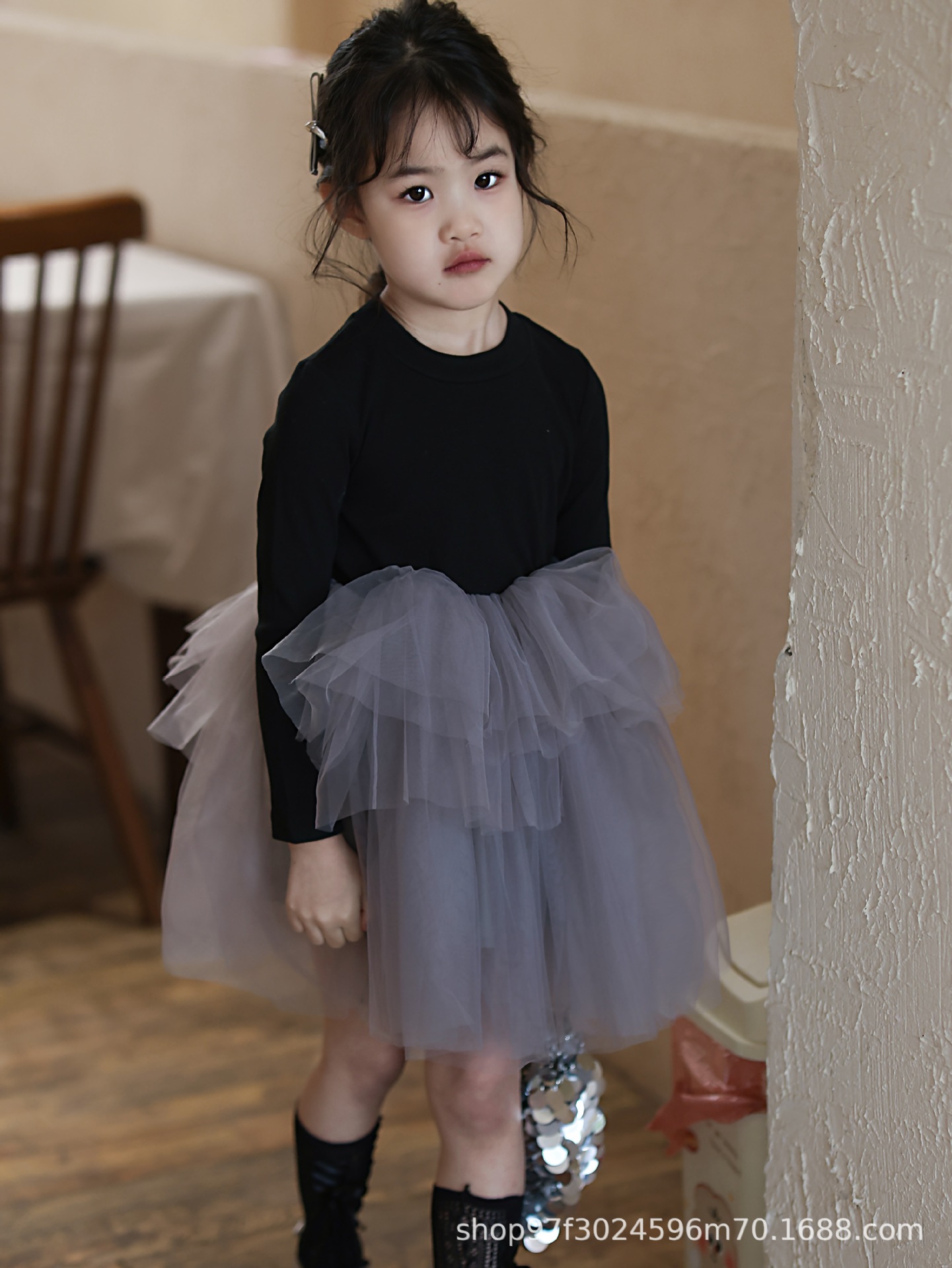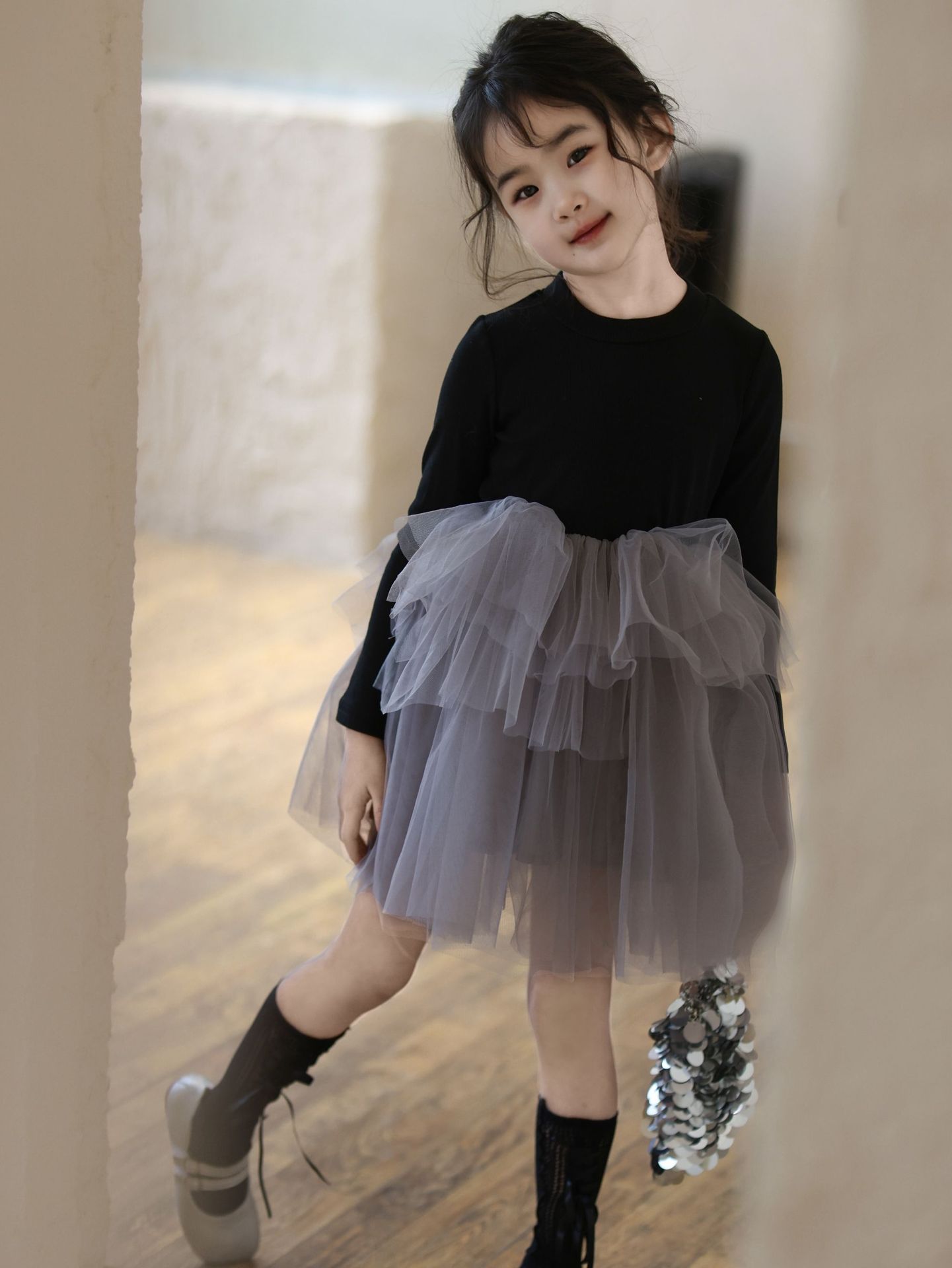 어린 소녀들을위한 소녀 긴 소매 메쉬 케이크 원피스 봄과 여름 2025 새로운 고급 회색 댄스 공주 스커트스토어 가기