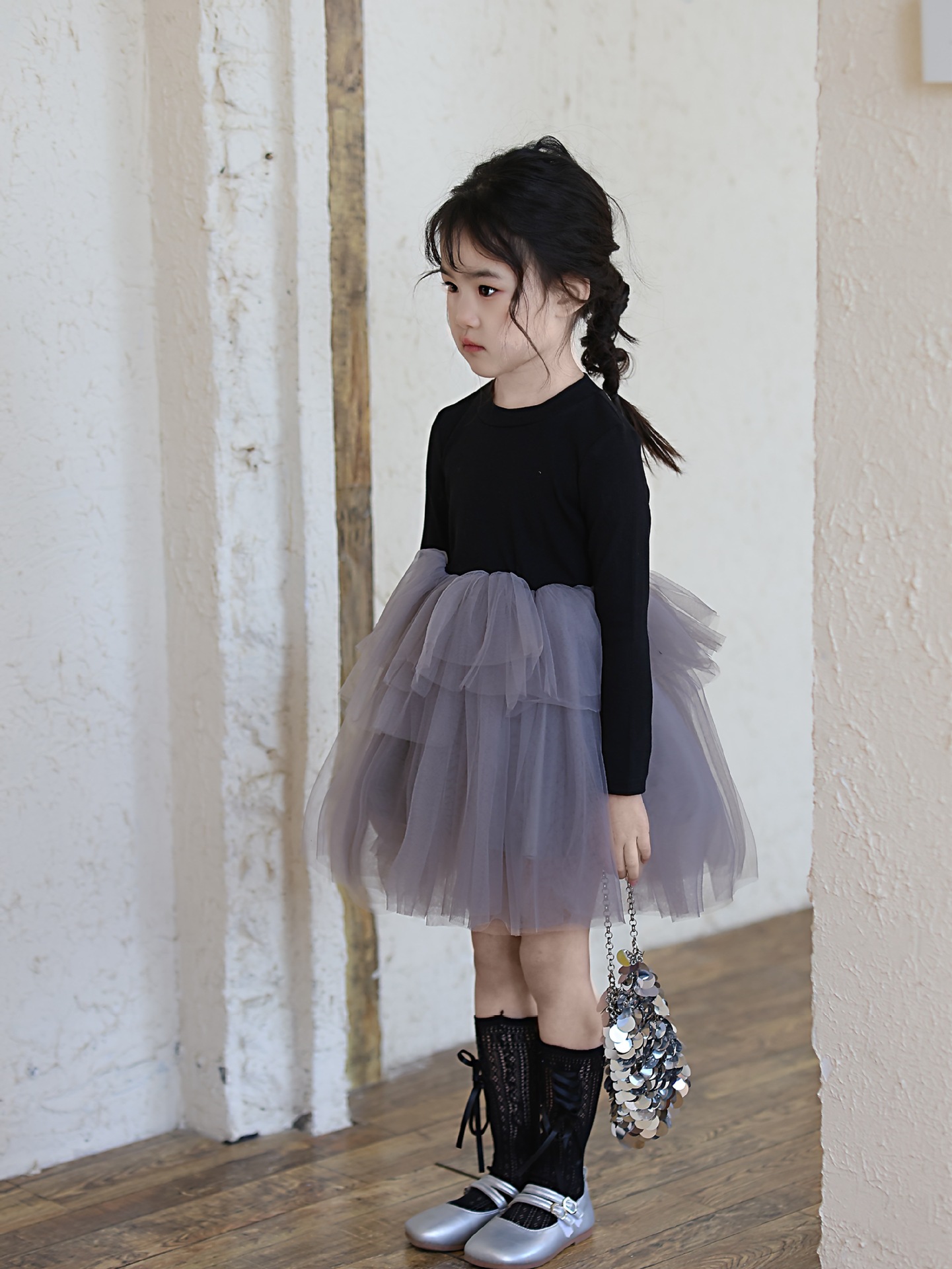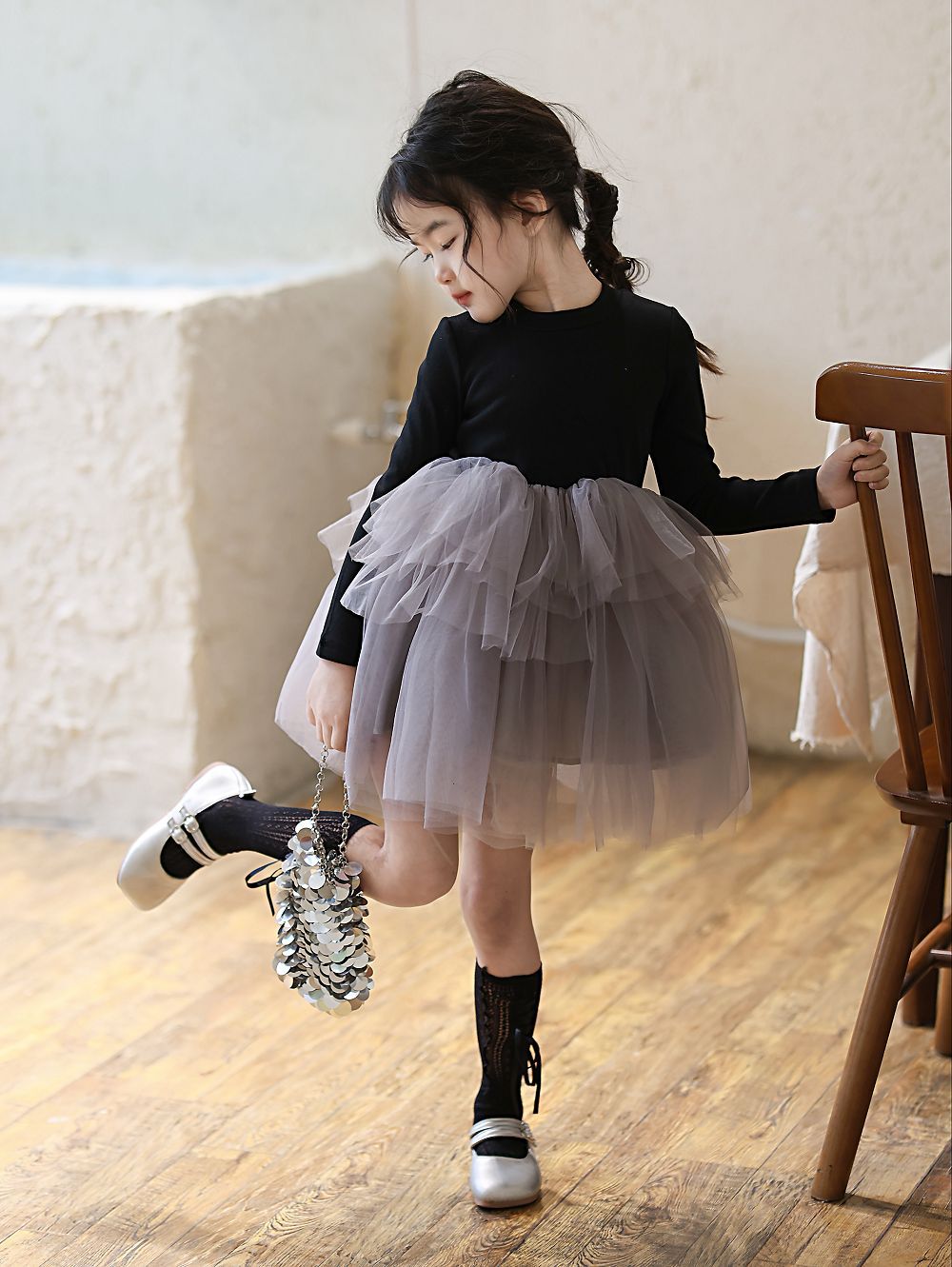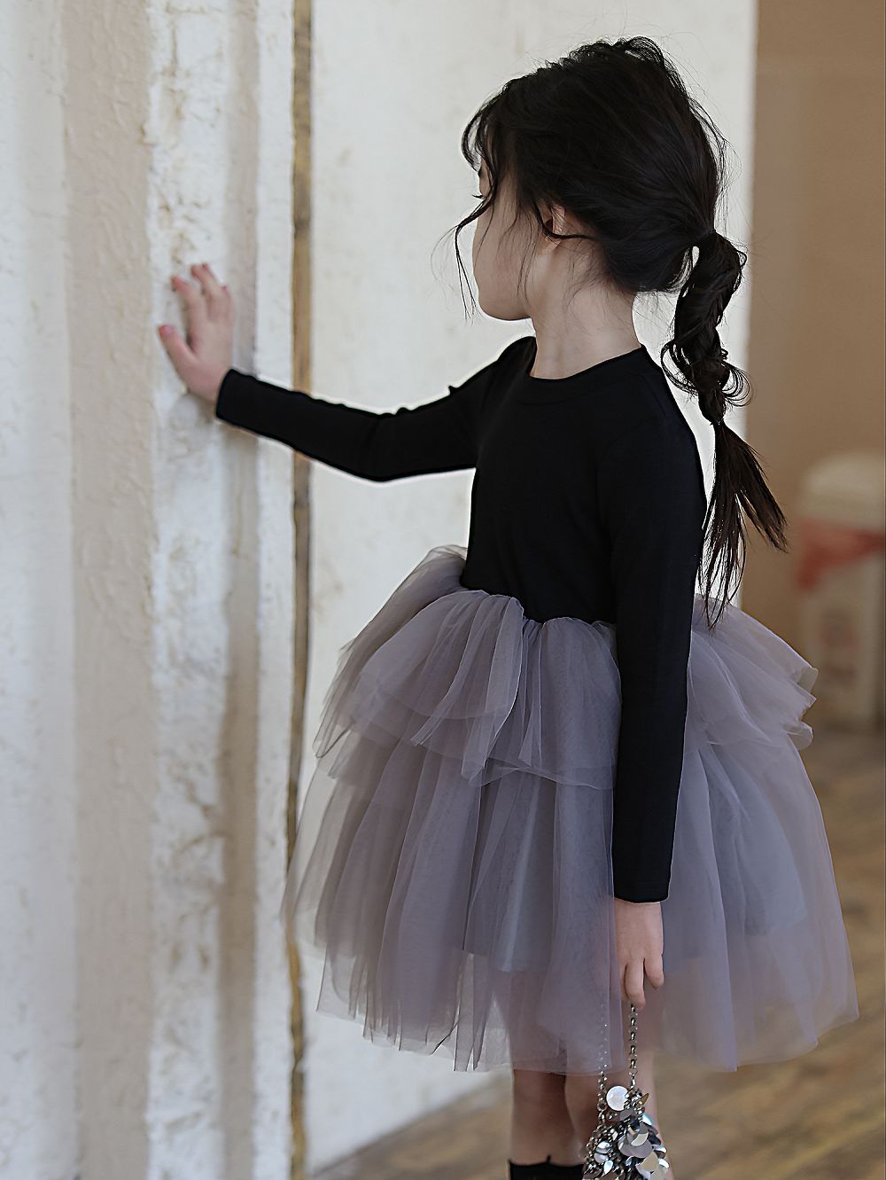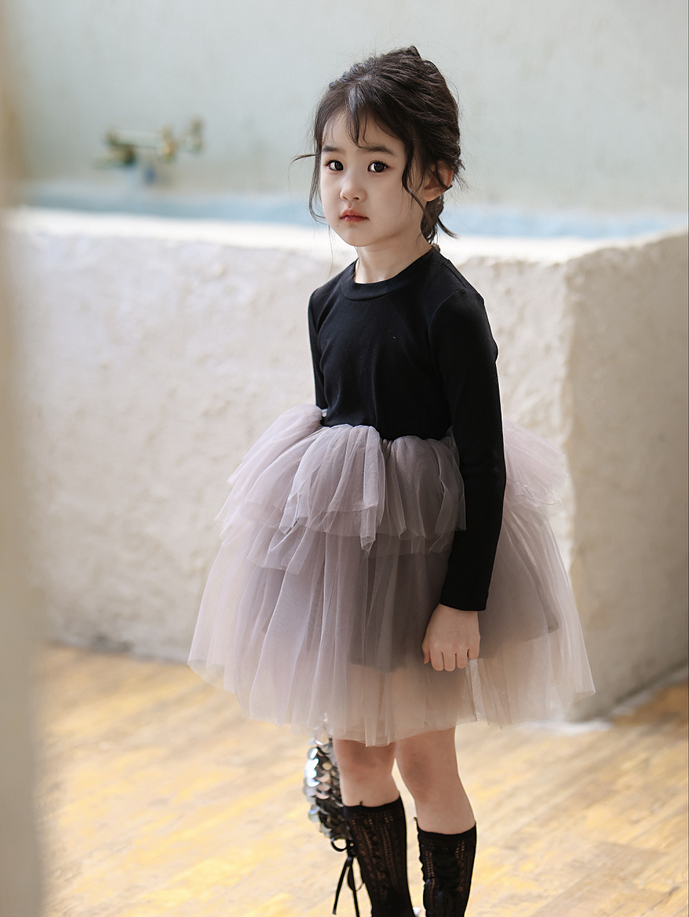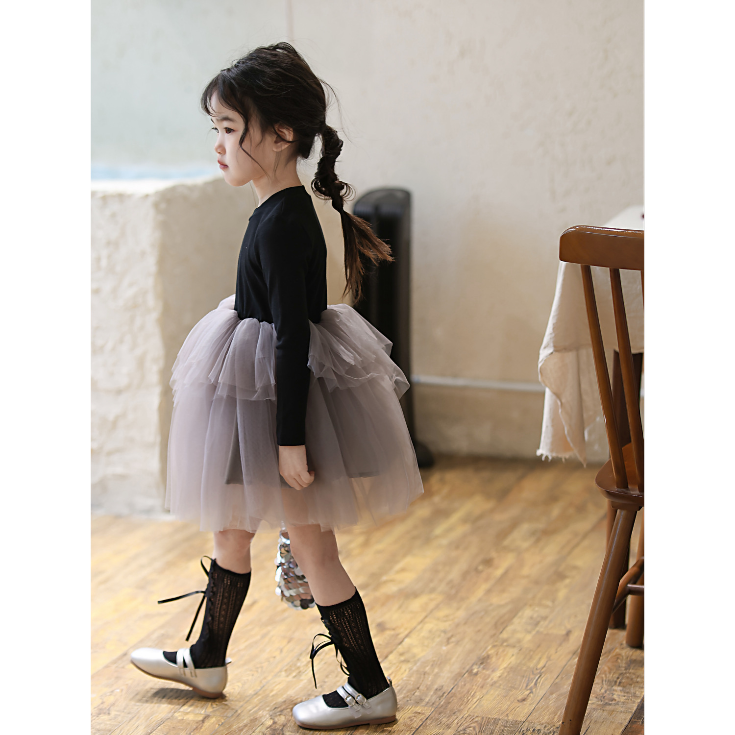 어린 소녀들을위한 소녀 긴 소매 메쉬 케이크 원피스 봄과 여름 2025 새로운 고급 회색 댄스 공주 스커트스토어 가기