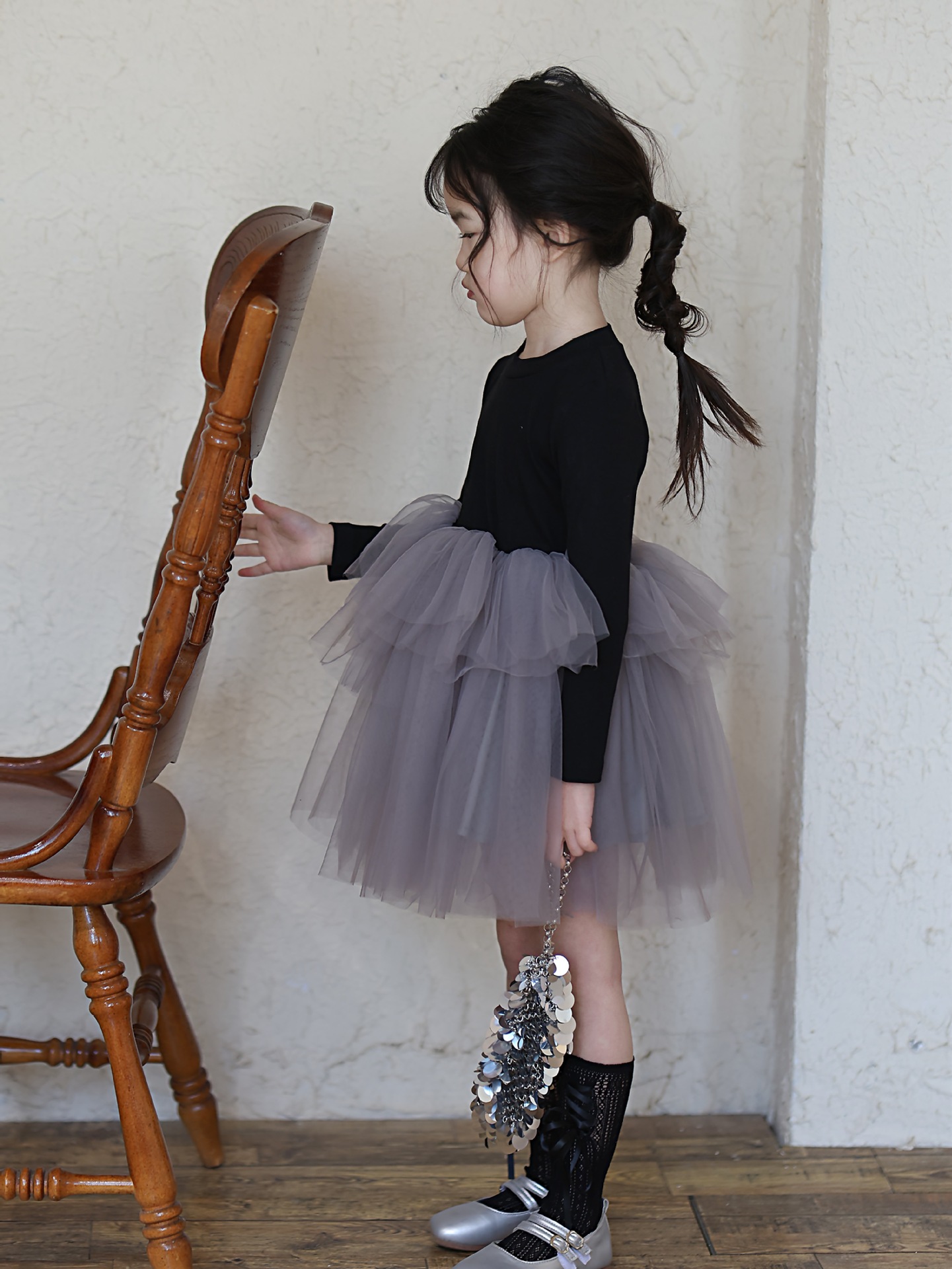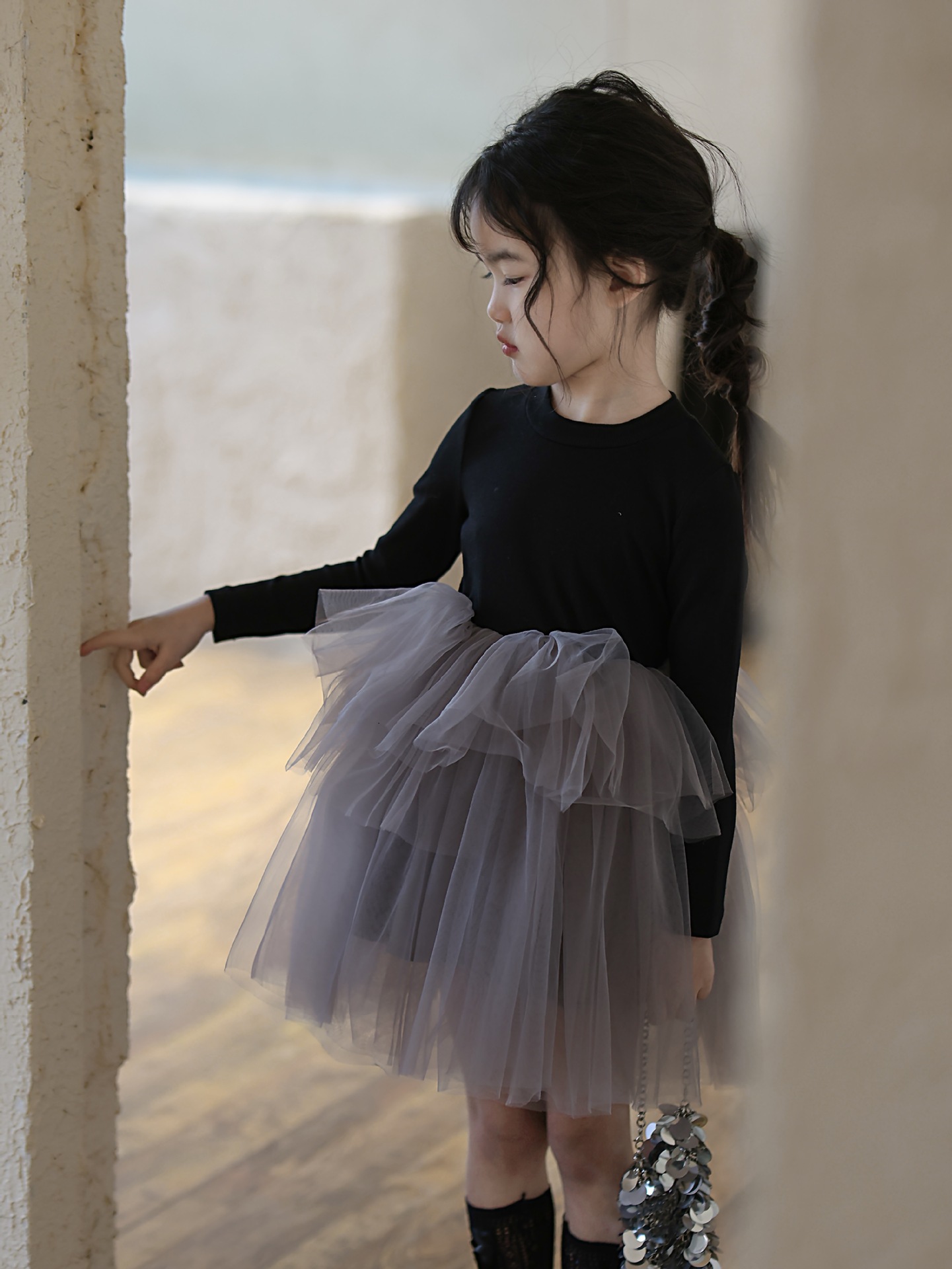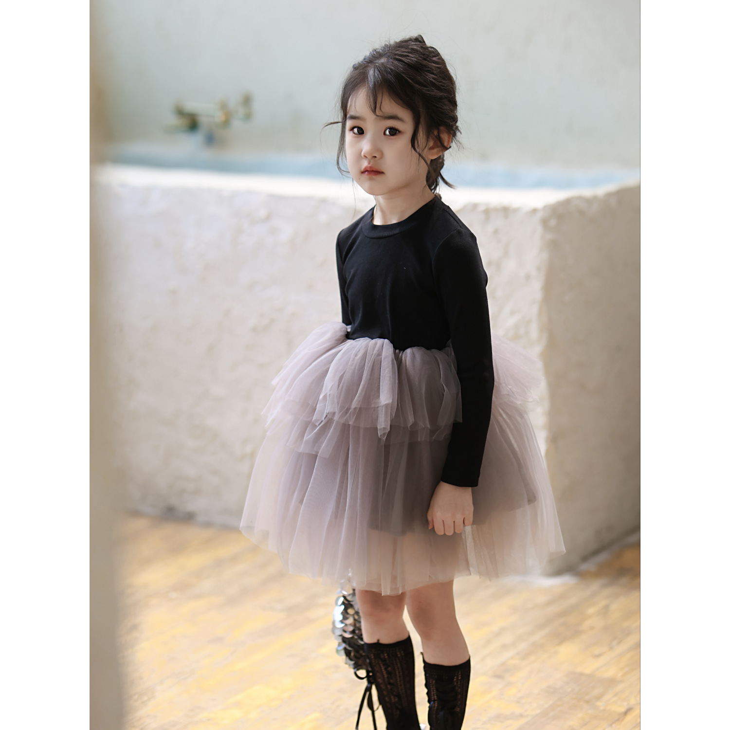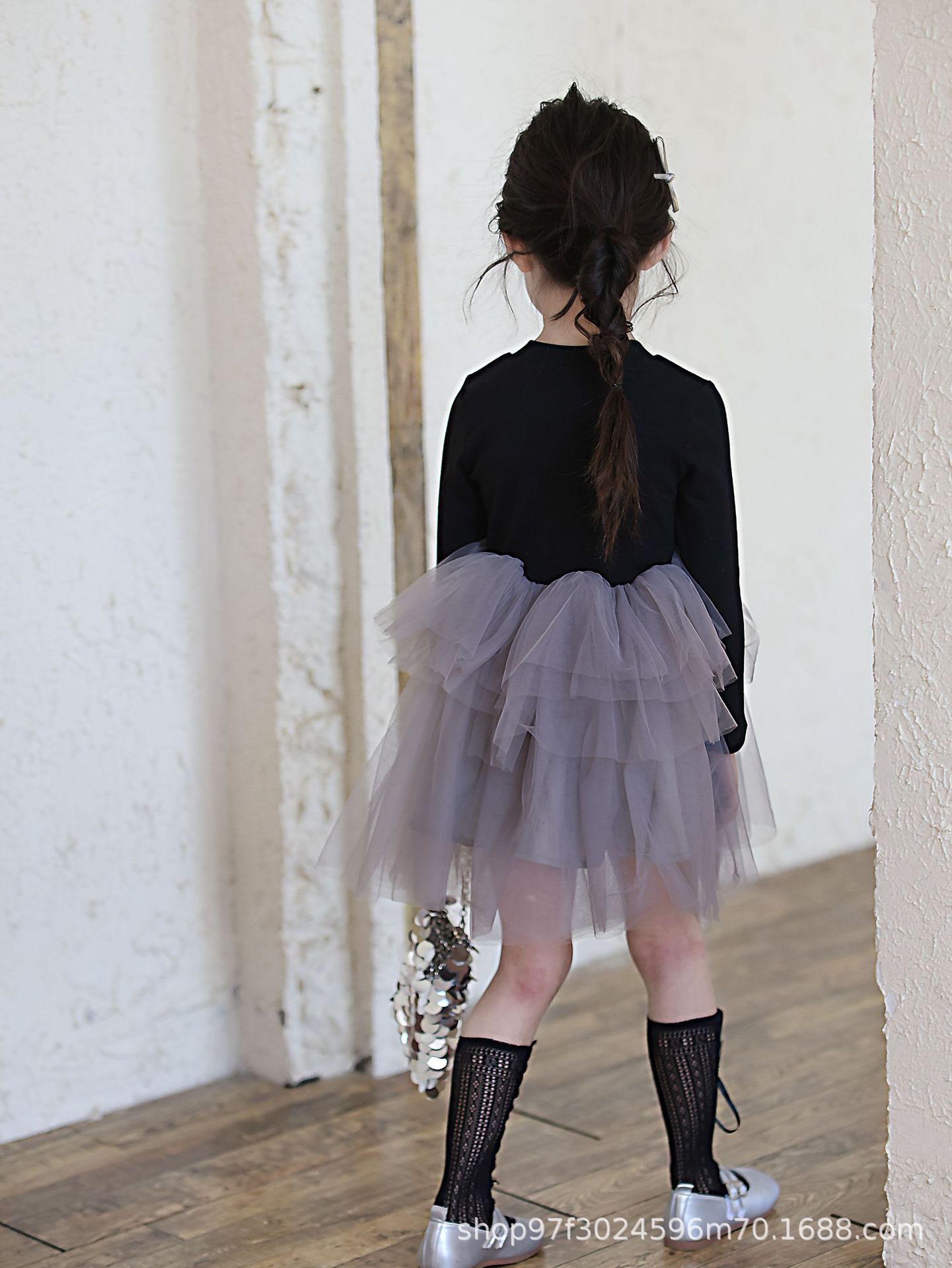 어린 소녀들을위한 소녀 긴 소매 메쉬 케이크 원피스 봄과 여름 2025 새로운 고급 회색 댄스 공주 스커트스토어 가기