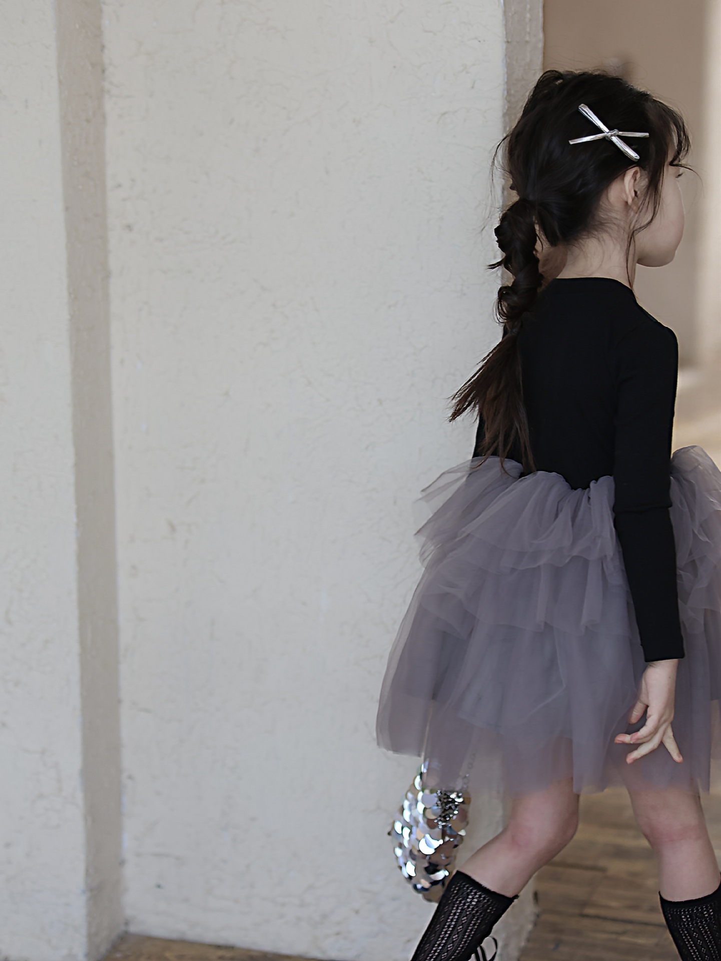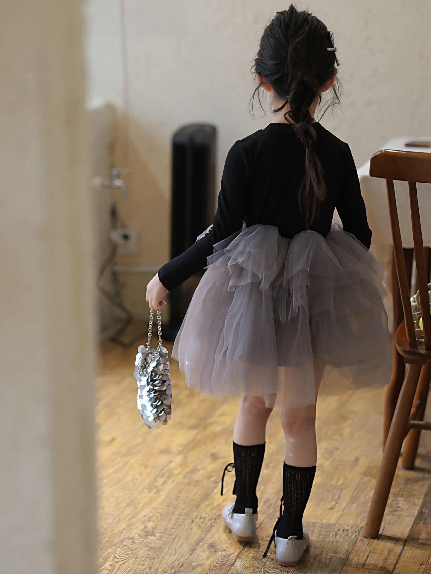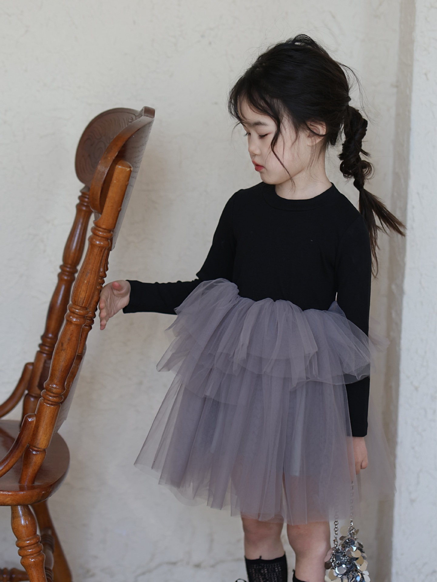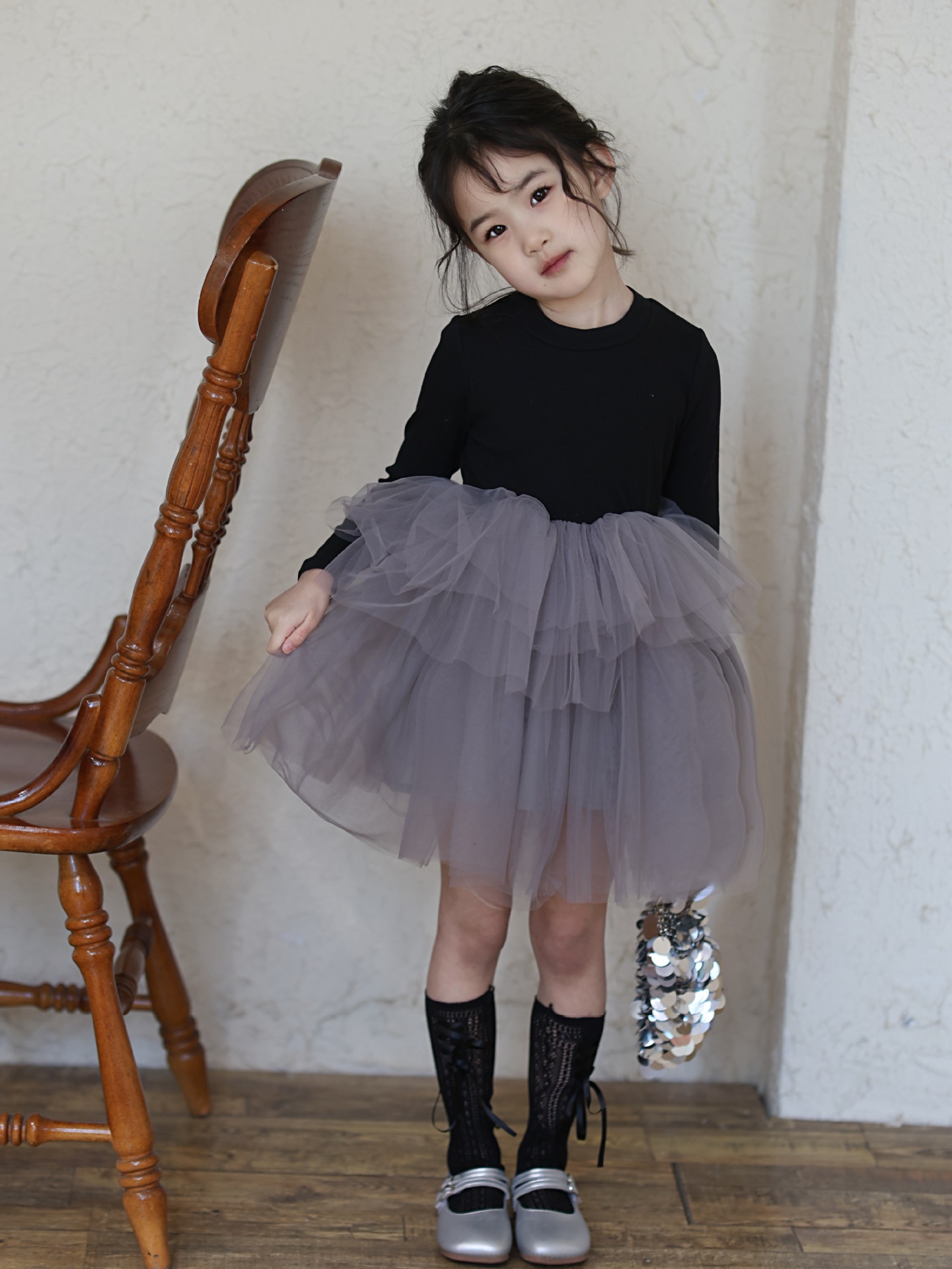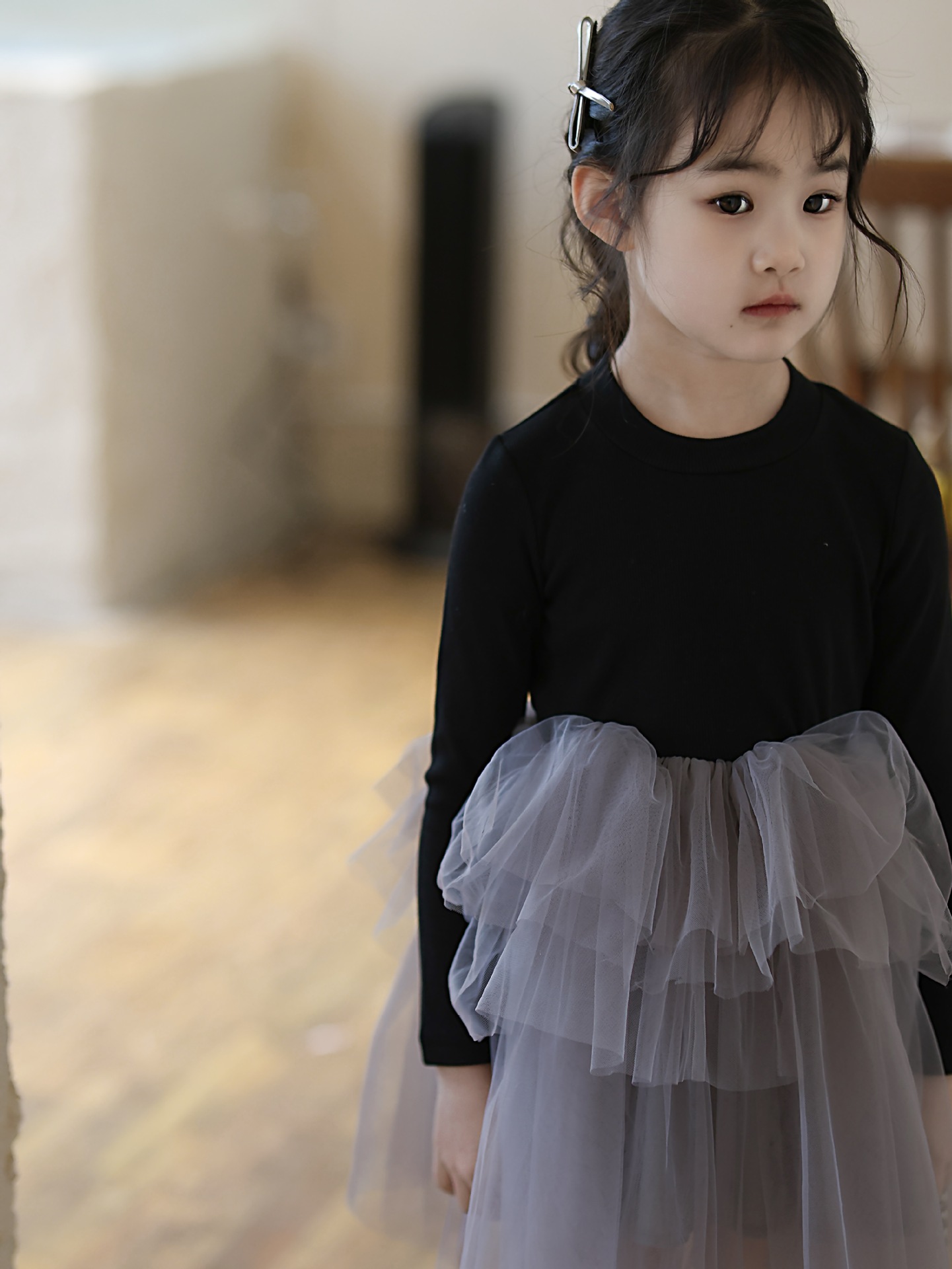 어린 소녀들을위한 소녀 긴 소매 메쉬 케이크 원피스 봄과 여름 2025 새로운 고급 회색 댄스 공주 스커트스토어 가기