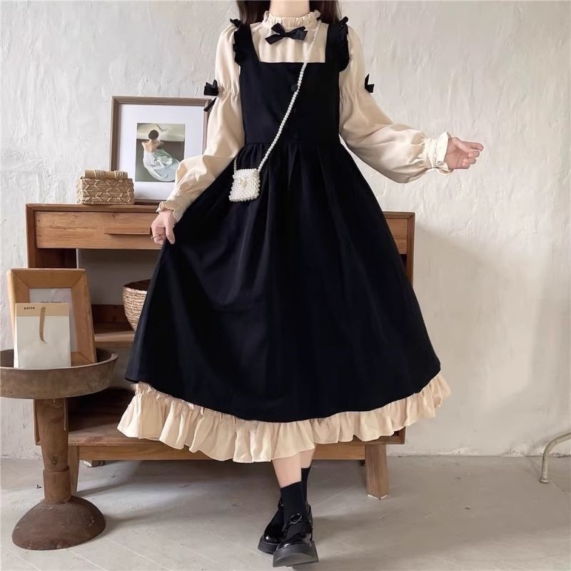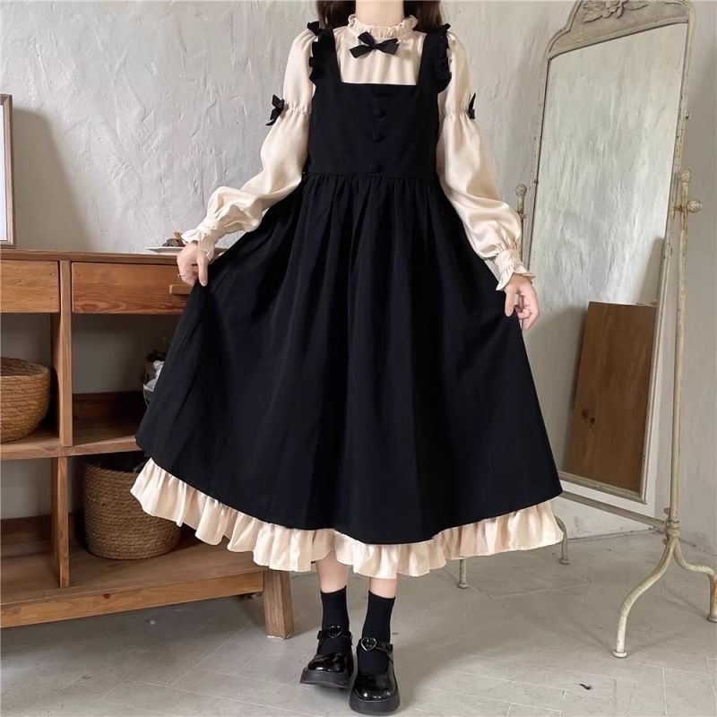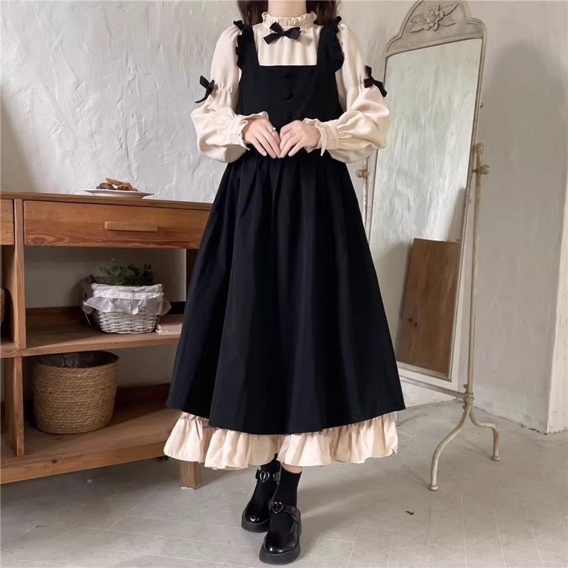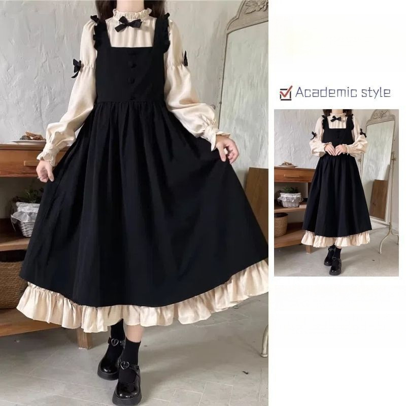 작은 소금 스타일 밀크 달콤한 대학 스타일 원피스 스트랩 여성 루즈 스택 귀여운 나이 감소 투피스 세트