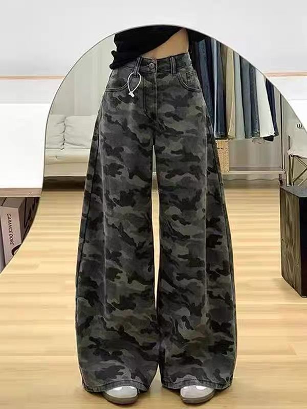 아메리칸 스타일 하이 스트리트 툴링 와이드 레그 위장 청바지 여성의 2025 봄 레트로 높은 허리 느슨한 슬림 룩 바지
