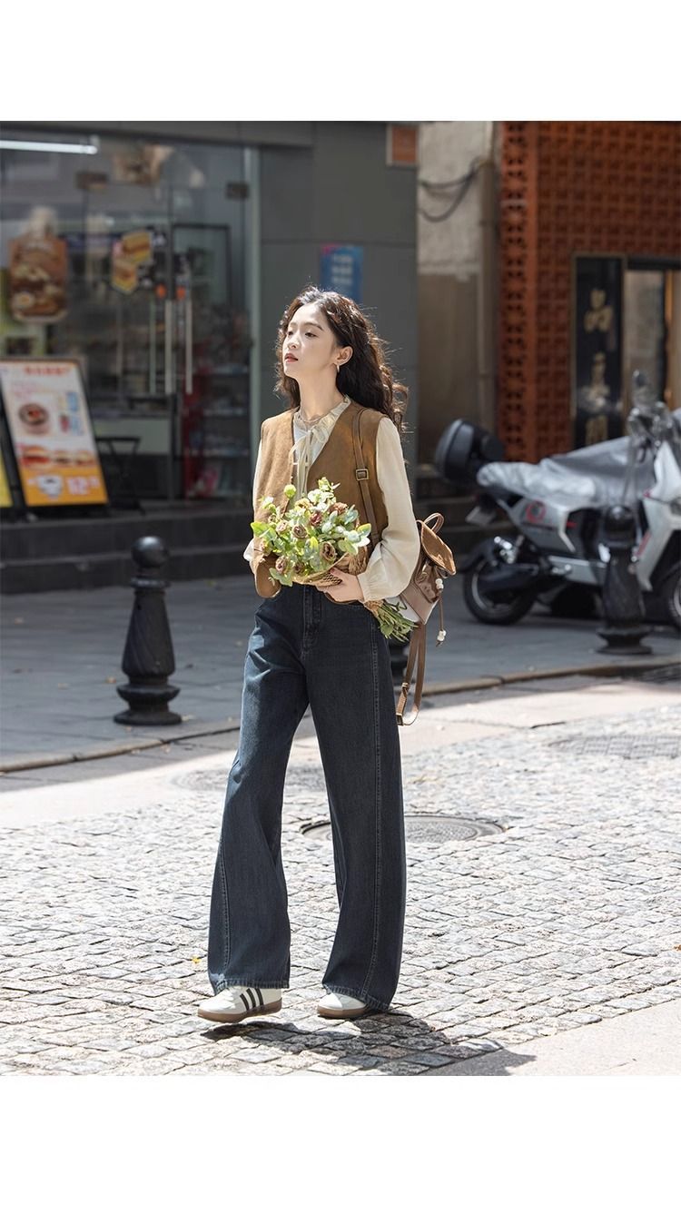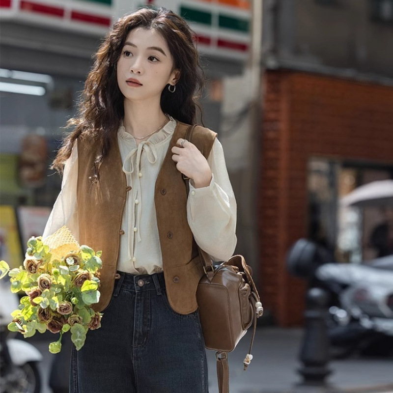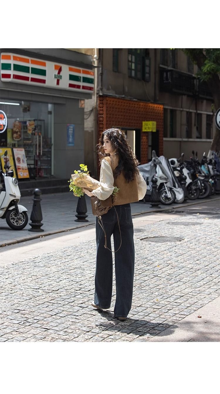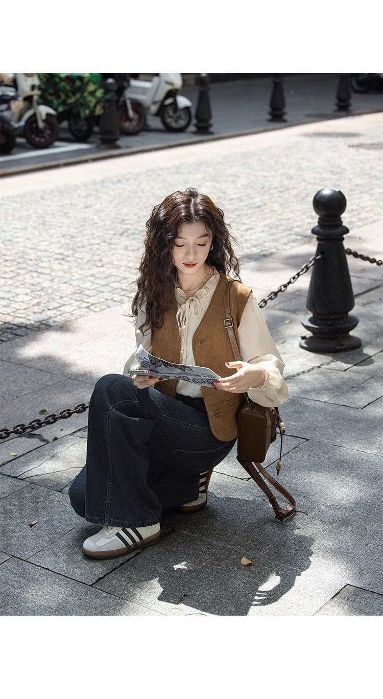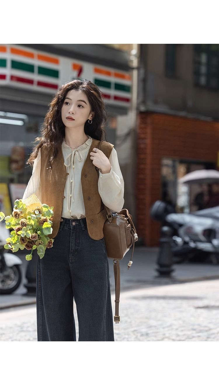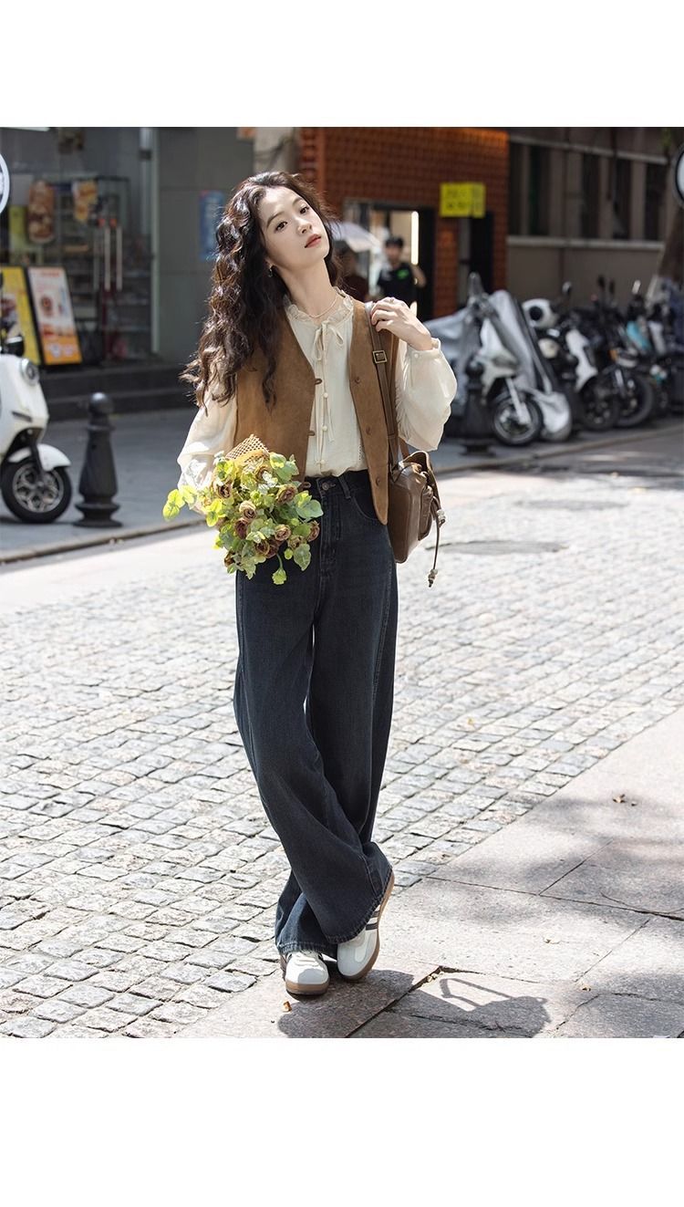 2025 봄 새 한국 스타일 하이 엔드 시폰 셔츠 탑 다크 브라운 조끼 청바지 슬림 3 종 세트스토어 가기
