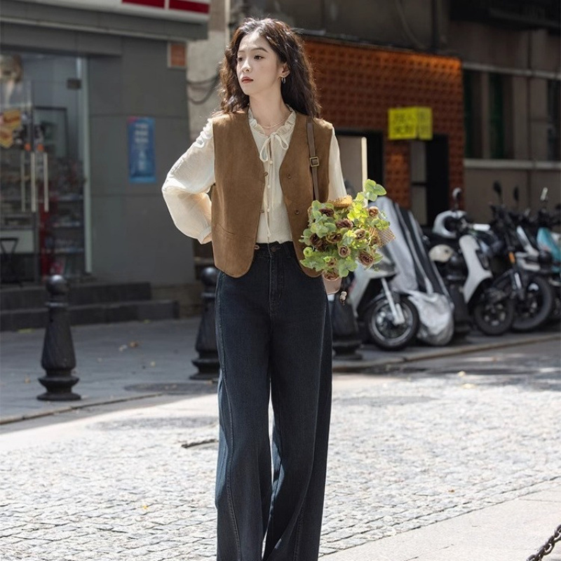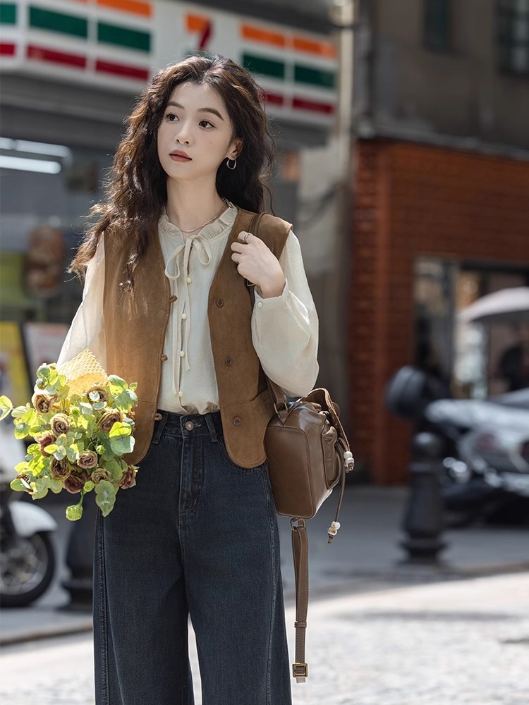 2025 봄 새 한국 스타일 하이 엔드 시폰 셔츠 탑 다크 브라운 조끼 청바지 슬림 3 종 세트