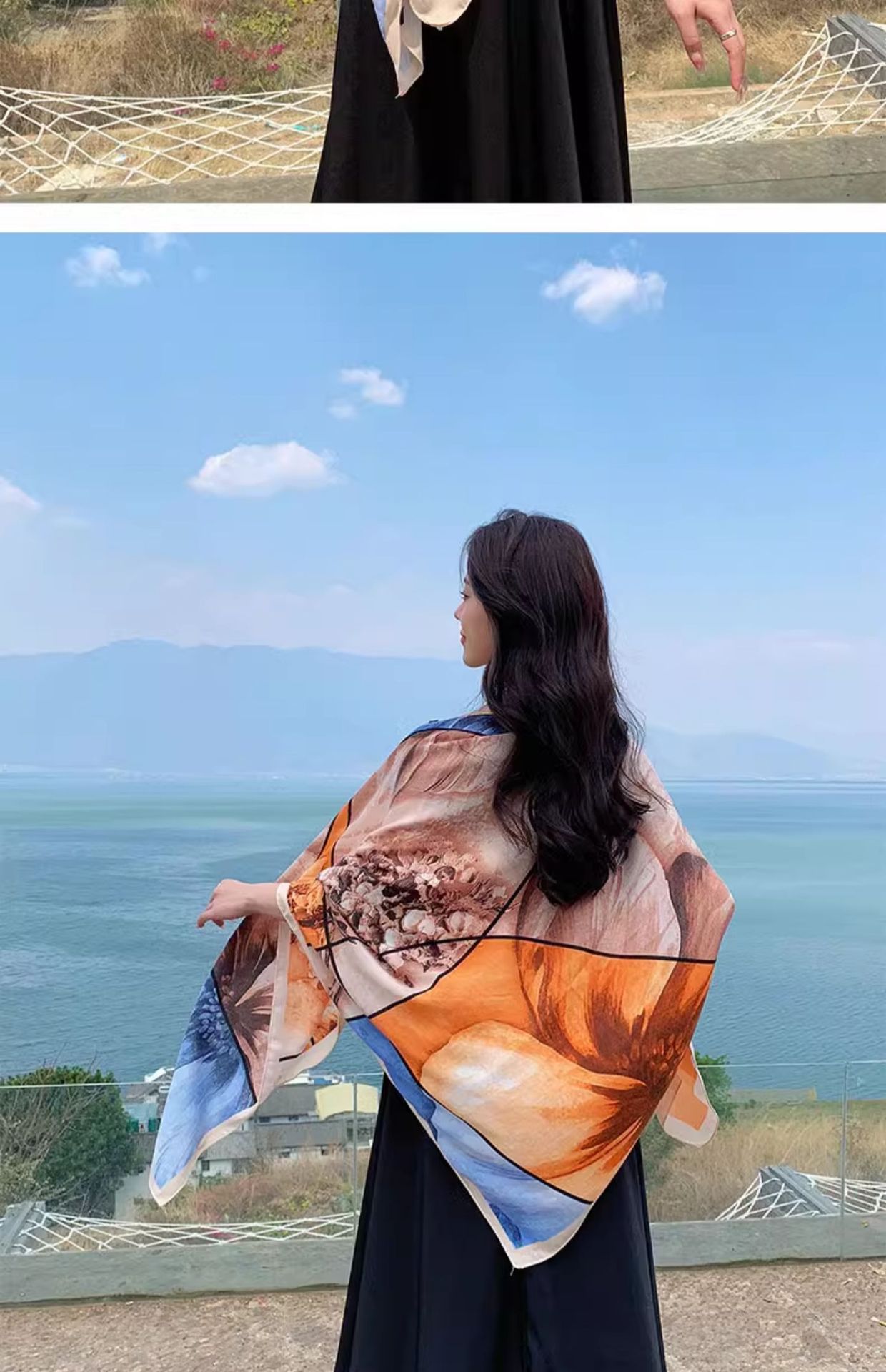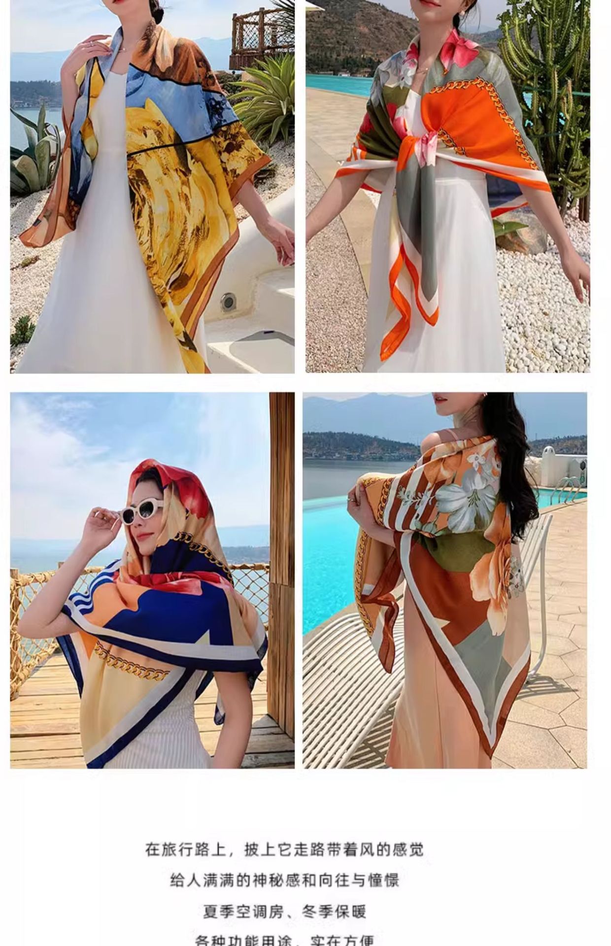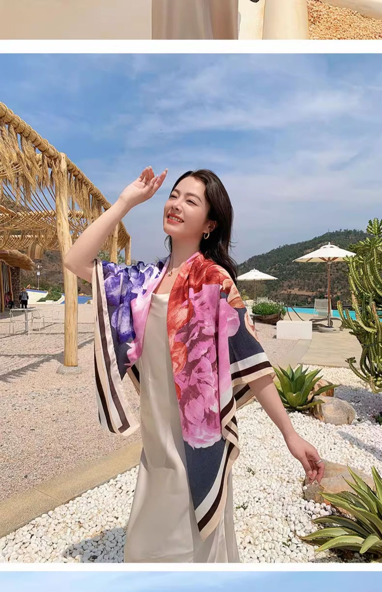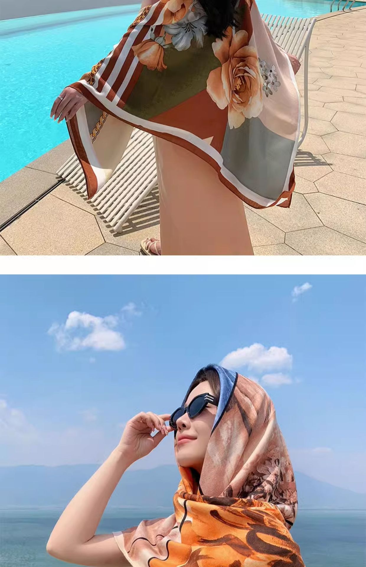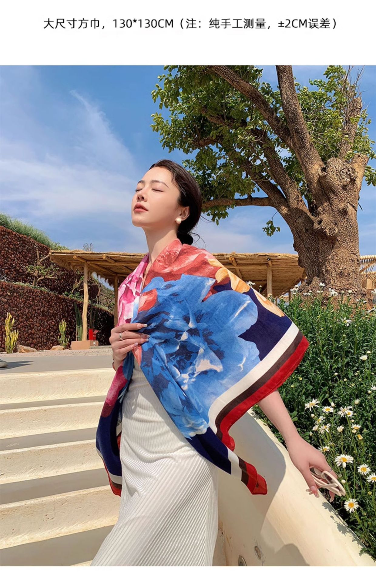휴가 여행 실크 스카프 _ 질감 벨벳 느낌 130_130cm 큰 사각형 스카프 꽃 선 스크린 스카프 목도리 여성