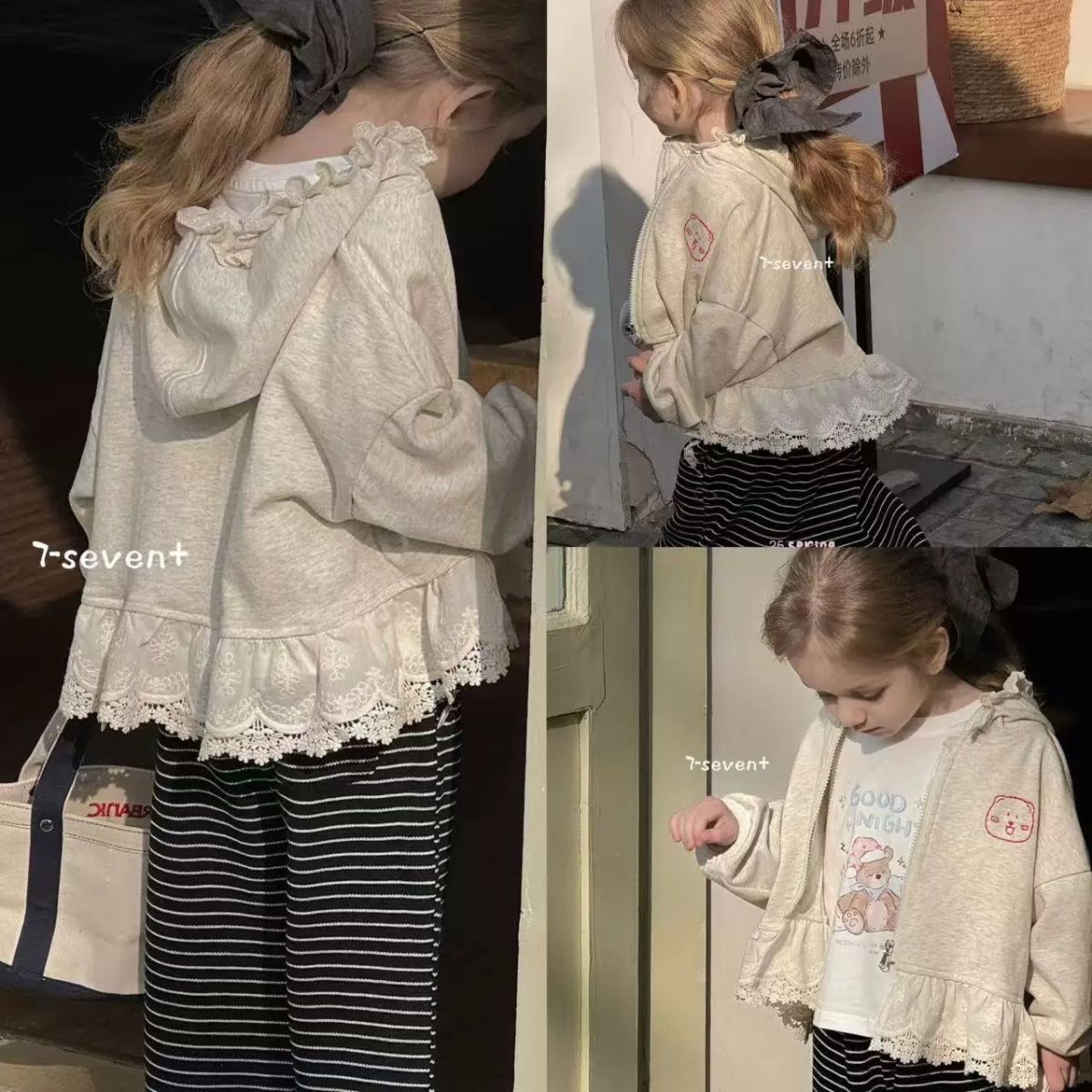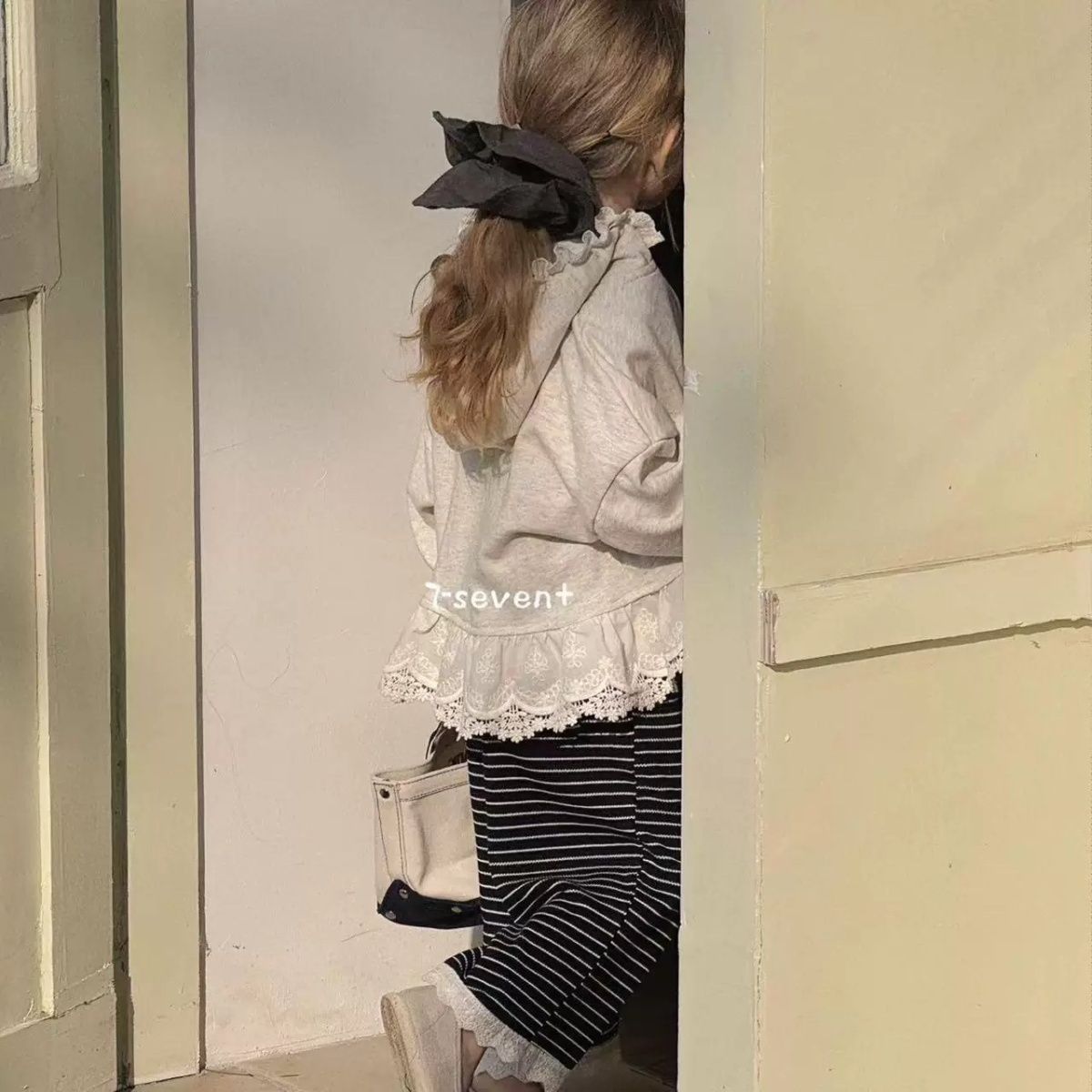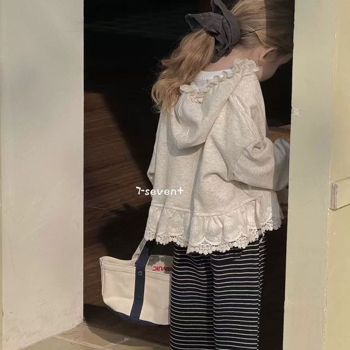 소녀 코트 봄 새 스타일 아기 소녀의 레이스 후드 스웨터 카디건 스트라이프 넓은 다리 바지 투피스 한국어스토어 가기