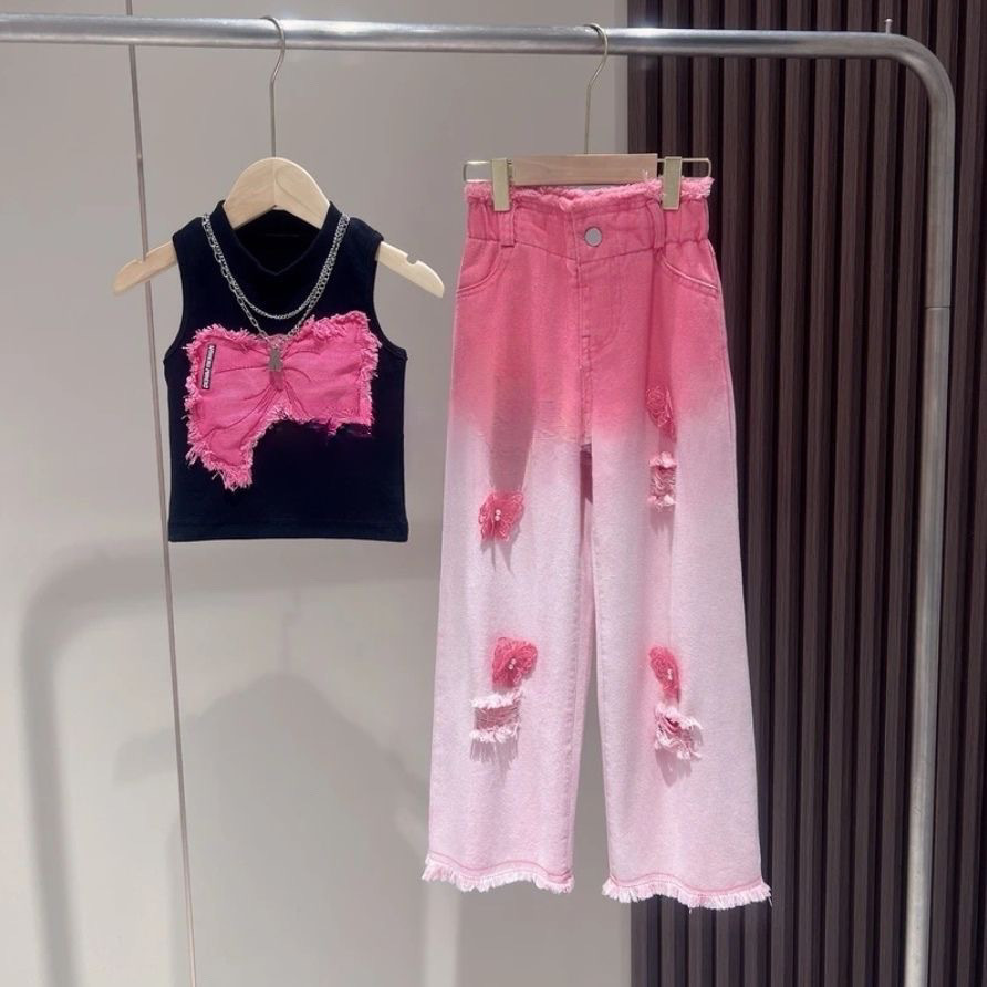 • 흰색 패치 나비 조끼 + 나비 찢어진 바지