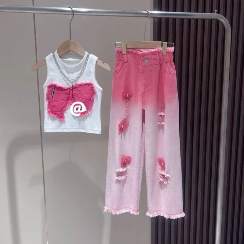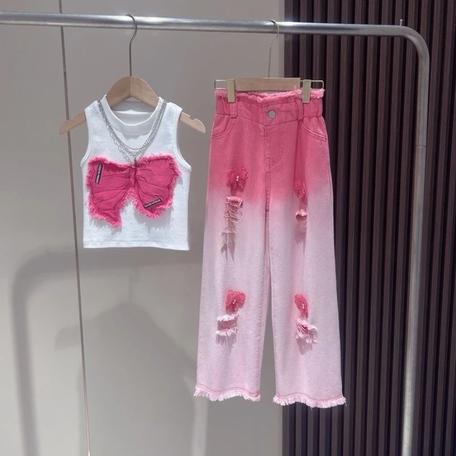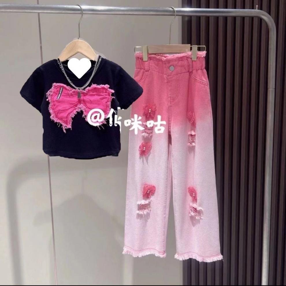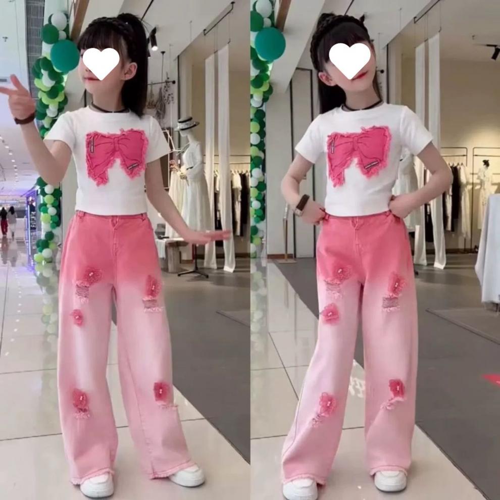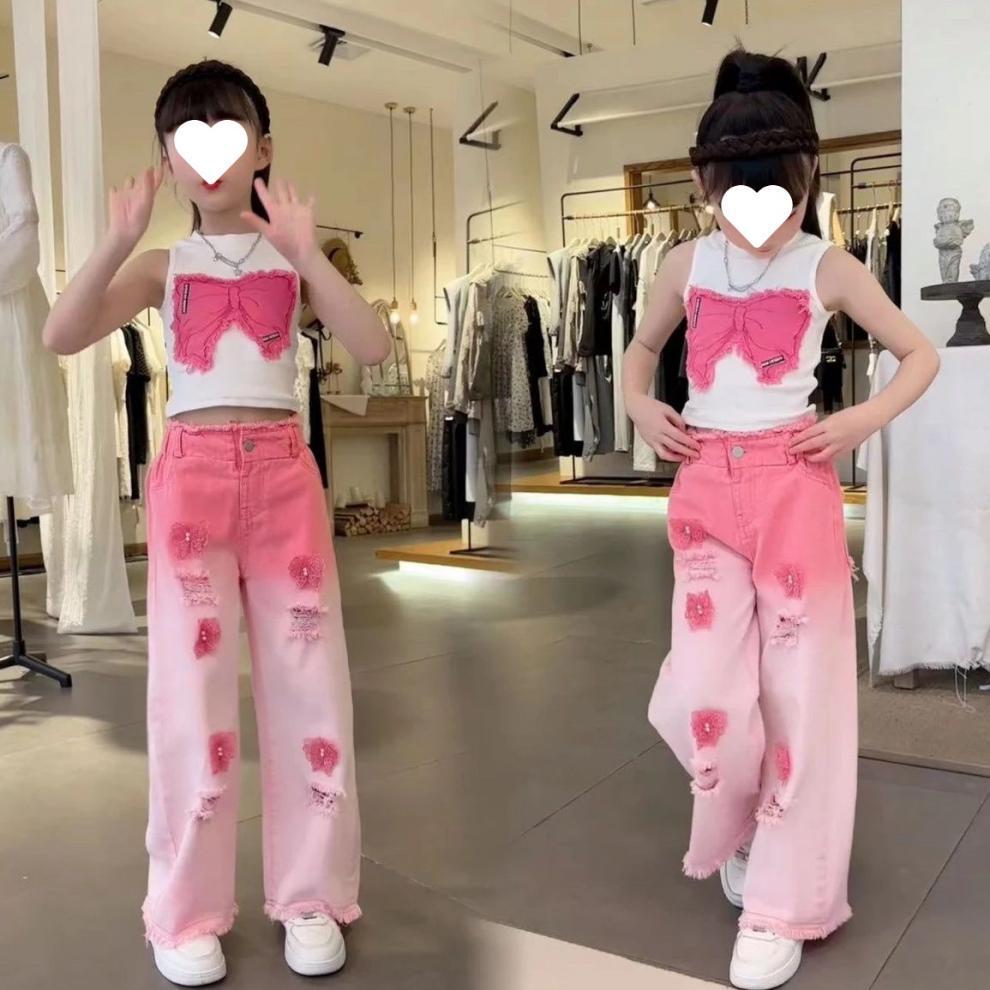 [18000 컬렉션] 여자 여름 세트 2025 폭발 어린이 반팔 찢어진 청바지 투피스 세트