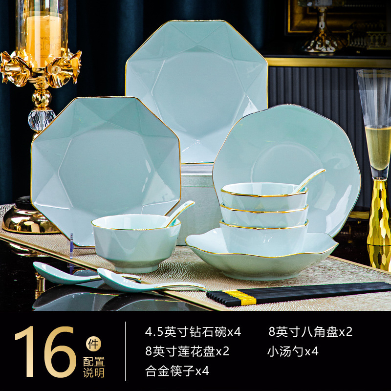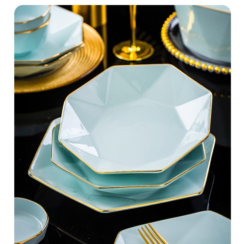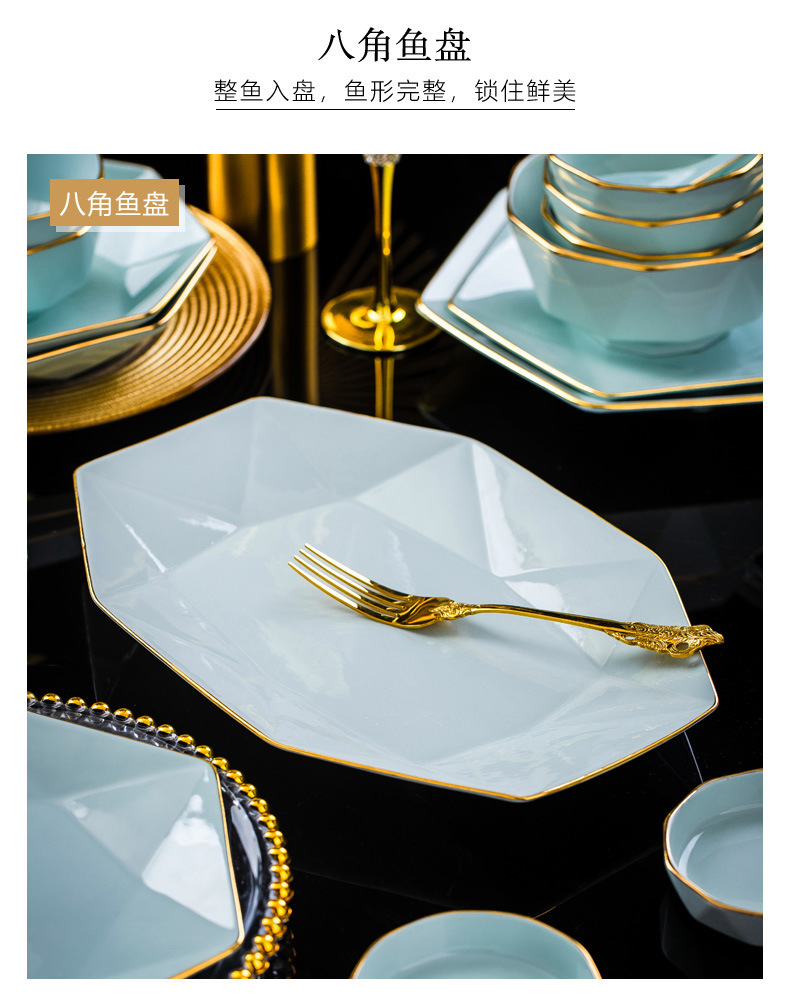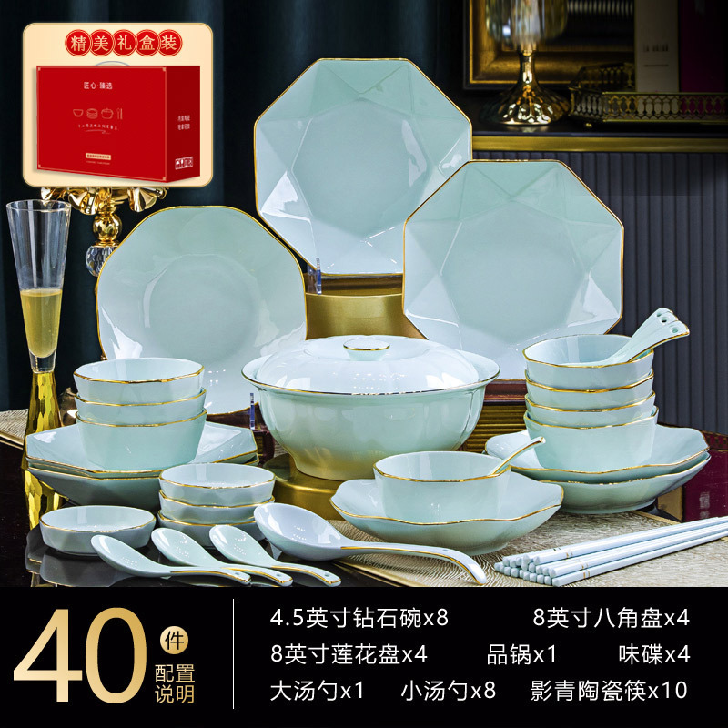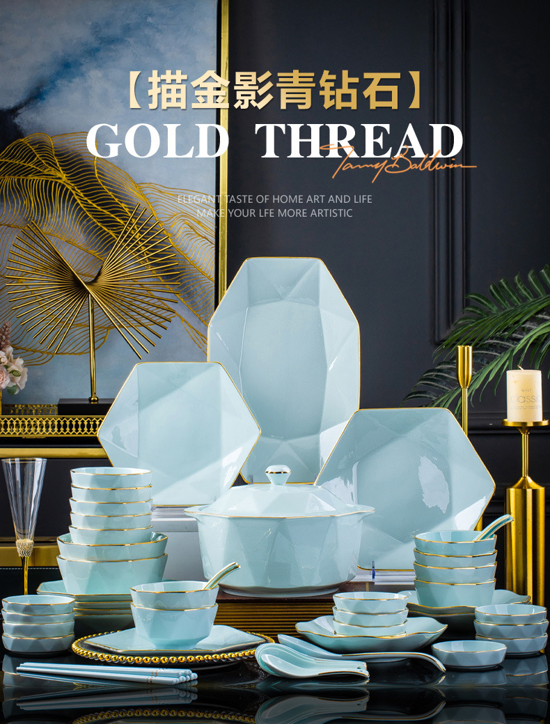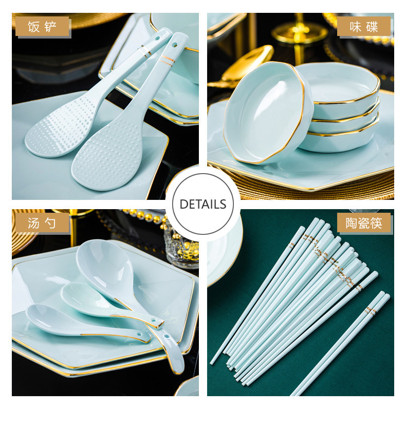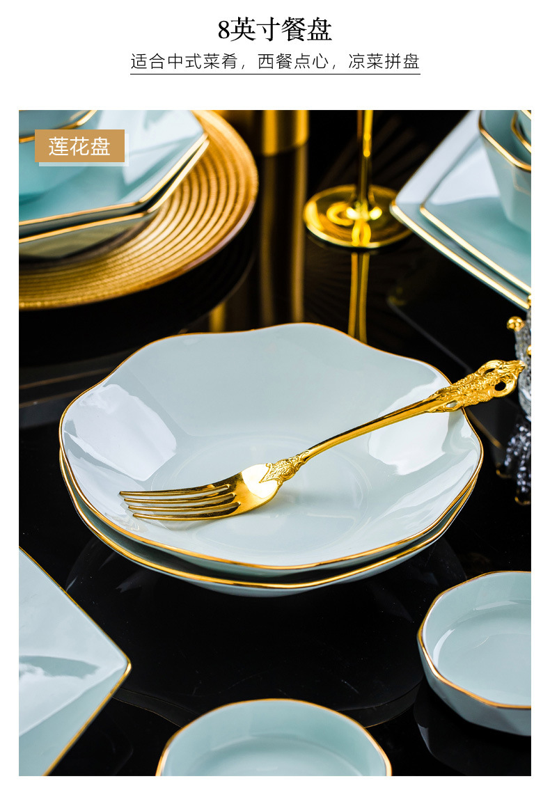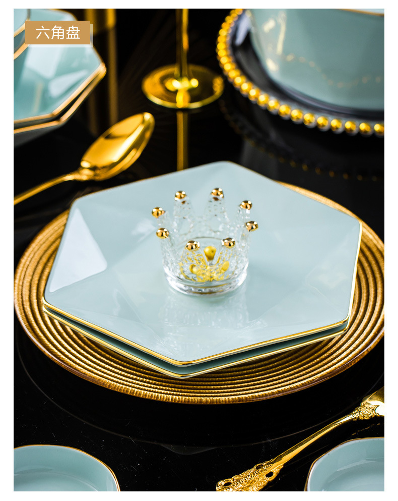 수제 골드 그린 청자 요리와 요리 세트 가정용 식기 세트 세라믹 고급 센스 보울과 집들이 선물을위한 접시 젓가락