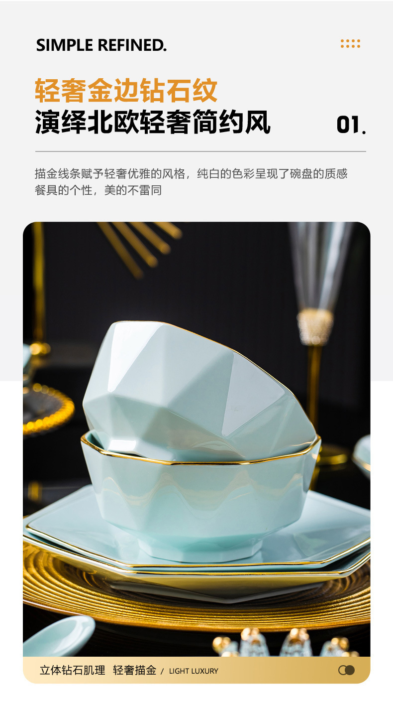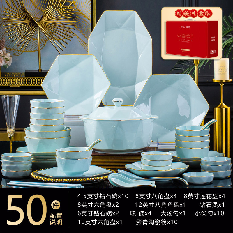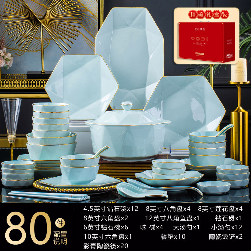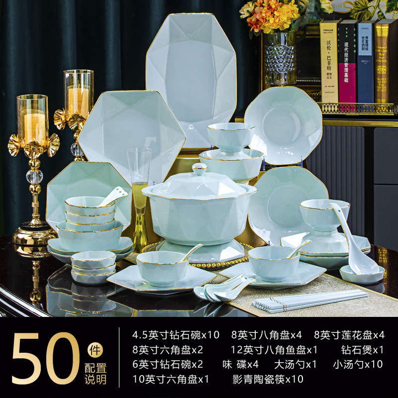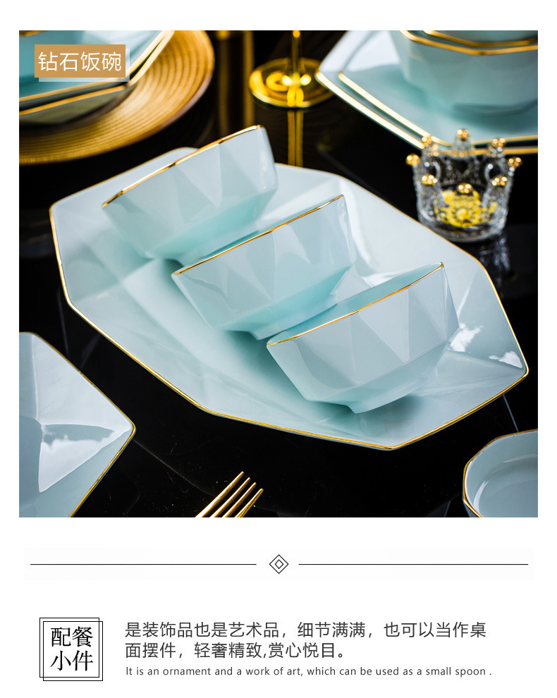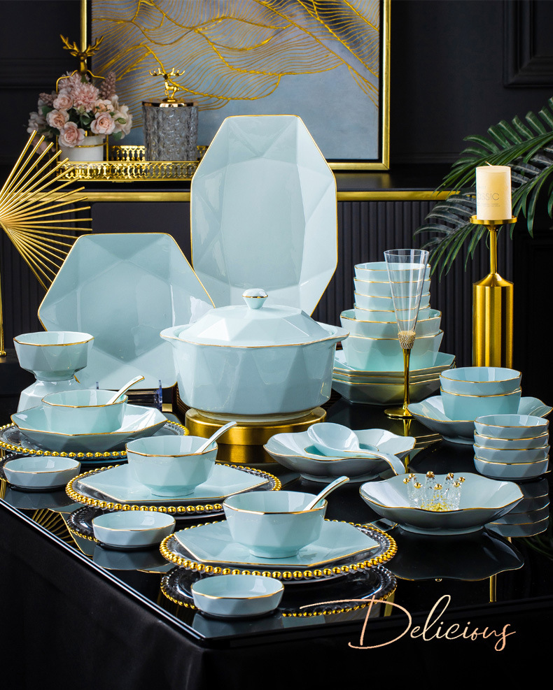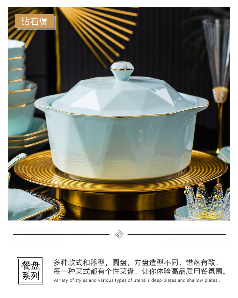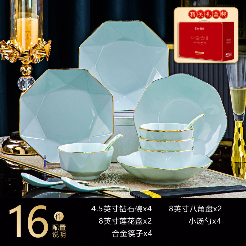 수제 골드 그린 청자 요리와 요리 세트 가정용 식기 세트 세라믹 고급 센스 보울과 집들이 선물을위한 접시 젓가락