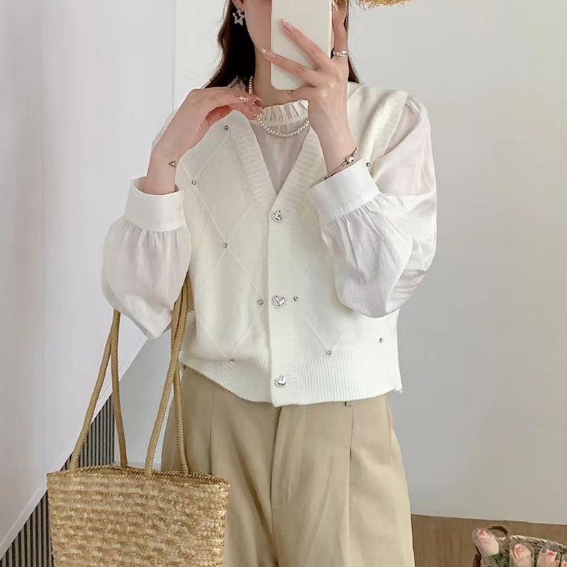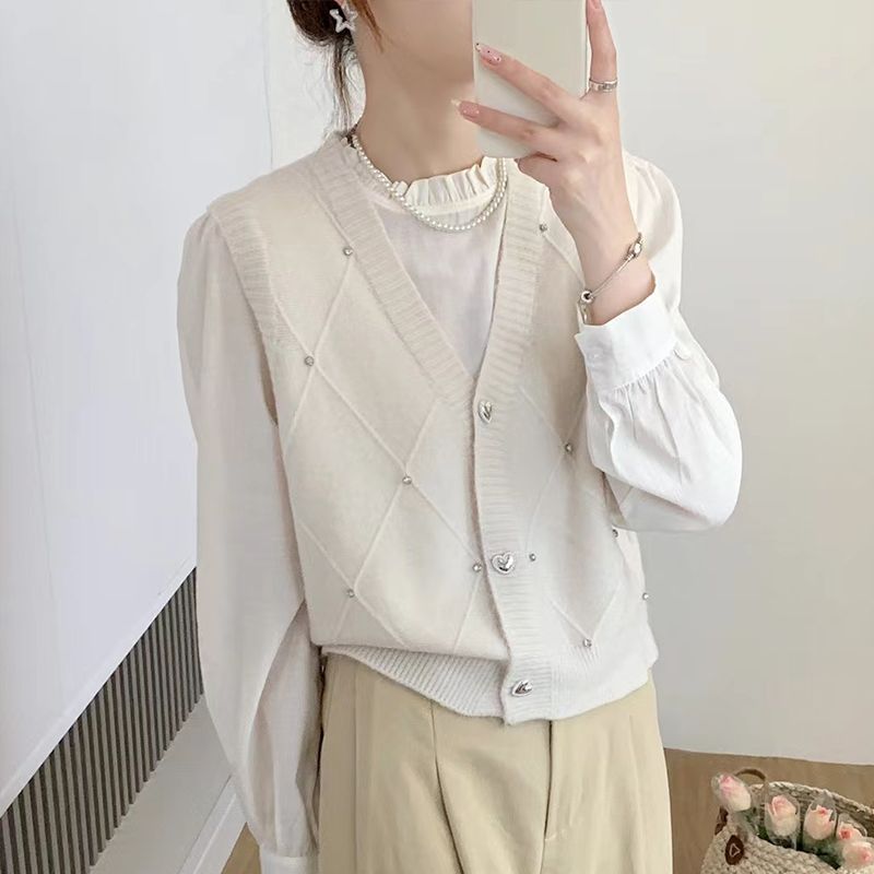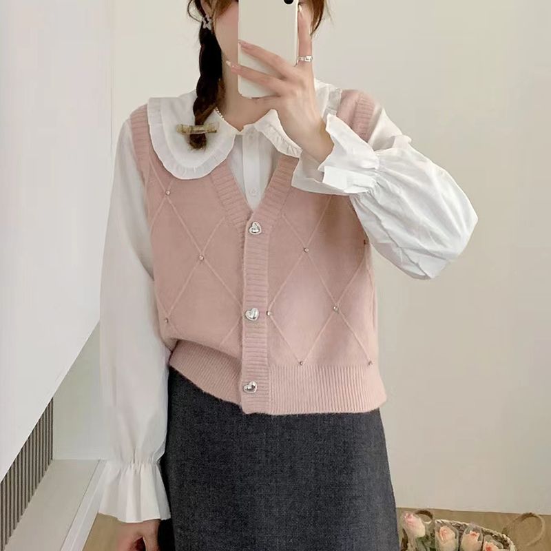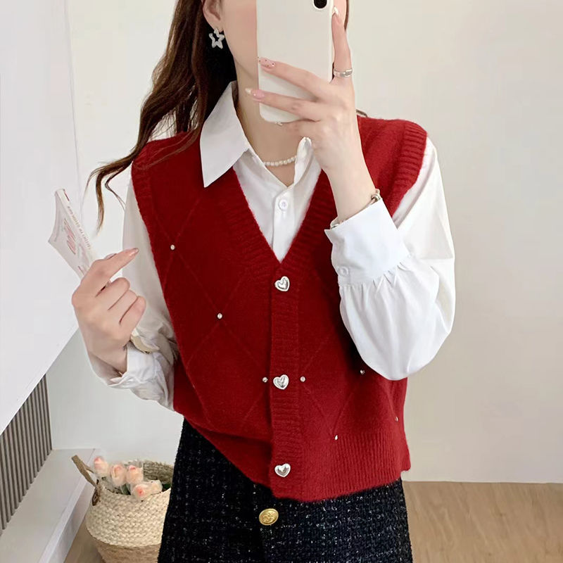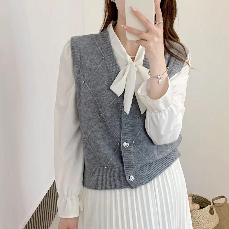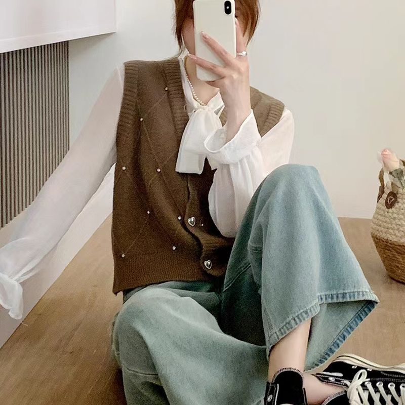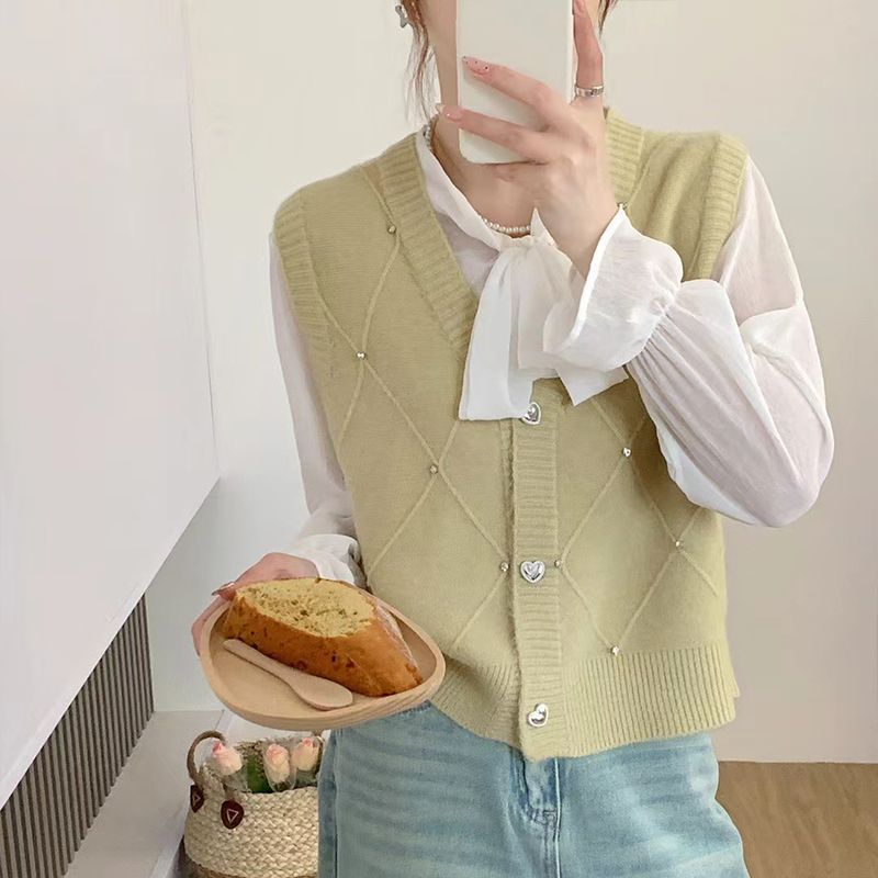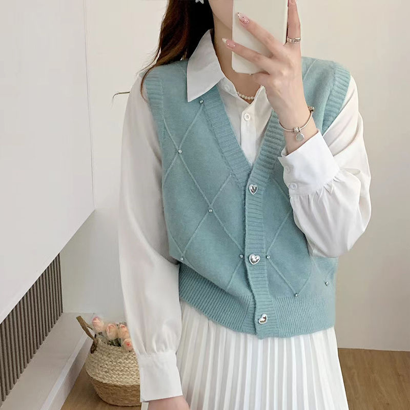 패션 세련된 V 넥 싱글 브레스트 카디건 조끼 여성 조끼 봄과 가을 올 매치 느슨한 민소매 스웨터 니트 캐넌스토어 가기