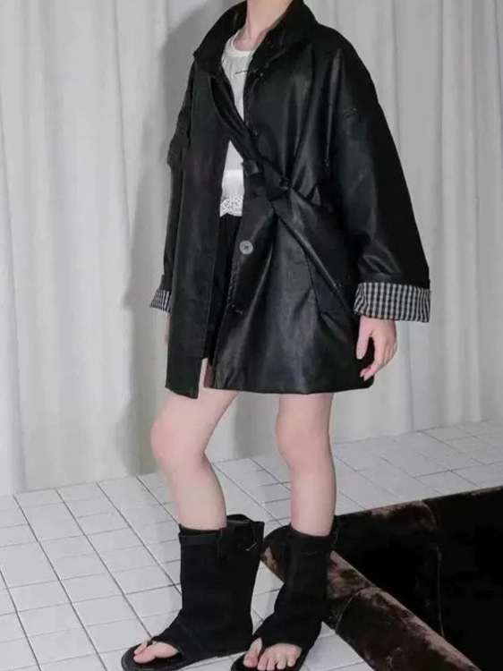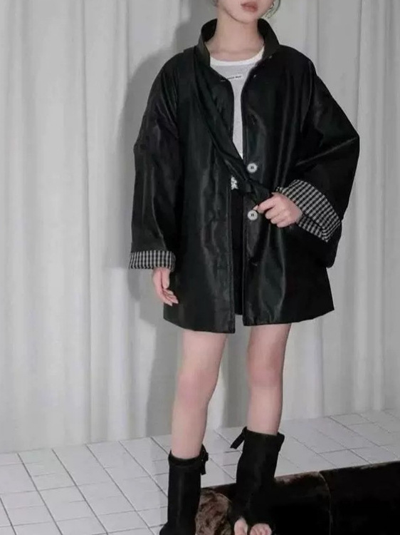 소녀 가죽 코트 봄과 가을 2025 새로운 대형 어린이 격자 무늬 PU 재킷 Stylik 중간 길이 탑스토어 가기