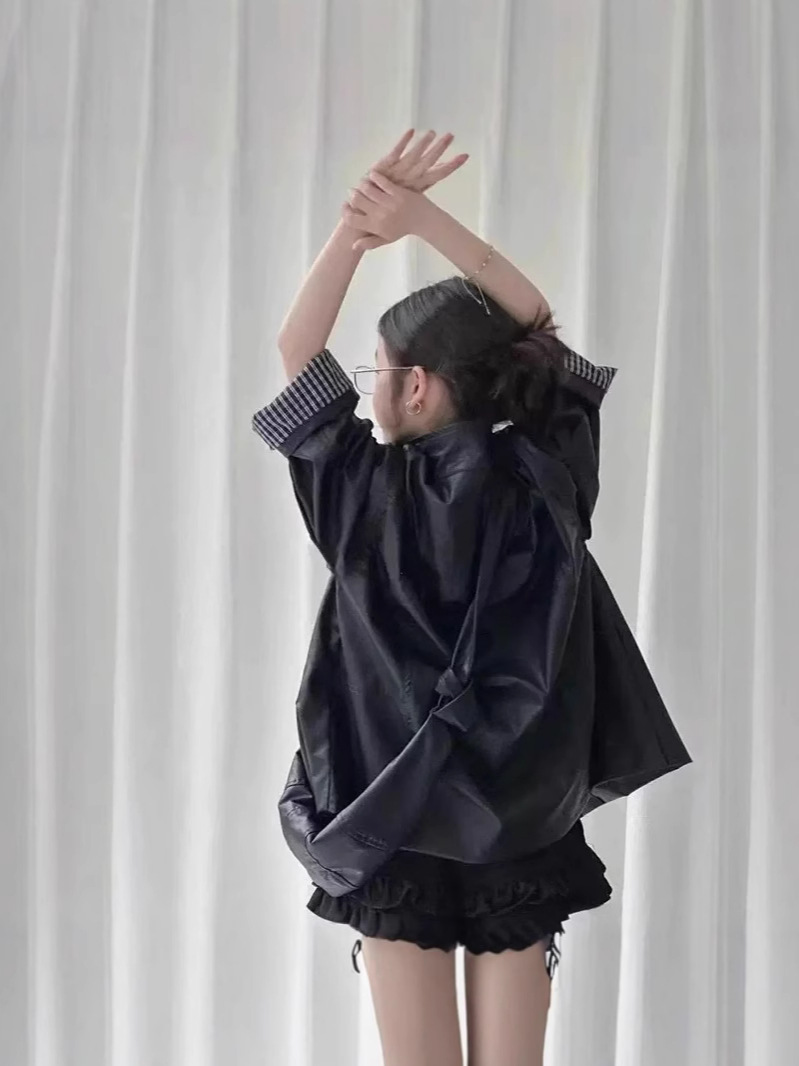 소녀 가죽 코트 봄과 가을 2025 새로운 대형 어린이 격자 무늬 PU 재킷 Stylik 중간 길이 탑