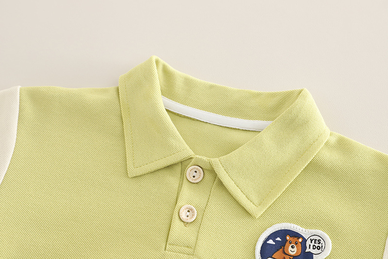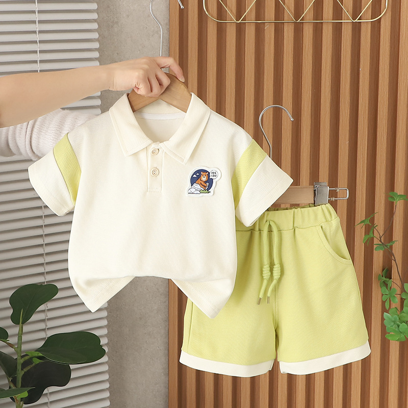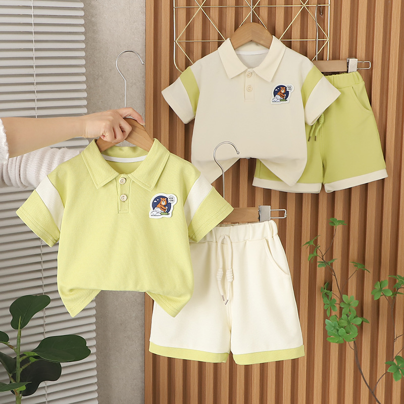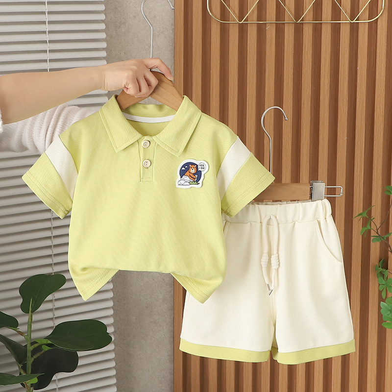 2025 년 새 여름 한국판 옷깃 곰 짧은 소매 어린이 세트 소년 투피스 반바지 아동복 세대
