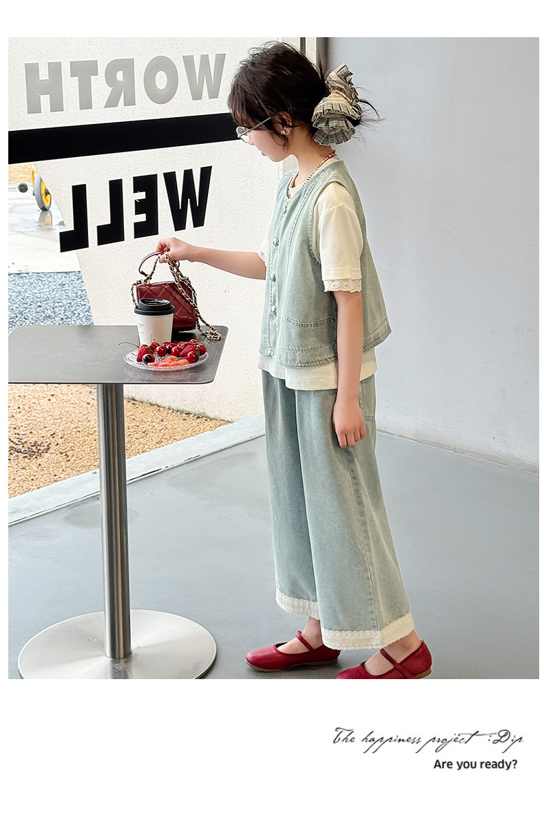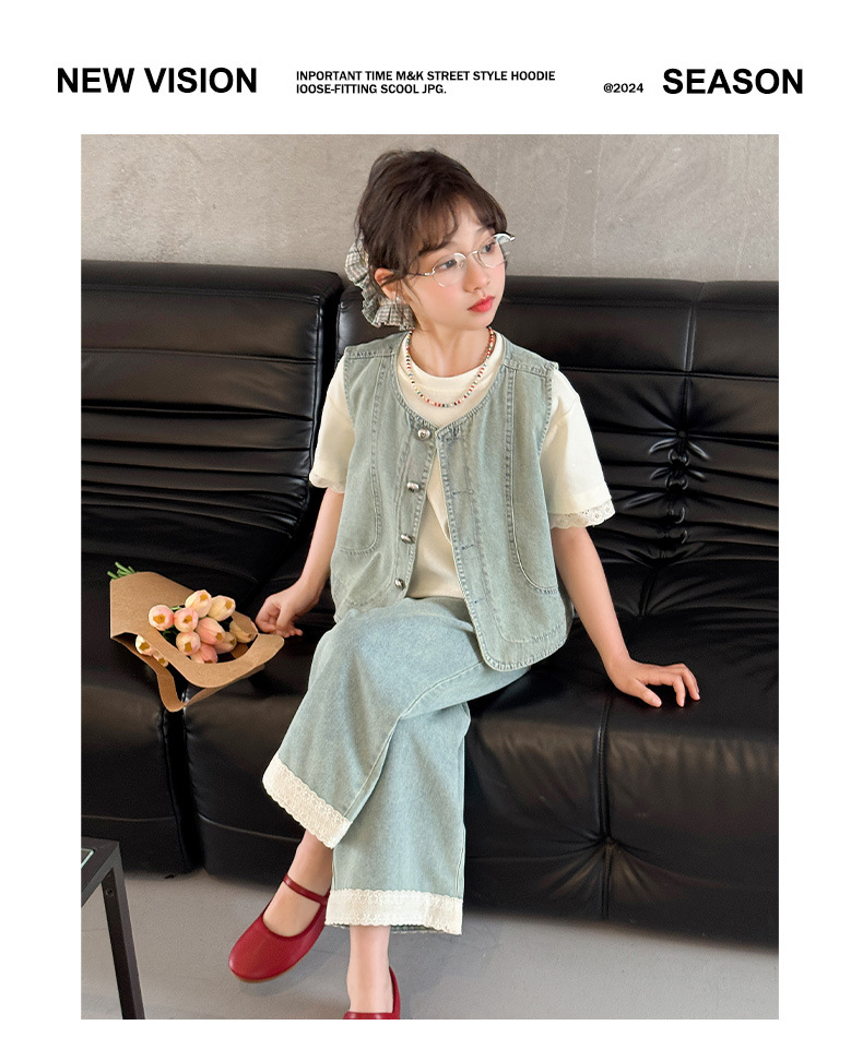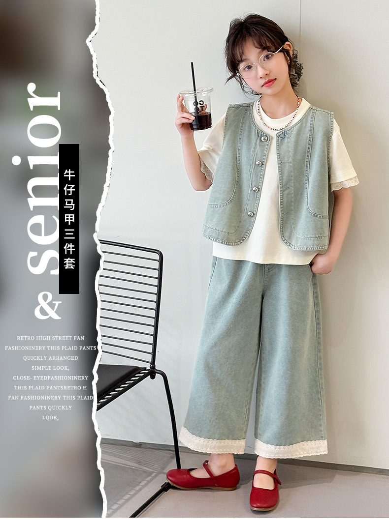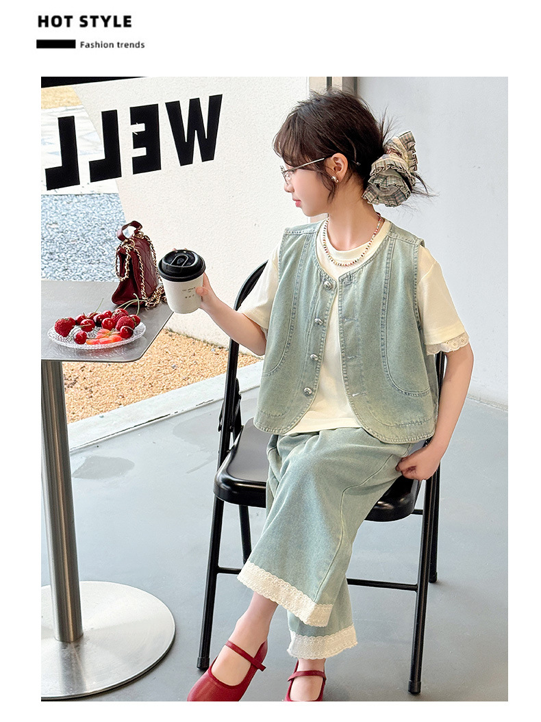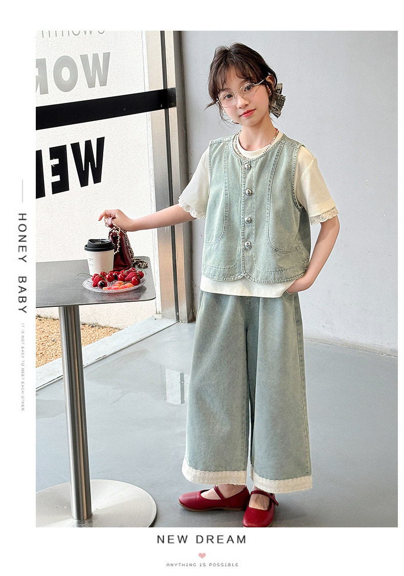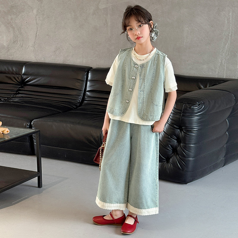 소녀 데님 조끼 세트 봄과 가을 2025 새로운 CUHK 어린이 여름 외국 스타일 짧은 소매 청바지 3 조각 세트