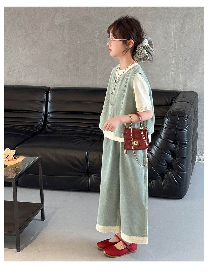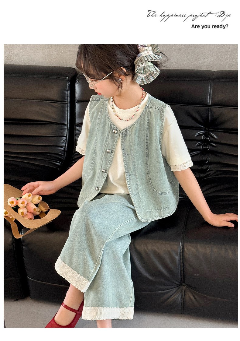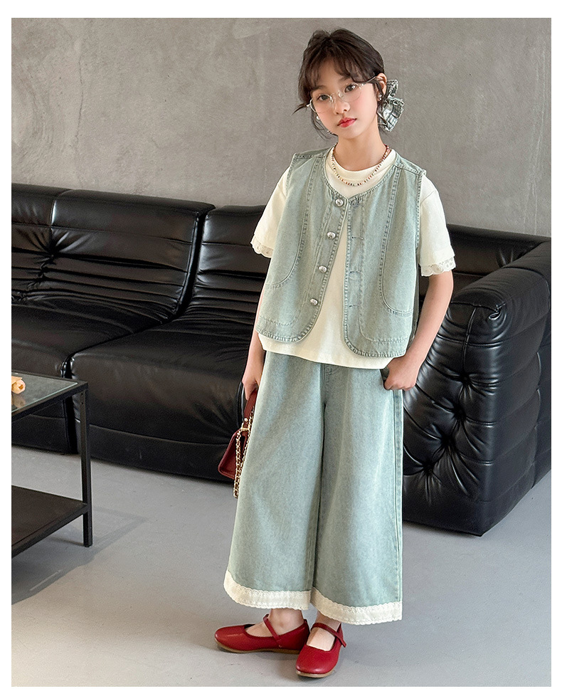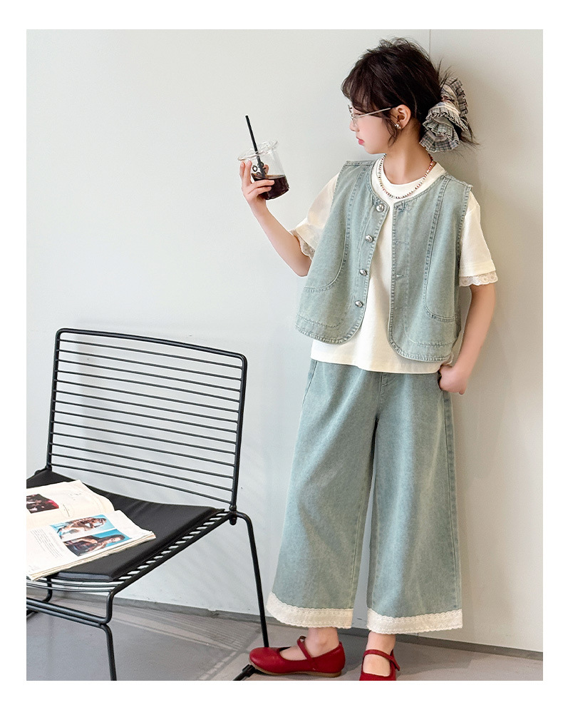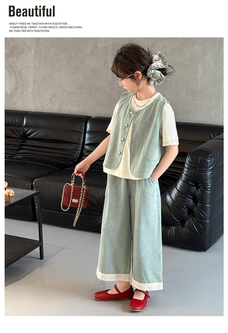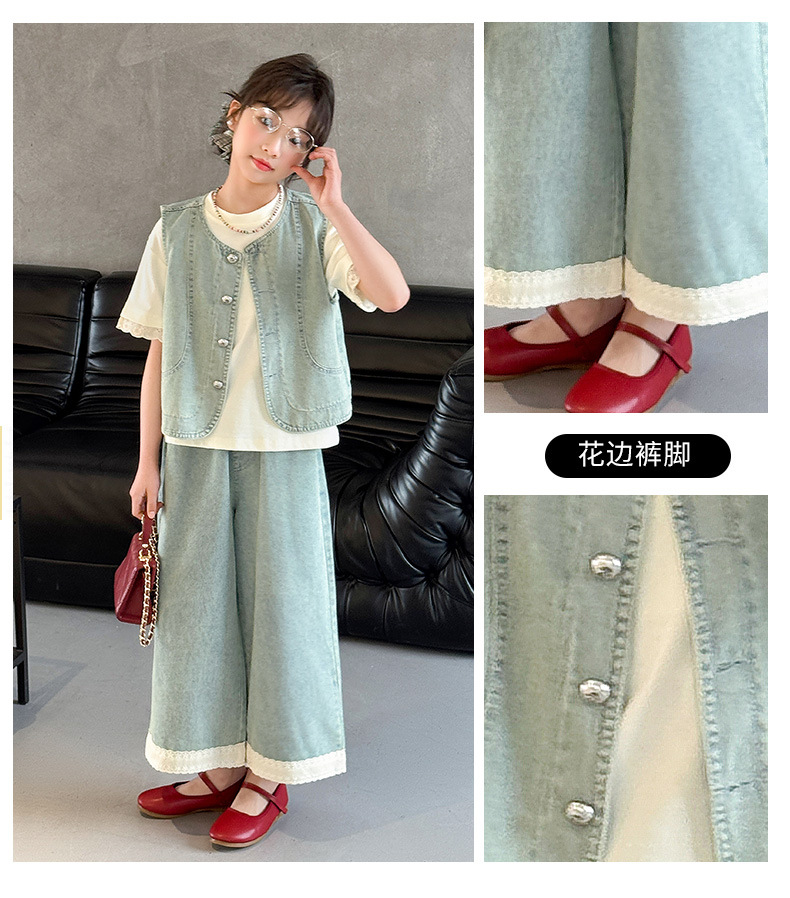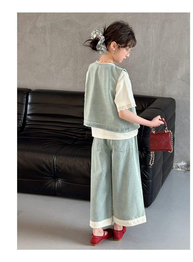 소녀 데님 조끼 세트 봄과 가을 2025 새로운 CUHK 어린이 여름 외국 스타일 짧은 소매 청바지 3 조각 세트