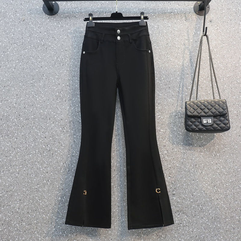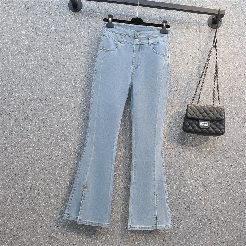 플러스 사이즈 청바지 여성의 2025 년 봄과 가을 새로운 스타일 약간 통통녀 스타일 높은 허리 슬리밍 분할 캐주얼 마이크로 플레어 바지스토어 가기