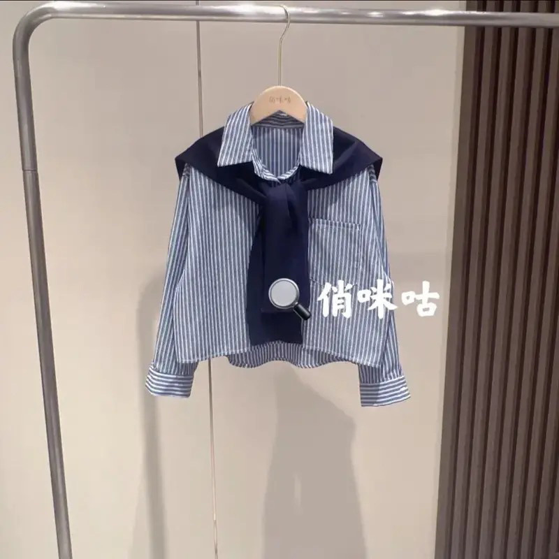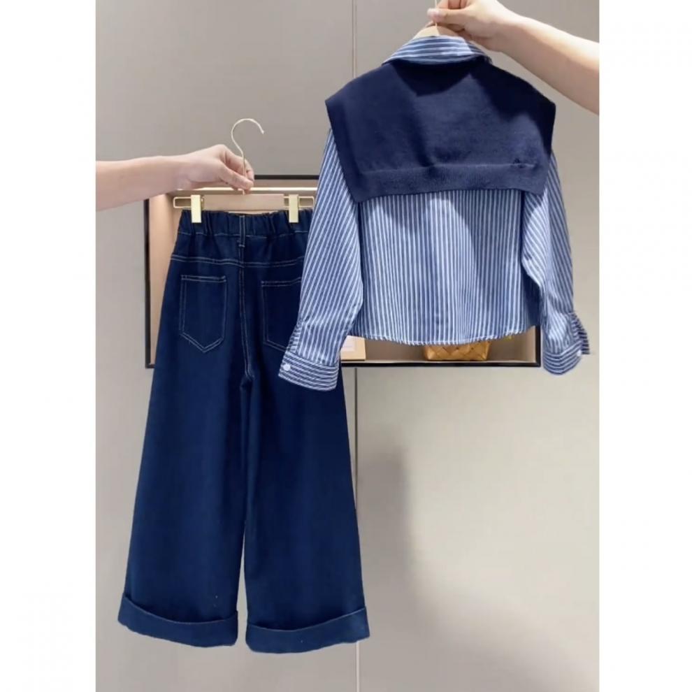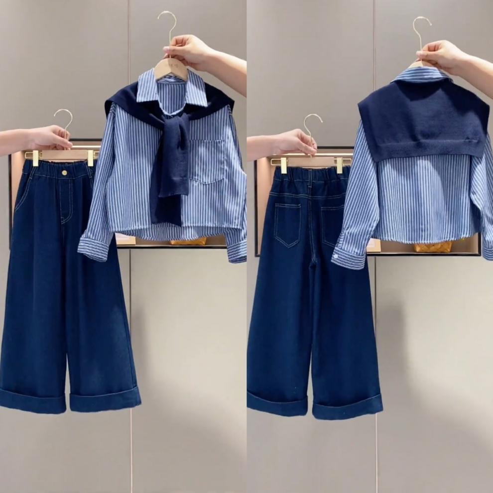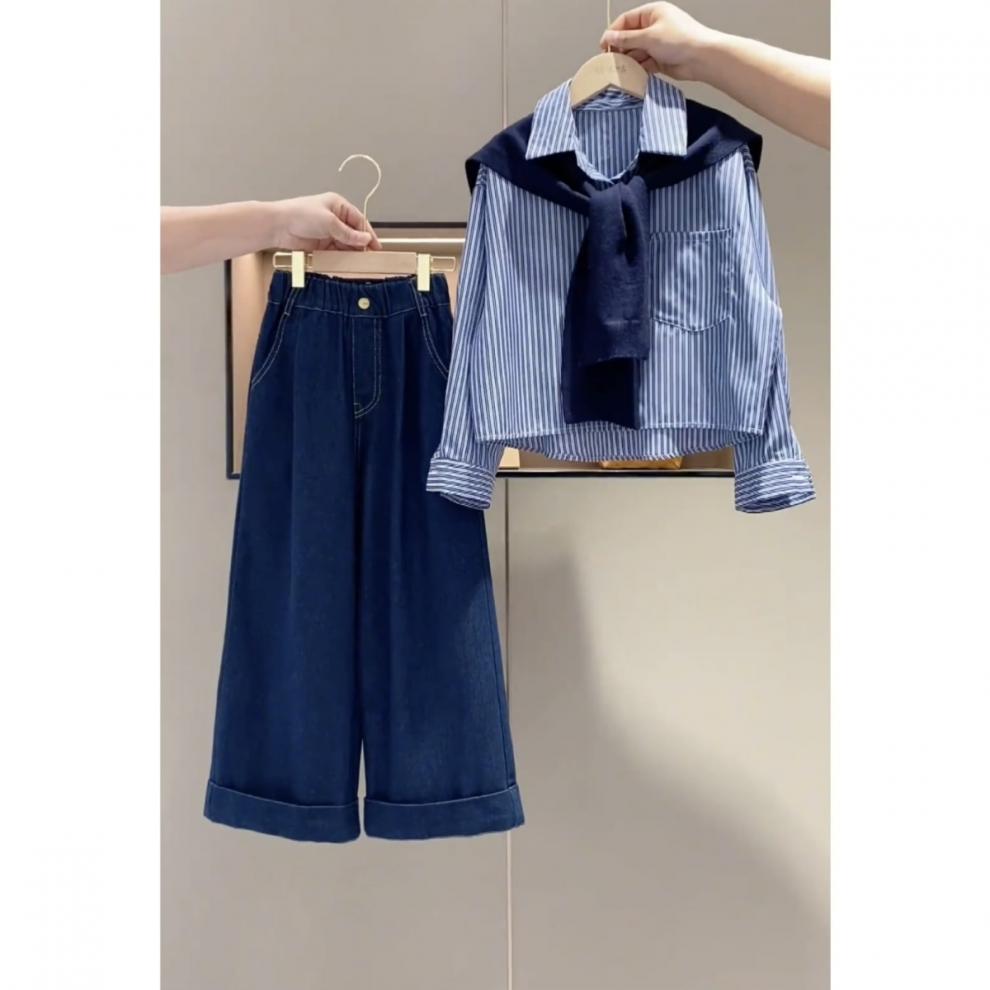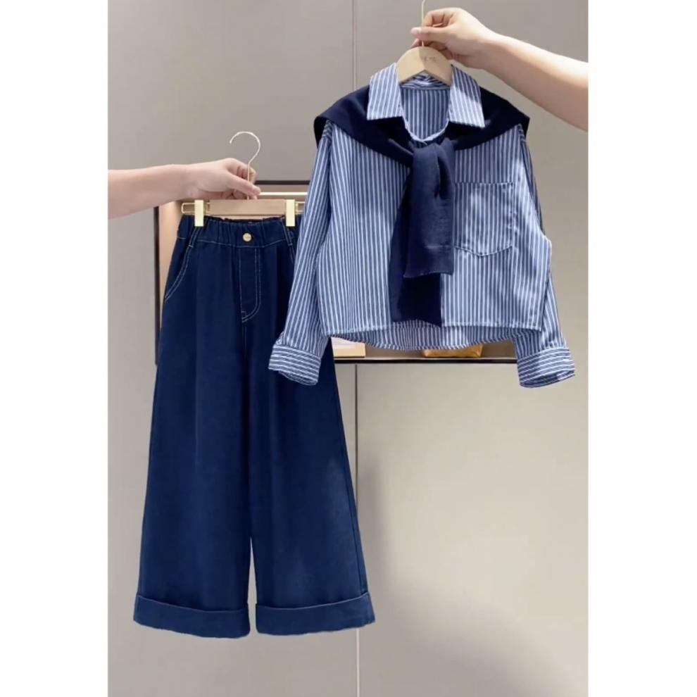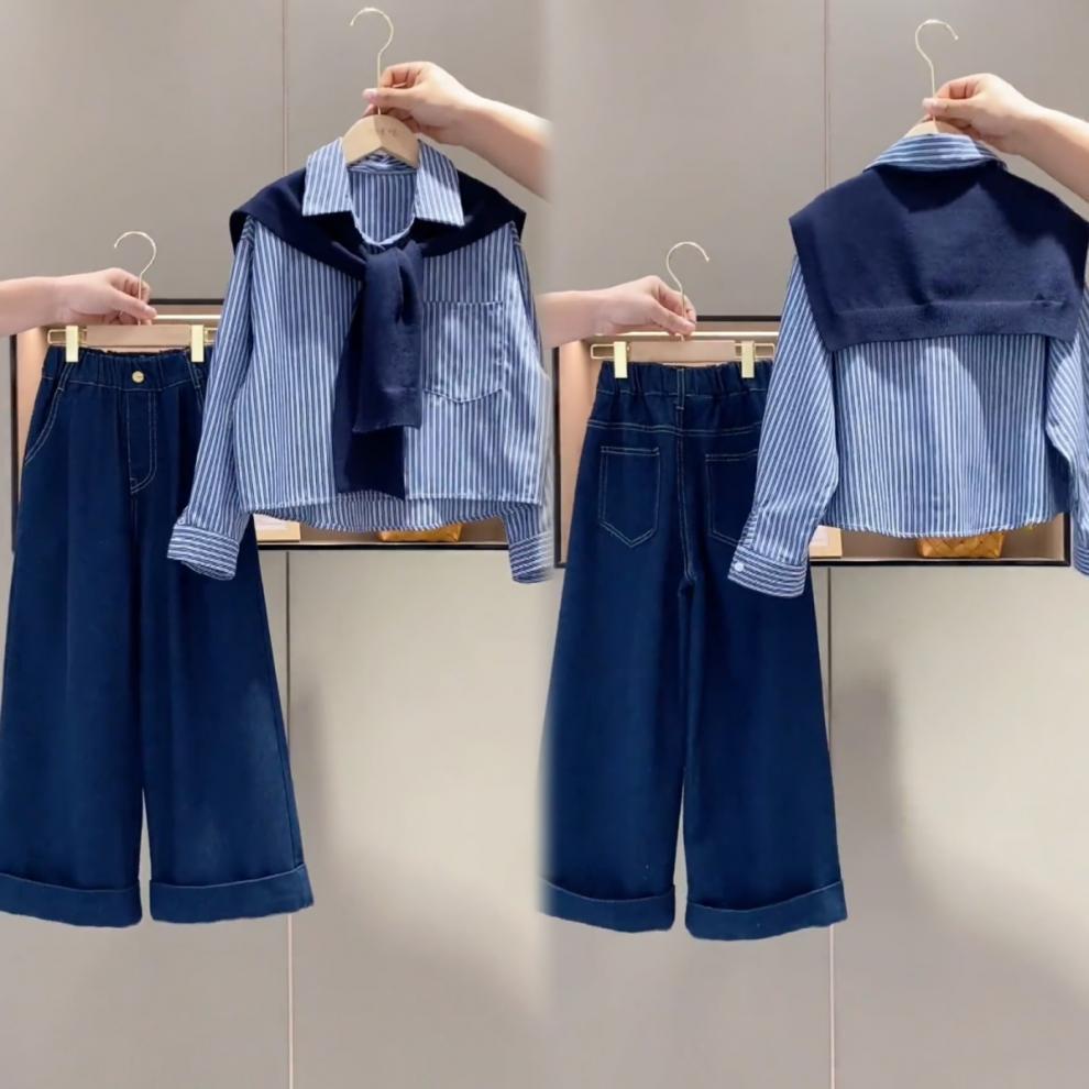소녀의 봄과 가을 세트 2025 봄 새로운 유행 중 큰 어린이 줄무늬 셔츠 소녀 스타일 청바지 투피스 세트스토어 가기