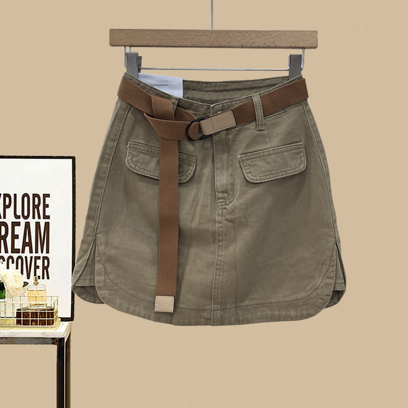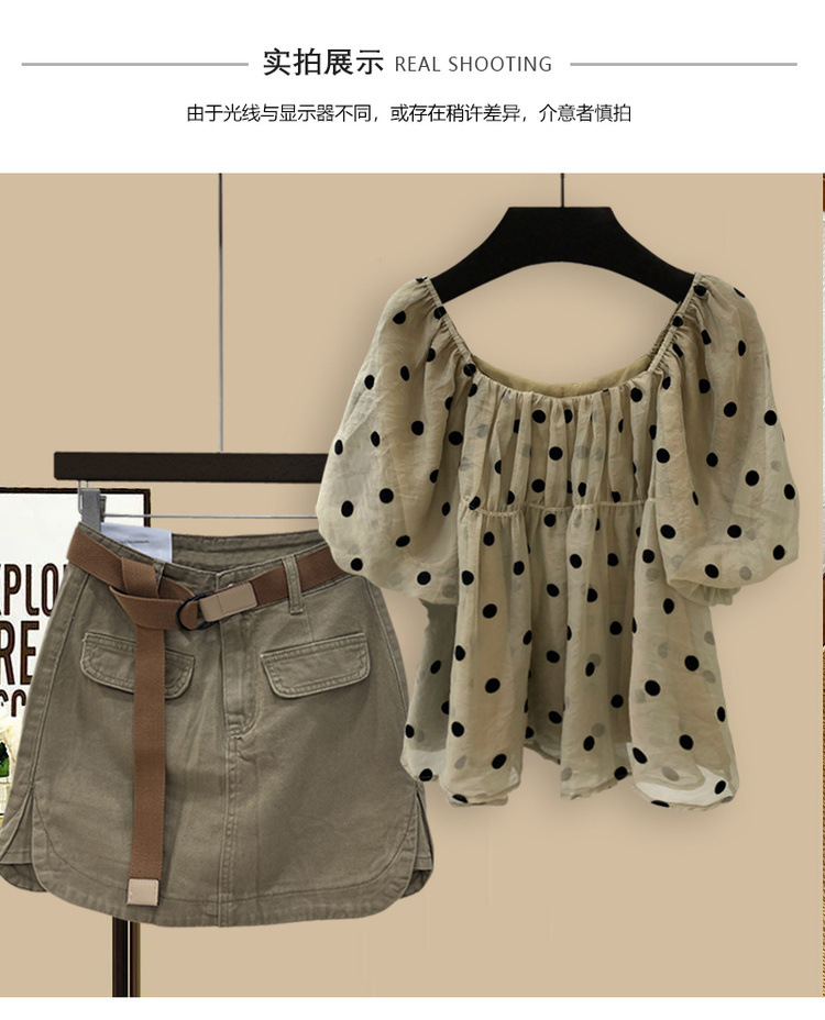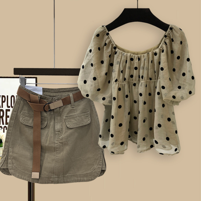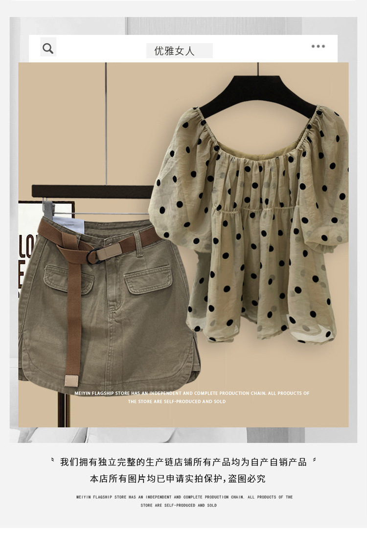 2025 년 여름 새 도착 한 캐릭터 칼라 폴로 도트 셔츠 여자 쉬폰 반팔 유행 올 매치 카키 원피스 투피스 세트