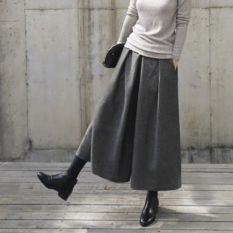 가을과 겨울 새로운 탄성 허리 모직 천 스커트 바지 느슨한 넓은 다리 바지 울 크롭 바지 양모 바지 두껍게 슬림