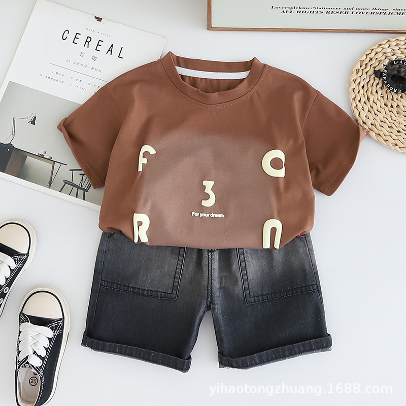 2025 소년 정장 여름 반팔 새 스타일 인쇄 된 편지 티셔츠 어린이 여름 옷 잘 생긴 한국 스타일 아동복스토어 가기