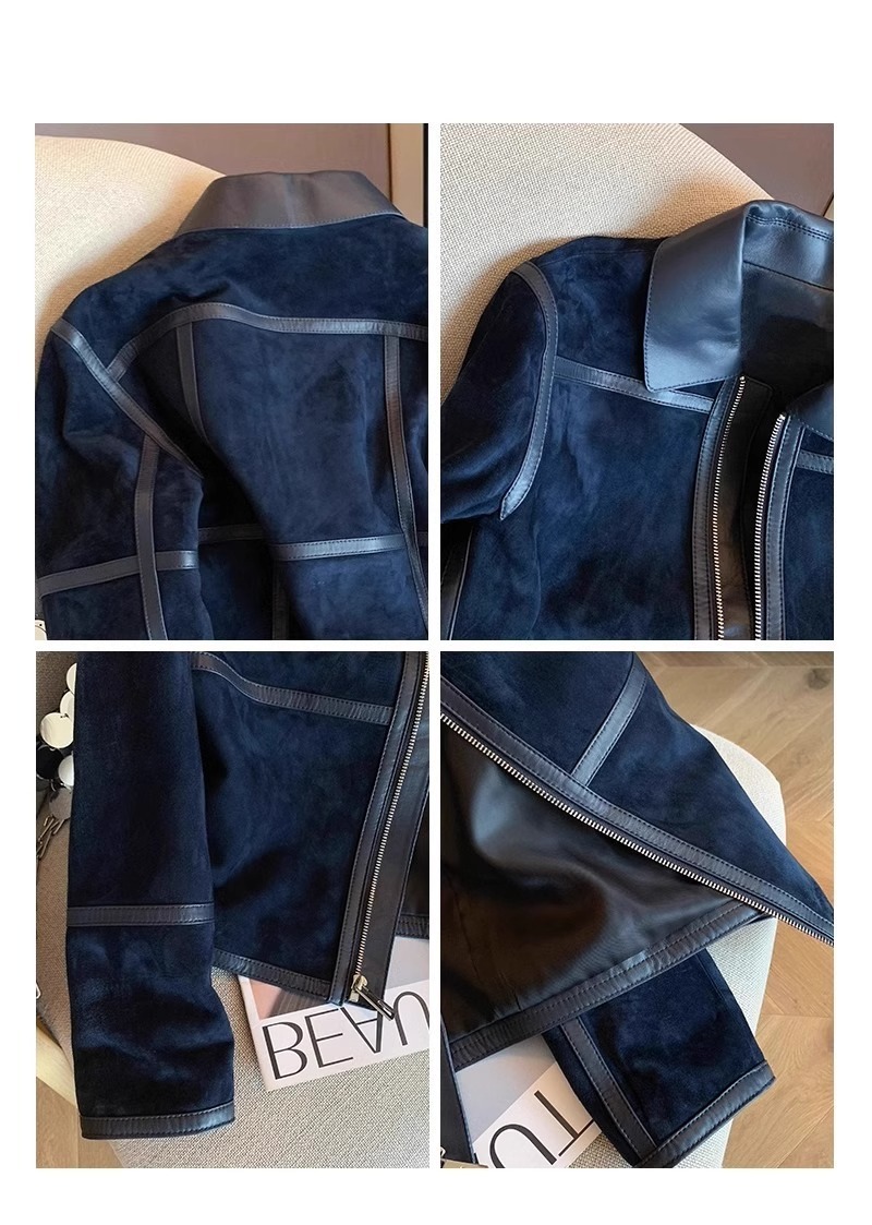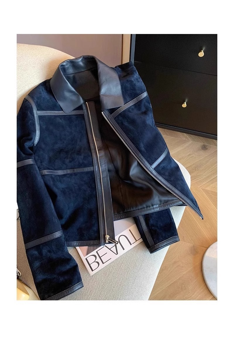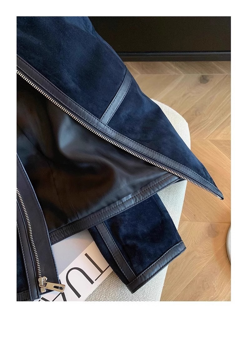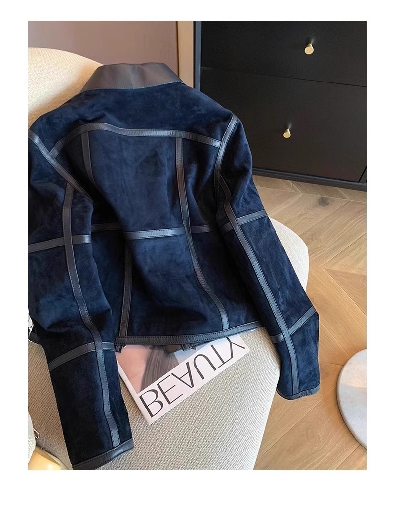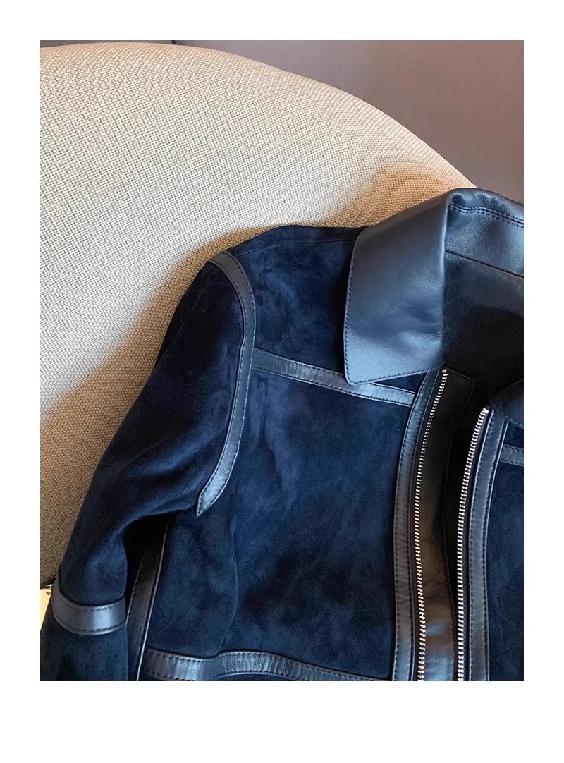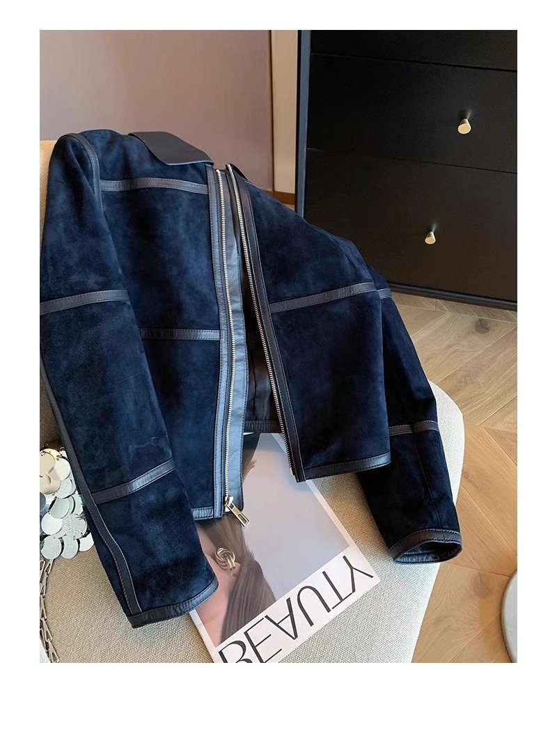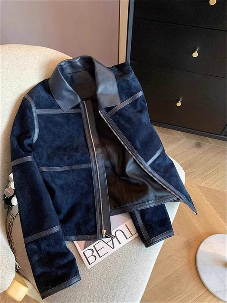 미국식 하이 엔드 숨겨진 블루 스웨이드 우아한 코트 여성용 올드 머니 스타일 레트로 하이 엔드 가죽 옷깃 재킷 트렌디