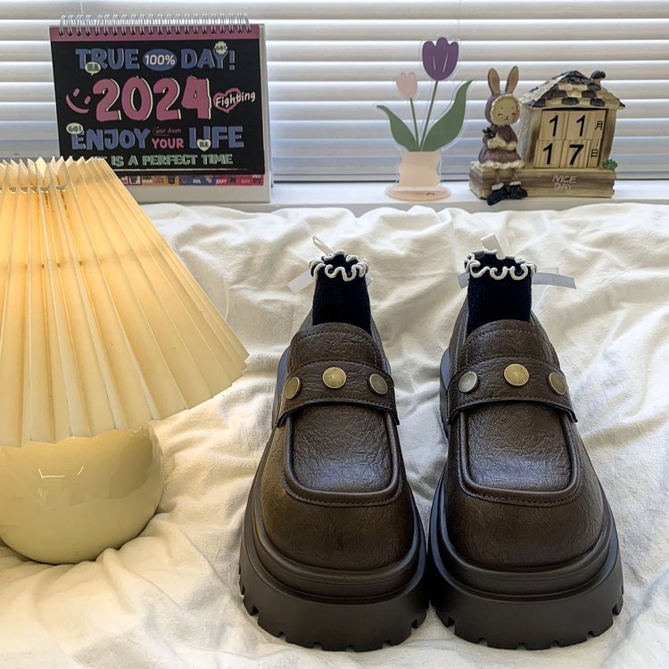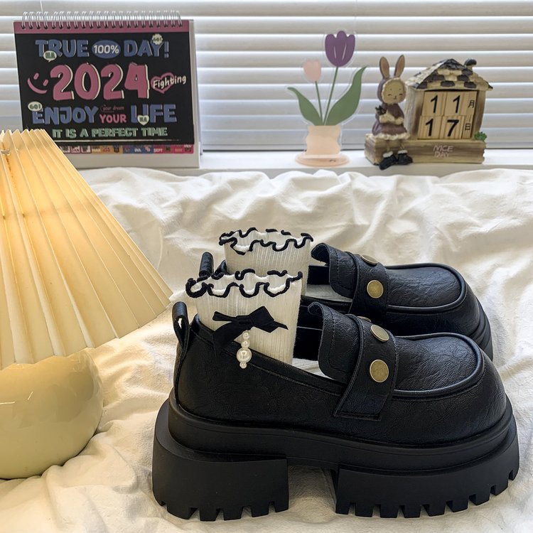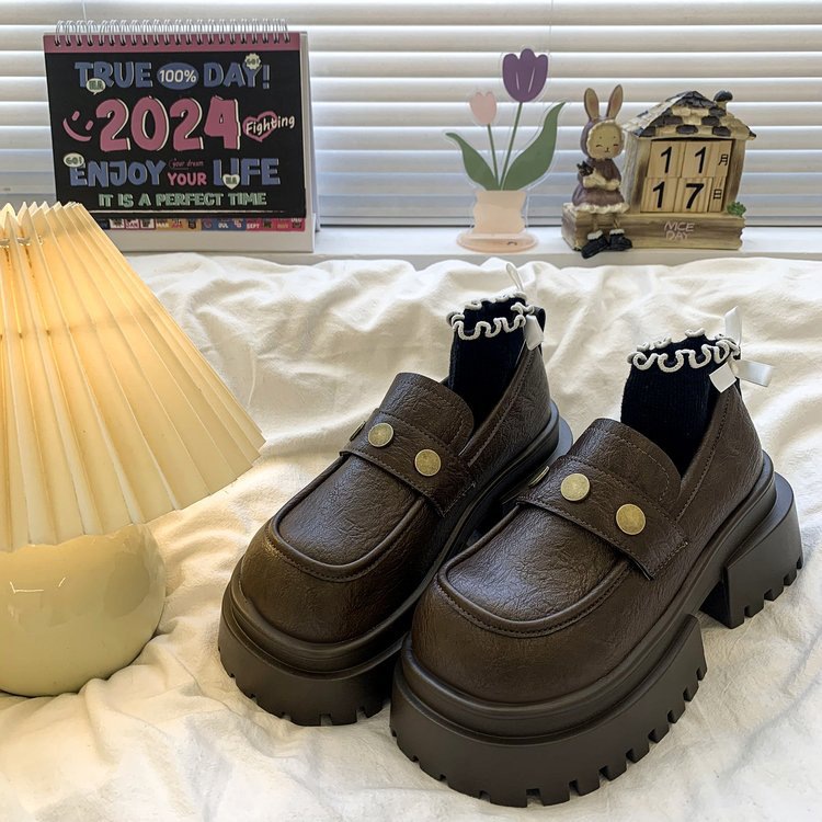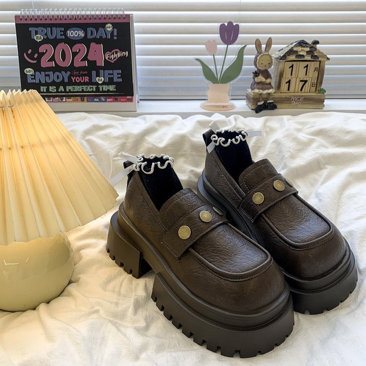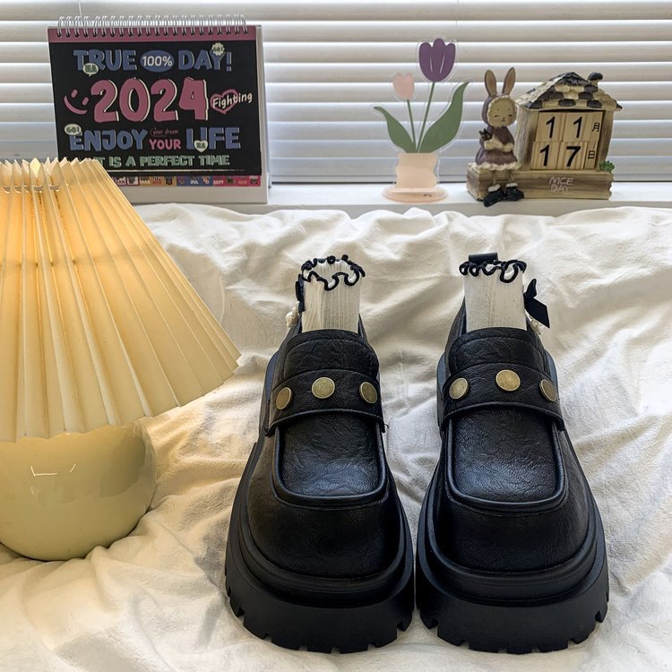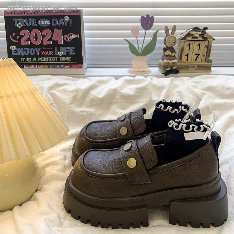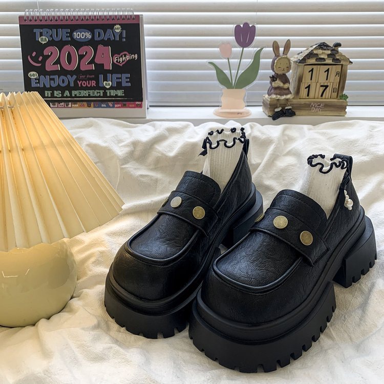 빈티지 블랙 빅 헤드 증가 두꺼운 밑창 여성 신발 2025 봄 새로운 올 매치 Lefu 싱글 레이어 신발 영국 스타일 작은 가죽 신발스토어 가기