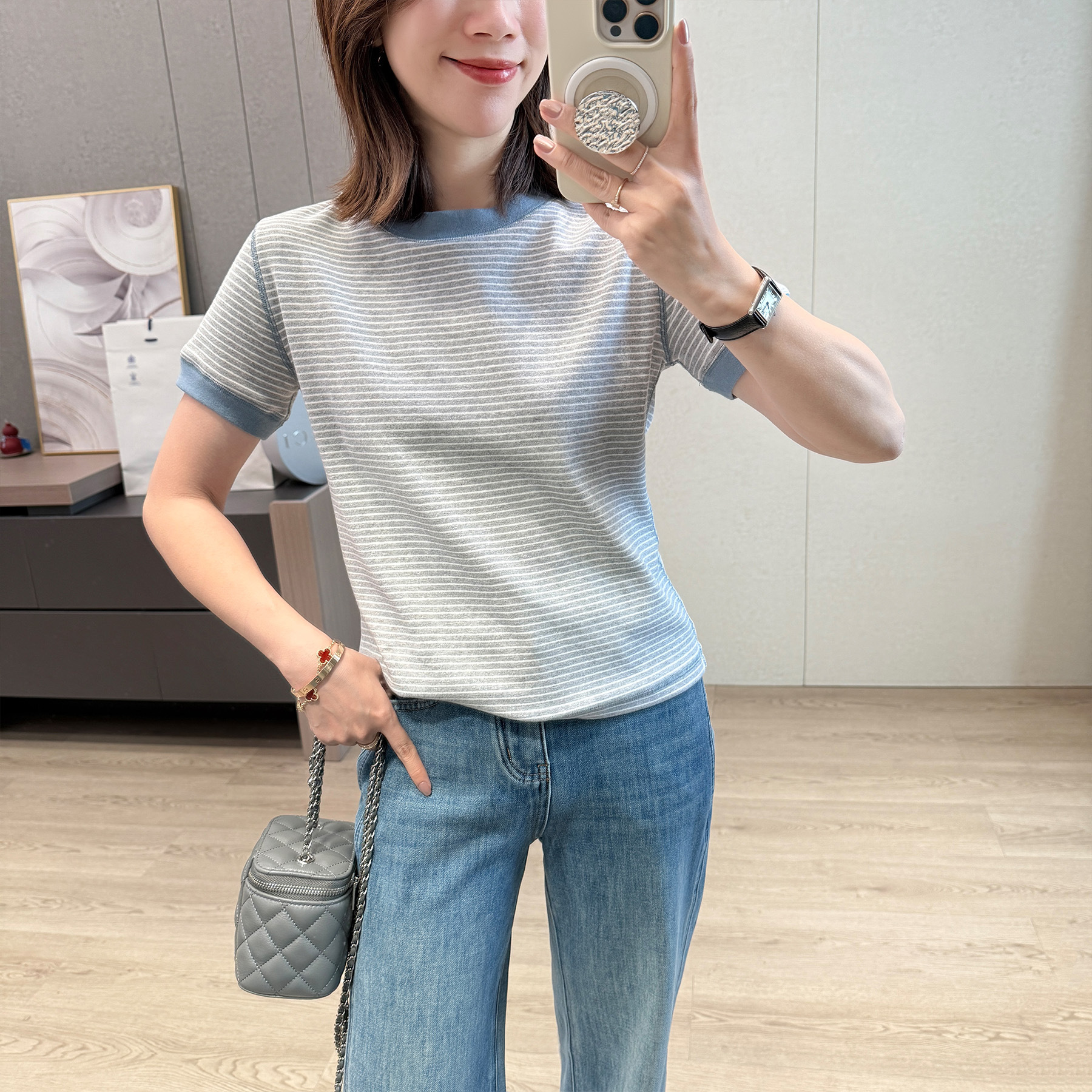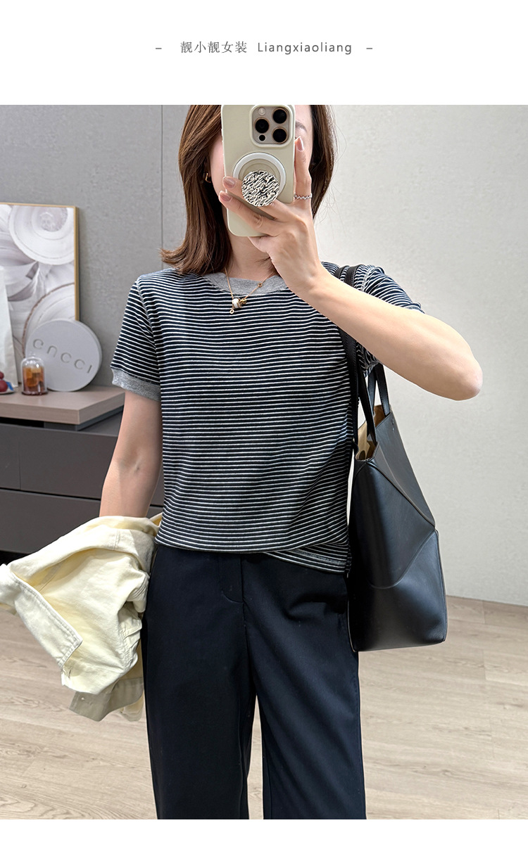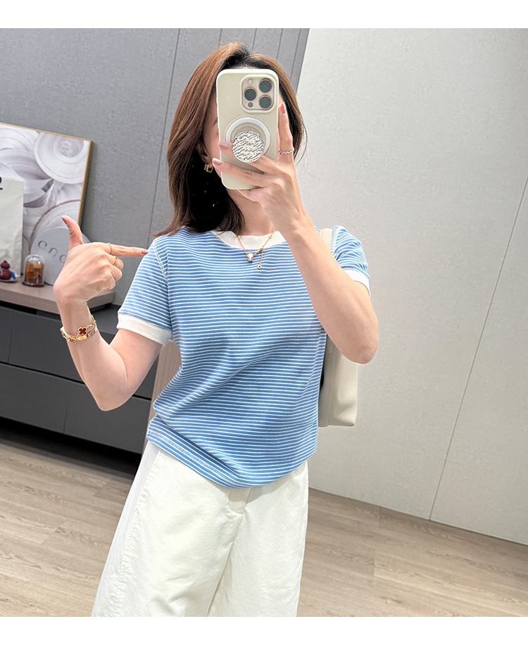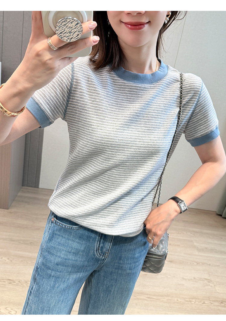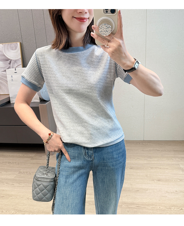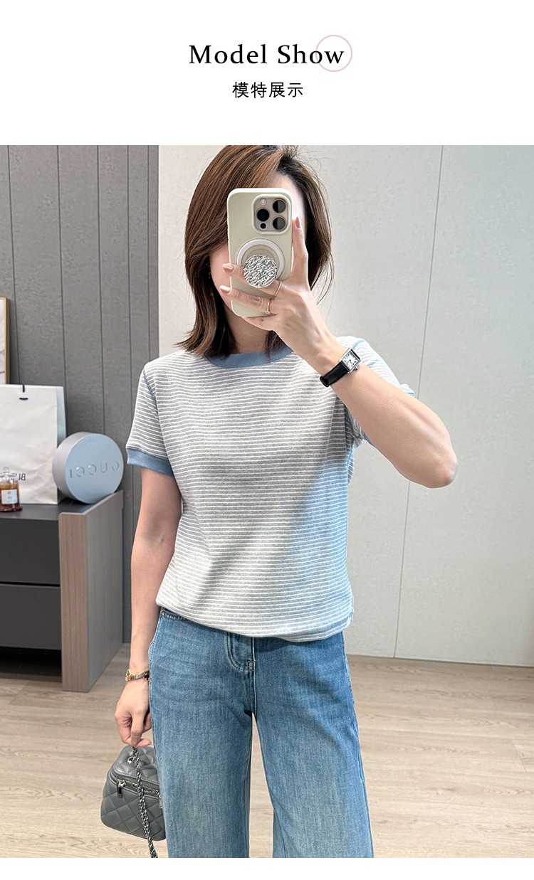 도니 DN 대비 색상 작은 줄무늬 화성 라인 짧은 소매 작은 티! 편안한 신장 면 둥근 목 짧은 어깨 탑스토어 가기